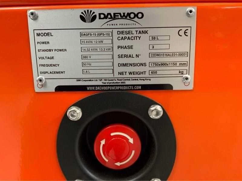 Ongebruikt , 3 fase motor R4 108IZD , 59liter dieseltank , frequency 50HZ , stand-power , stand-by power 14.52kva-13kw Nee Merk: Daewoo Type: Dagfs-15 Bouwjaar: 2025 Capaciteit.: 15.00kVA Aansluiting: 380V Motorcapaciteit: 12kW Generator type: 224GS Handboek aanwezig: true Machinegewicht: 650kg Totale afmeting L: 1700mm Totale afmeting Breedte: 900mm Totale afmeting Hoogte: 1150mm
