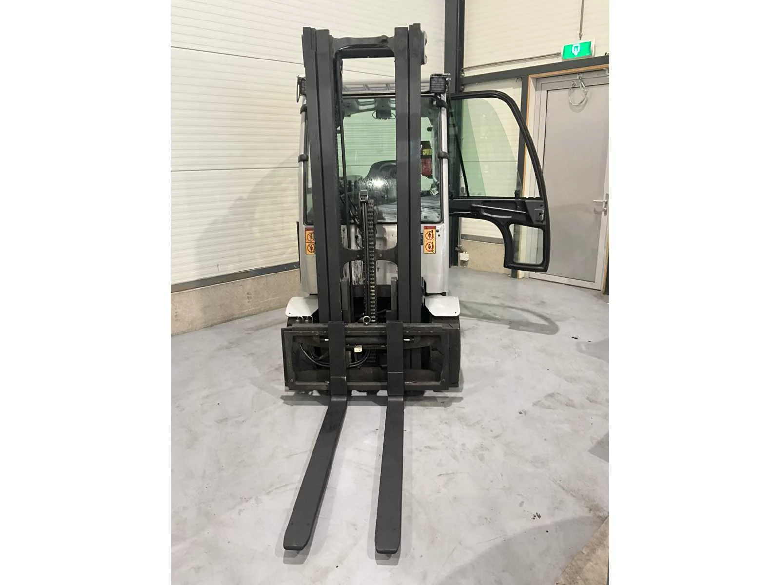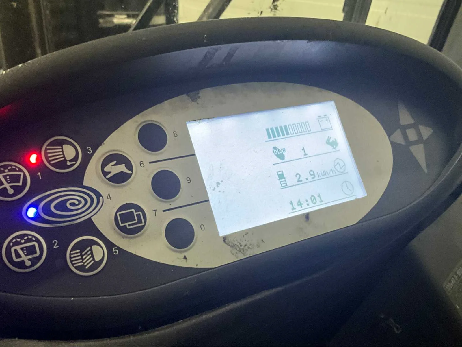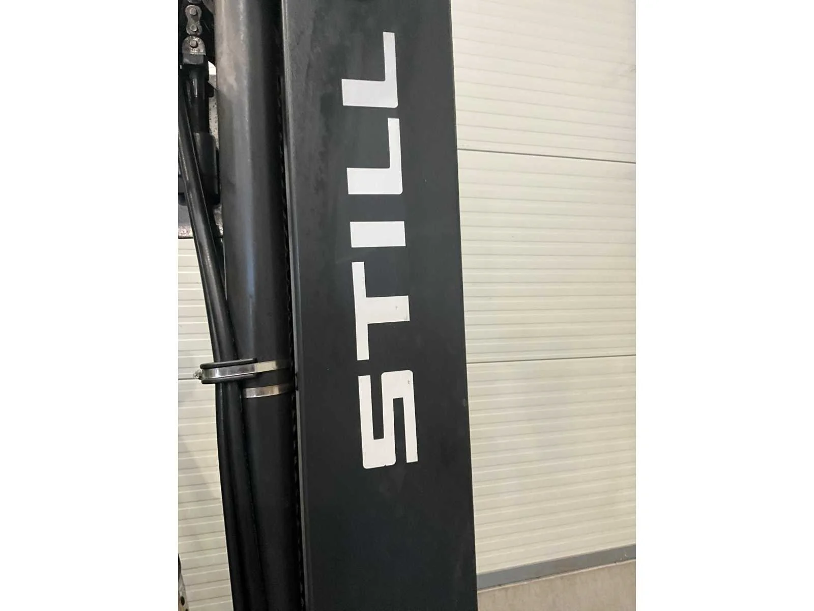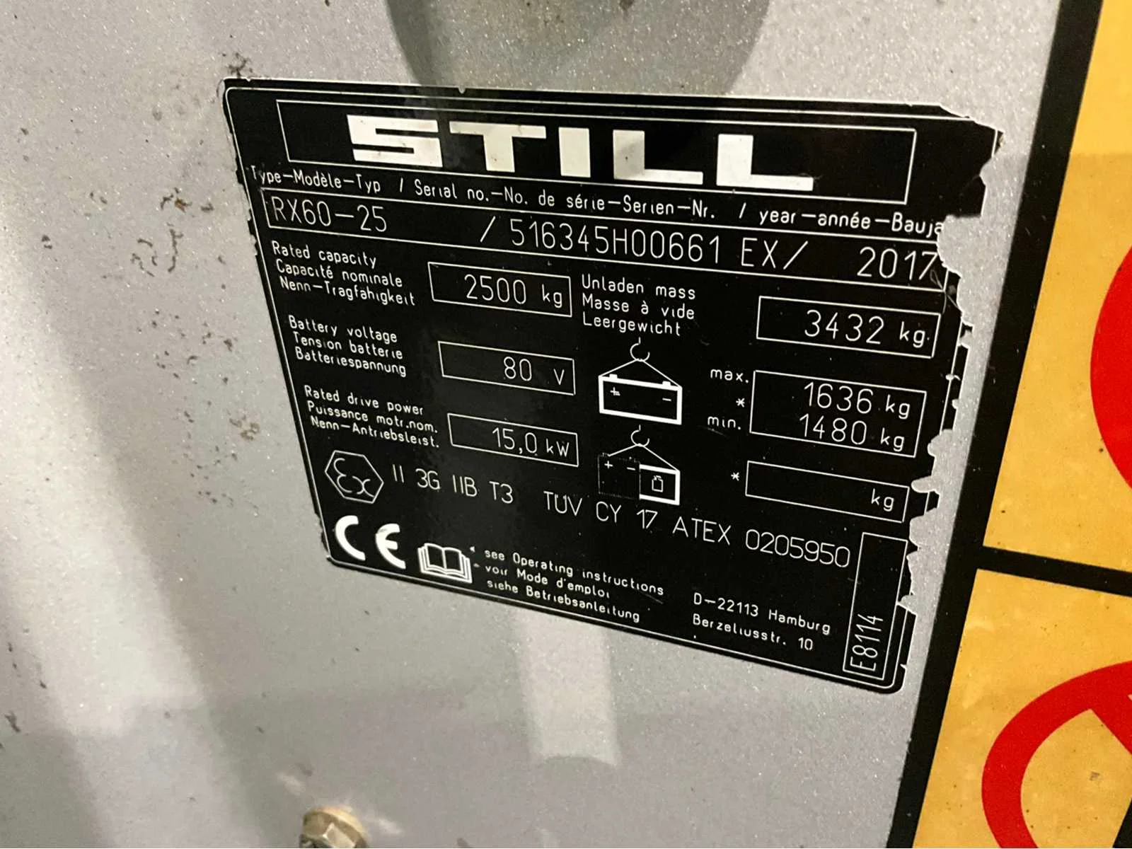 Extra opties : Volledige cabine , lepelversteller , rondom led verlichting , blue spot , joy stick , binnen verlichting , brandblusser Nee Merk: Still Type: RX 60-25 Bouwjaar: 2017 Serienummer: 516345H00661 Mast: Triple Soort band: Volrubber banden Aantal wielen: 4 Afgelezen urenstand: 7510 Free-lift: true Side-shift: true Hydraulisch verstelbare lepels: true Triple mast: true Eigen gewicht: 5068kg Hefvermogen: 2500kg Hefhoogte: 4900mm Vol rubber banden: true Totale afmeting L: 4120mm Totale afmeting Breedte: 1210mm