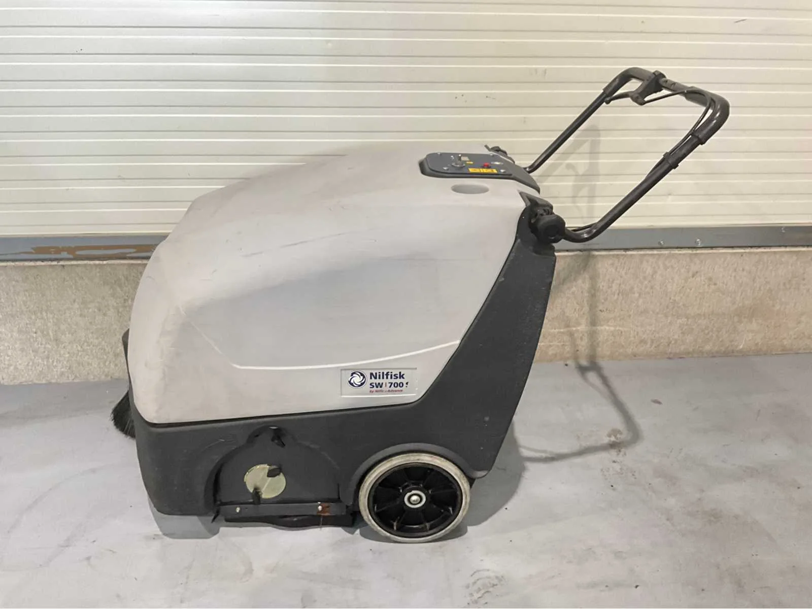 Afval container op wielen , Filterschudder , goed werkende machine , elektrisch aamgedreven Nee Merk: Nilfisk Type: SW700 S Werkbreedte: 700mm Elektrisch: true Aansluiting: 48V Eigen gewicht: 85kg Totale afmeting L: 1030mm Totale afmeting Breedte: 660mm Totale afmeting Hoogte: 810mm