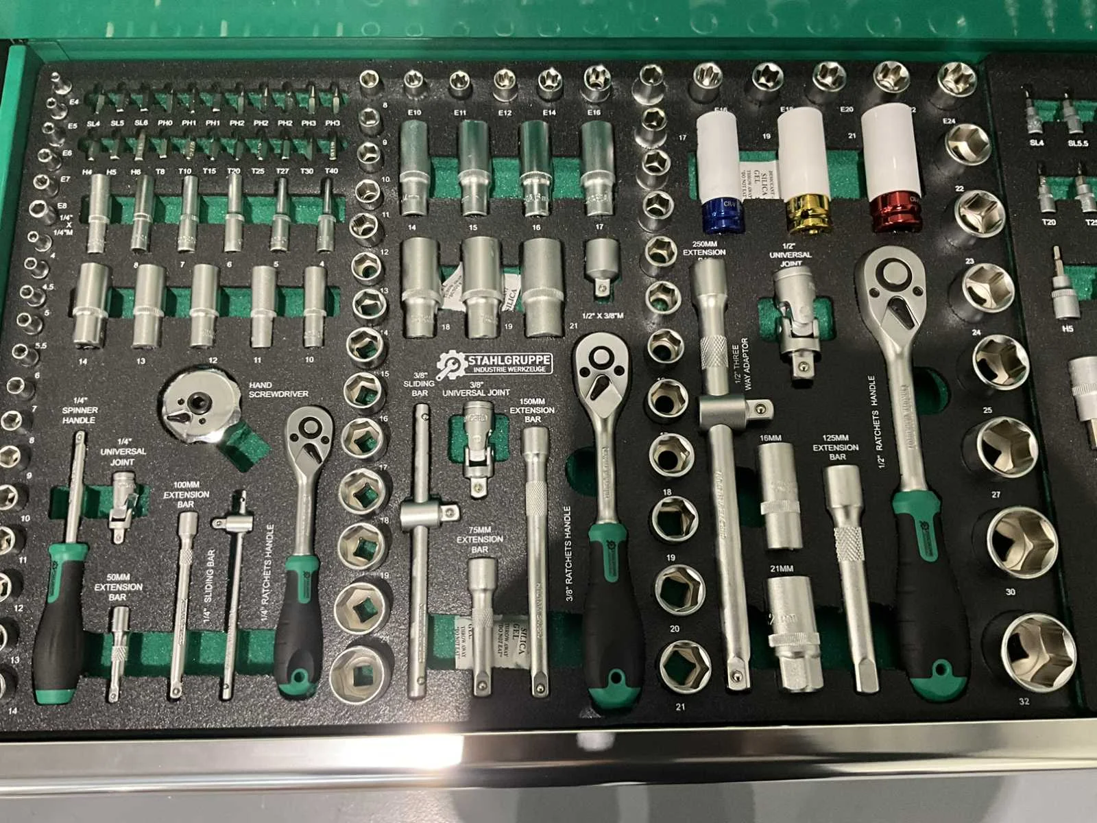 Ongebruikt 4 zwenkwielen rattelset en doppenset tot en met maat 50 386 st Heavy Duty gereedschapswagen gebruik: voor professionals aantal laden: 11 laden aantal gevulde laden: 9 gevulde laden gereedschap: chroom-vanadium gereedschap inhoud: 29-delige ring-steeksleutel set (6 mm - 50 mm) 3 ratelsleutel sets met doppen & bitsen (1/4”, 3/8” & 1/2”) 11-delige ring-ringsleutel set (6*7 mm - 30*32 mm) verstelbanre moersleutel 12-delige tangen set 2 hamers & 4 vijlen puntslag en beitel set 12 schroevendraaiers inbussleutels, Torxsleutels, precisiegereedschap 21-delige T-sleutelset 34-delige krachtdoppen set (12 mm - 50 mm) + Torx & inbus doppen & ratelsleutel 3/4,” LED-lamp, zaag, schaar, mes, meetgereedschappen enzovoort... in de originele verpakking Nee Merk: Jumbo Type: SG56 Pro Bouwjaar: 2025 Aantal laden: 11 Met inhoud: true Eigen gewicht: 201kg Totale afmeting L: 1480mm Totale afmeting Breedte: 520mm Totale afmeting Hoogte: 1110mm