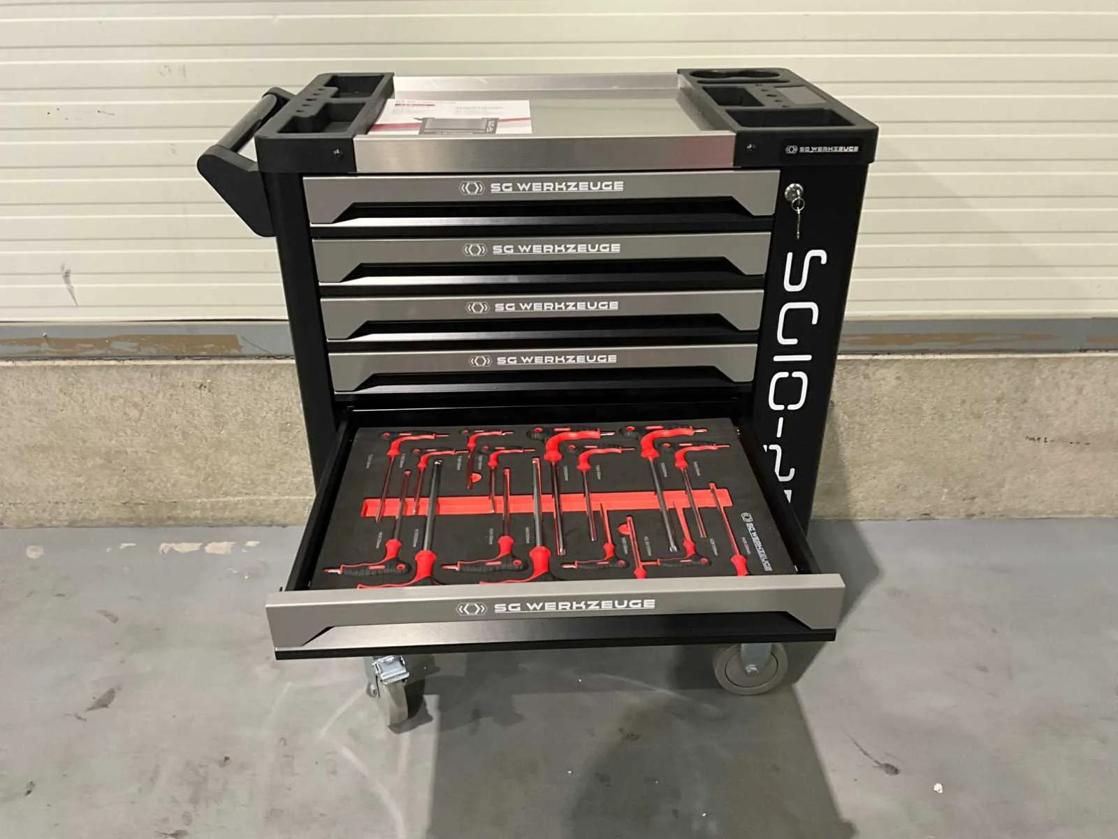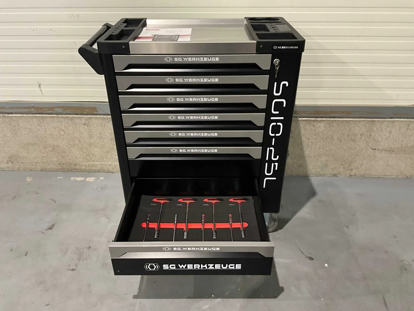 Ongebruikt , aan de zijkant zit een afsluitbaar gedeelte , met zwenkwielen Nee Merk: SG Werkzeuge Type: SG10-25L 258 PC Bouwjaar: 2025 Aantal laden: 7 Met inhoud: true Eigen gewicht: 78kg Totale afmeting L: 790mm Totale afmeting Breedte: 460mm Totale afmeting Hoogte: 990mm