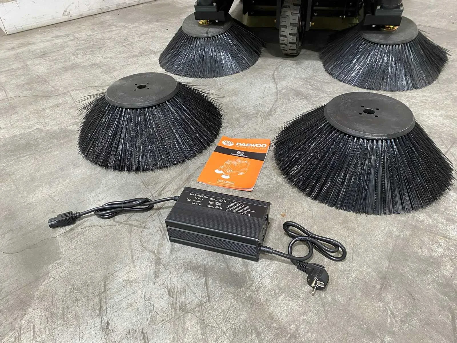 Aanvullende informatie Zelfrijdende veegmachine Merk: Daewoo Type: DAS80 Werkbreedte: 125 cm Opvangbak: 80 liter Voorzien van: Watertank en sproeisysteem Batterij: 48 volt / 65 Ah Werkduur: 2 tot 2,5 uur continu vermogen Maximum snelheid: 10 km/u Vermogen: 2 x 700 watt elektromotor Borstels: 2 zijborstels (⌀ 40 cm) & 1 middenborstel (⌀ 50 cm) Voorzien van: LED-verlichting & zwaailamp Zetel: Verstelbare zetel Inclusief: Acculader Inclusief: 2 reserve borstels Staat: Ongebruikt, in de originele verpakking Afmetingen: 160 x 125 x 130 cm Gewicht: 396 kg Nee Merk: Daewoo Type: DAS 80 Bouwjaar: 2025 Werkbreedte: 1250mm Elektrisch: true Accu lader: true Aansluiting: 48V Eigen gewicht: 396kg Totale afmeting L: 1600mm Totale afmeting Breedte: 1250mm Totale afmeting Hoogte: 1300mm