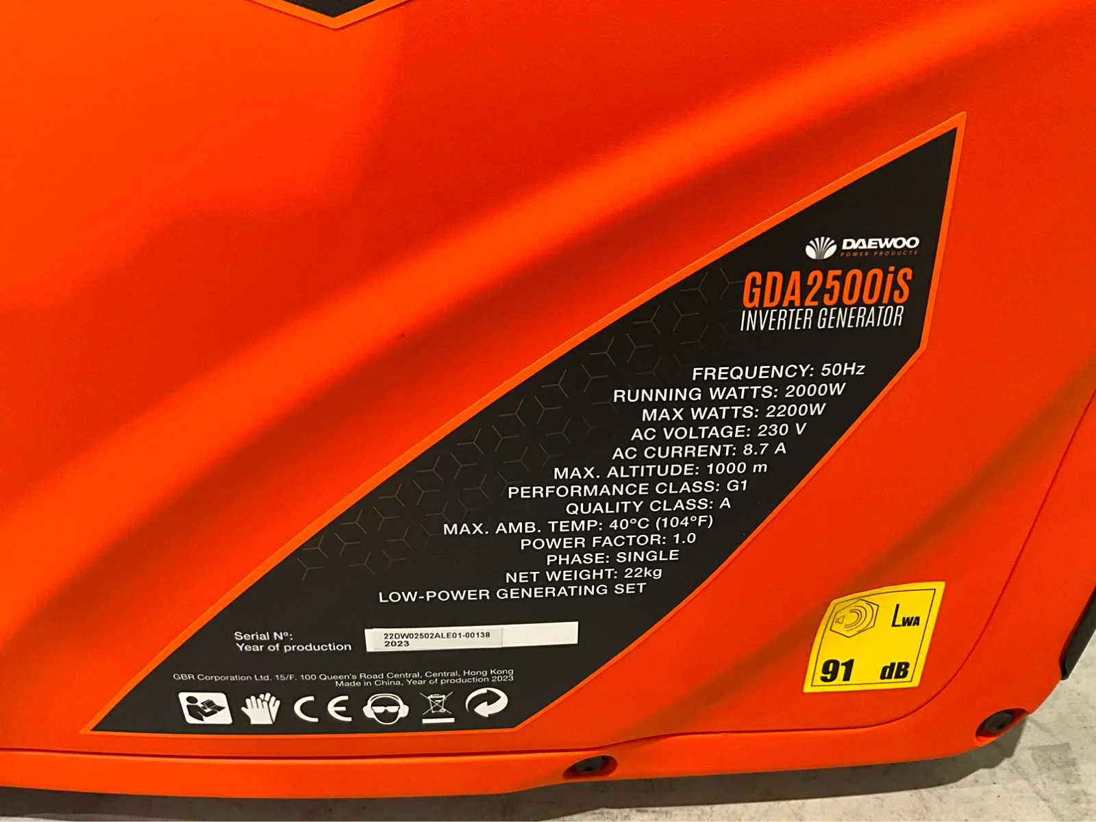 Ongebruikt , uitgangen 2 x 230V , usb 5v 1.0A/2.1A , 1 x 12V DC 8A , frequency 50HZ , running watts 2200W , AC current 15A , max altitude 1000m , performance class G1 , quality class A , max amb temp 40’c , power factor 1.0 , low power generation Nee Merk: Daewoo Type: GDA 2500 IS Bouwjaar: 2025 Afgelezen urenstand: 1 Handboek aanwezig: true Machinegewicht: 46kg Totale afmeting L: 550mm Totale afmeting Breedte: 320mm Totale afmeting Hoogte: 470mm
