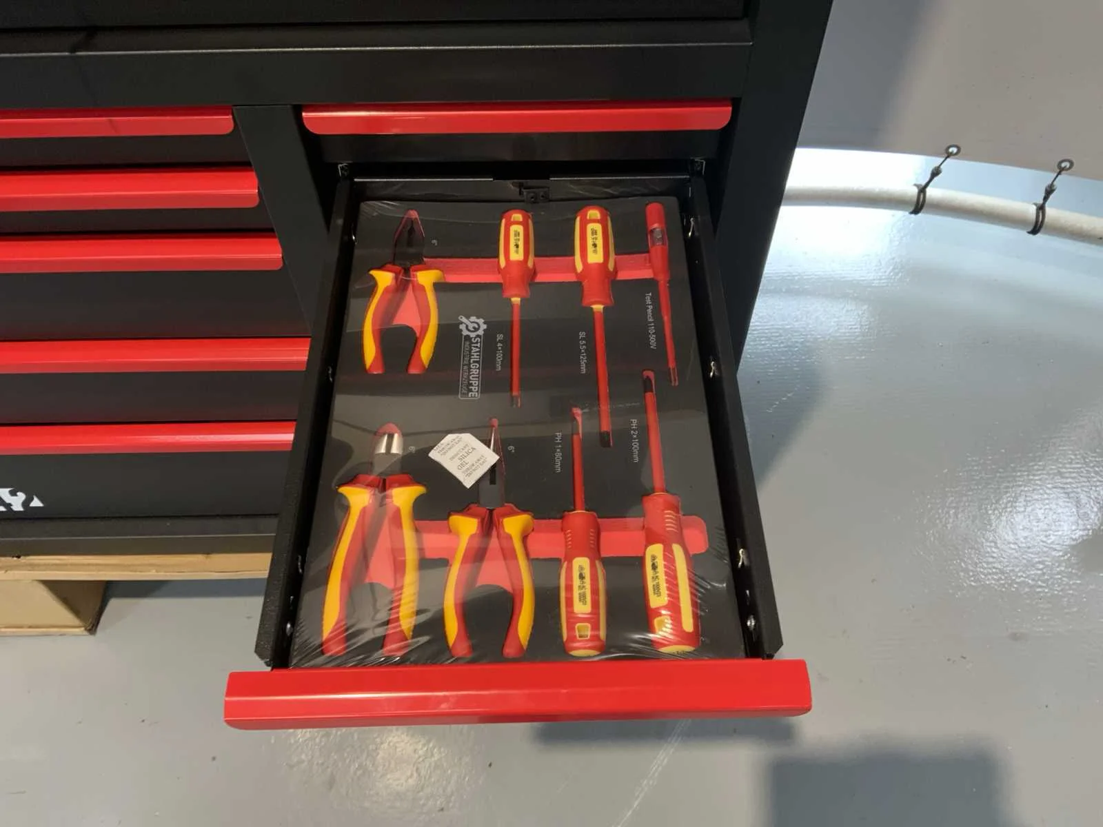 Ongebruikt , met zwenkwielen , 269 delige kist met achterwand en 2 opbergkastjes met sleutels Nee Merk: Stahlgruppe Type: SG11 + achterwand Bouwjaar: 2025 Aantal laden: 11 Met inhoud: true Eigen gewicht: 130kg Totale afmeting L: 1060mm Totale afmeting Breedte: 480mm Totale afmeting Hoogte: 1150mm