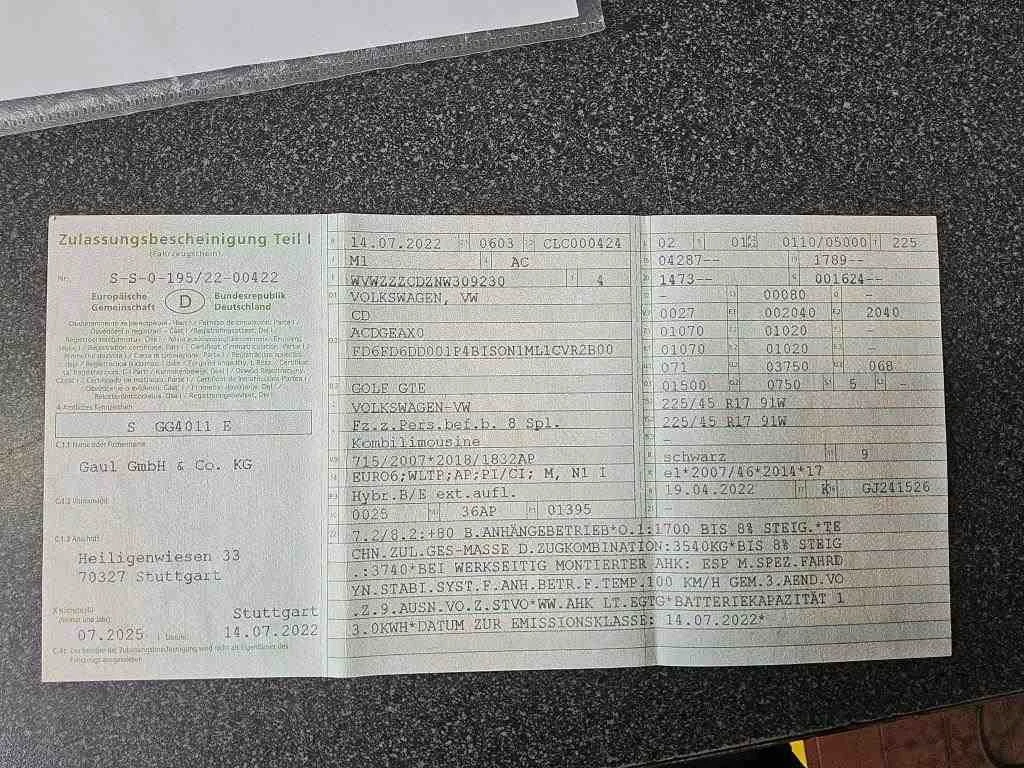 Duitse kenteken papieren. Indien gewenst kunnen wij het gehele import proces voor u verzorgen, RDW invoer, BPM taxatie, Douane afwikkeling, stalling etc. Voor deze auto zijn de totale invoerkosten inclusief de BPM €1.195.- Dus voor €1.195.- boven op uw aankoopprijs verzorgen wij het NL kenteken voor u. (This option is only for Dutch buyers) Voor vragen kunt u mailen naar info@auto-auctions.nl No Kenteken: Duitse kenteken papieren Merk: Volkswagen Model: Golf Type: GTE 1.4 eHybrid PHEV Afgelezen kilometerstand: 117583km Cilinderinhoud: 1395cc Vermogen (kW): 180kW Brandstof: Hybride Benzine Chassisnummer: WVWZZZCDZNW309230 Datum eerste toelating: 14-07-2022 Vermogen (pk): 245hp Aantal zitplaatsen: 5 Kleur: Deep Black Pearl Effect Transmissie: Automaat Aantal deuren: 5 Aantal sleutels: 2 Velgmaat: 17 Aantal cilinders: 4 Carrosserie: Hatchback Nationaliteit documenten: Duitse kenteken papieren Onderhoudshistorie: Digitaal volledig aanwezig Start en rijdt: Ja oplaadkabel : Aanwezig