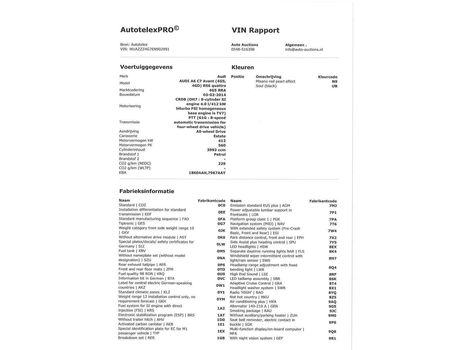 Voor vragen kunt u mailen naar info@auto-auctions.nl No Kenteken: SN-038-X Merk: Audi Model: A6 Avant Type: 4.0 TFSI RS6 quattro Pro Line Plus Afgelezen kilometerstand: 179794km Cilinderinhoud: 3993cc Vermogen (kW): 412kW Brandstof: Benzine Chassisnummer: WAUZZZ4G7EN902991 NAP status: Geen oordeel Datum eerste toelating: 2014-02-11 Datum eerste toelating (NL): 2018-05-11 APK vervaldatum: 2026-05-24 Vermogen (pk): 560hp Aantal zitplaatsen: 4 Kleur: rood Transmissie: Automaat Emissieklasse: 5 Aantal deuren: 4 Aantal sleutels: 1 Ledig gewicht: 1910kg Bruto BPM (NL): 19381€ Rest BPM: 2761€ Aantal cilinders: 8 Carrosserie: stationwagen Carfax Link: https://was.carfax.eu/v0/api/ccdid/5100016408/svc/201/vinreg/SN038X/checksum/eyJhbGciOiJIUzI1NiIsInR5cCI6IkpXVCJ9.eyJleHAiOjE3NjI2MTE1OTV9.YmR_8O6FJSu8bij6RfQq_3reAmNGF7UQJjKHq_ugiS4 Start en rijdt: Ja