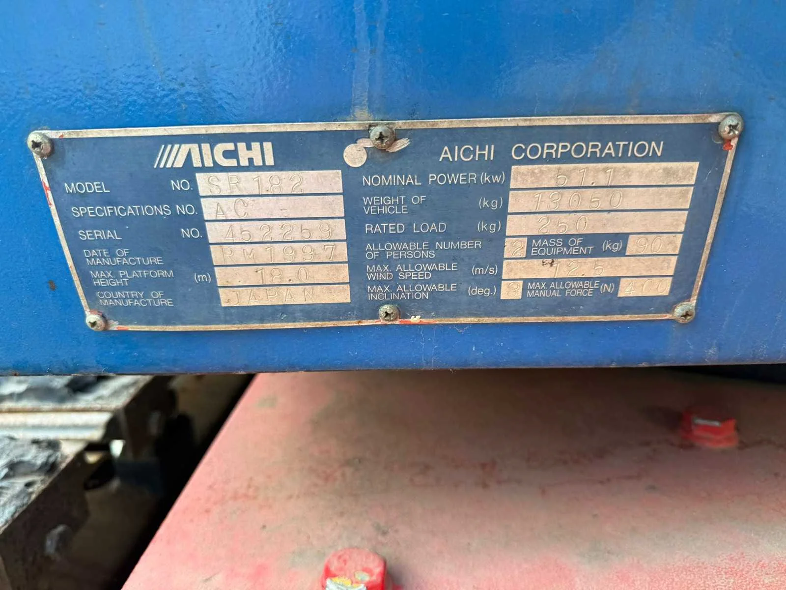 Nee Merk: Aichi Type: SR 182 Bouwjaar: 1996 Diesel: true Telescoop hoogwerker: true Werkhoogte: 20000mm Platform capaciteit: 250kg Eigen gewicht: 13050kg