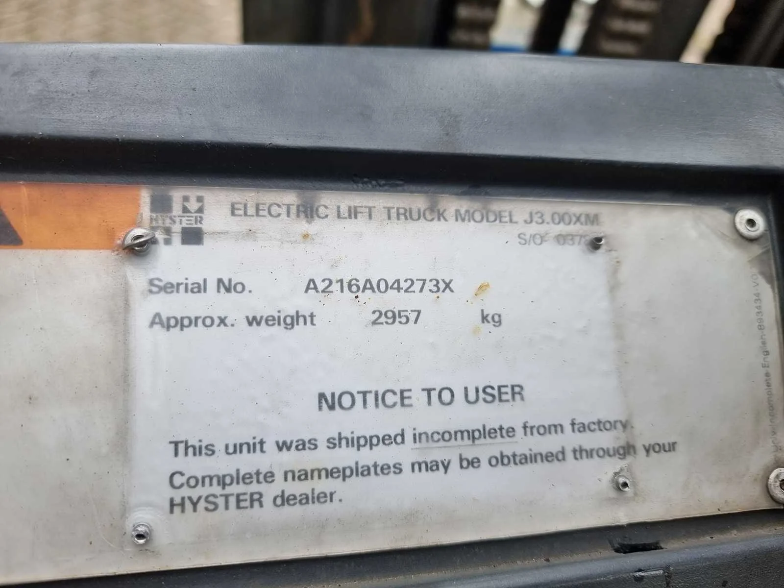 Werking onbekend Nee Merk: Hyster Type: J3.00XM Brandstof: Elektrisch Mast: Triplex Aantal wielen: 4 Accu lader: true Free-lift: true Triple mast: true Eigen gewicht: 5045kg Hefvermogen: 3000kg Lepellengte: 1200mm Hefhoogte: 5330mm Totale afmeting L: 3420mm Totale afmeting Breedte: 1190mm Totale afmeting Hoogte: 3050mm