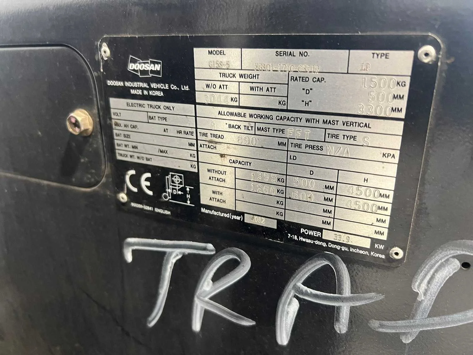 Bezichtiging alleen op afspraak!! Nee Merk: Doosan Type: G15S-5 Bouwjaar: 2013 Brandstof: LPG Aantal wielen: 4 Afgelezen urenstand: 7236 Free-lift: true Side-shift: true Triple mast: true Eigen gewicht: 3800kg Hefvermogen: 1500kg Lepellengte: 1200mm Hefhoogte: 4700mm Vol rubber banden: true Totale afmeting L: 1900mm Totale afmeting Breedte: 1100mm Totale afmeting Hoogte: 2100mm LPG: true