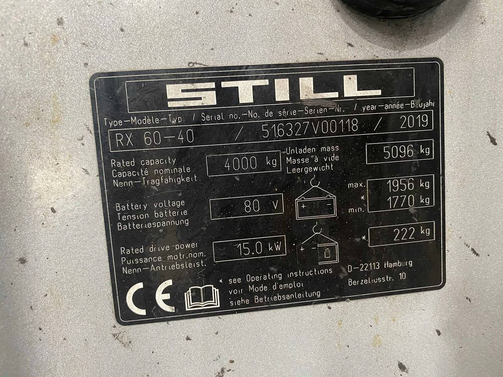 Bezichtiging op afspraak!!! Nee Merk: Still Type: RX60-40 Bouwjaar: 2019 Brandstof: Elektrisch Mast: Triplex Aantal wielen: 4 Afgelezen urenstand: 8028 Accu lader: true Free-lift: true Side-shift: true Triple mast: true Eigen gewicht: 6477kg Hefvermogen: 4000kg Lepellengte: 1200mm Hefhoogte: 4750mm Vol rubber banden: true Totale afmeting L: 2950mm Totale afmeting Breedte: 1250mm Totale afmeting Hoogte: 2340mm