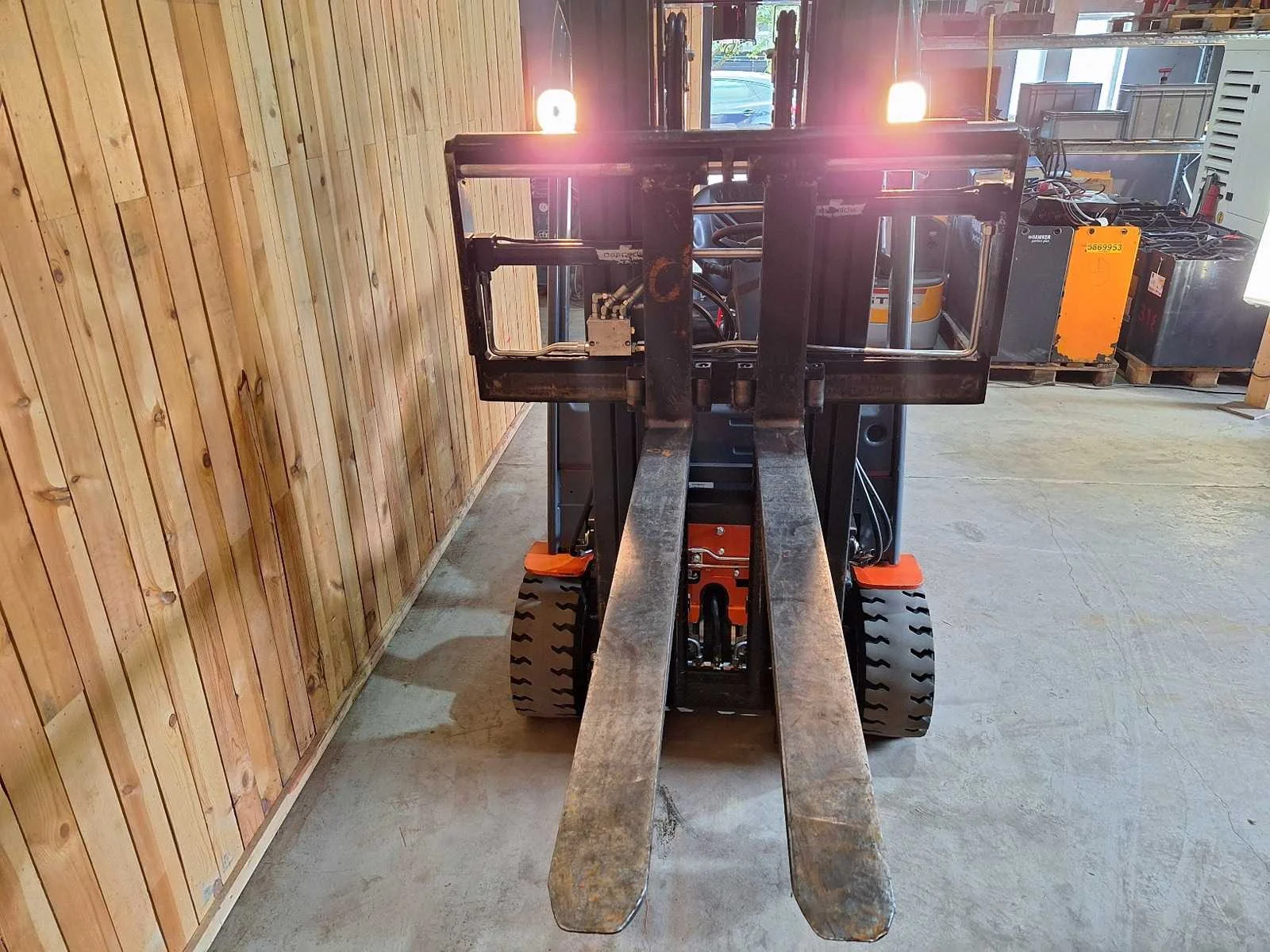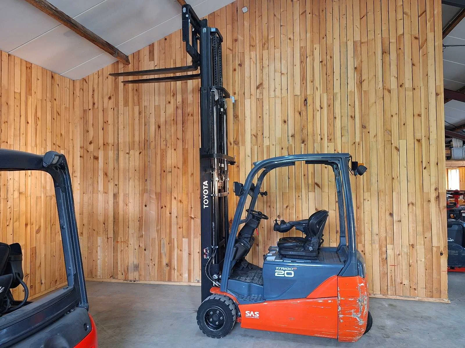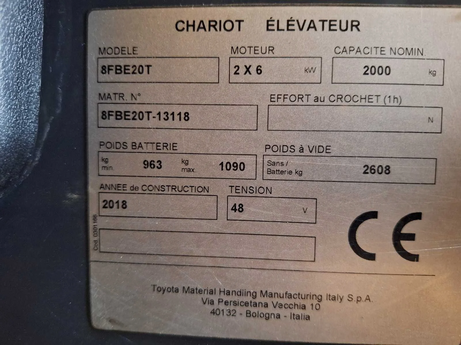 Maakt geluid in aandrijving Bezichtiging enkel op afspraak! Nee Merk: Toyota Type: 8 FBE 20T Bouwjaar: 2018 Serienummer: 13118 Brandstof: Elektrisch Aantal wielen: 3 Afgelezen urenstand: 2949 Free-lift: true Side-shift: true Hydraulisch verstelbare lepels: true Triple mast: true Eigen gewicht: 3750kg Hefvermogen: 2000kg Lepellengte: 1200mm Hefhoogte: 4700mm Vol rubber banden: true Totale afmeting L: 2050mm Totale afmeting Breedte: 1150mm Totale afmeting Hoogte: 2180mm