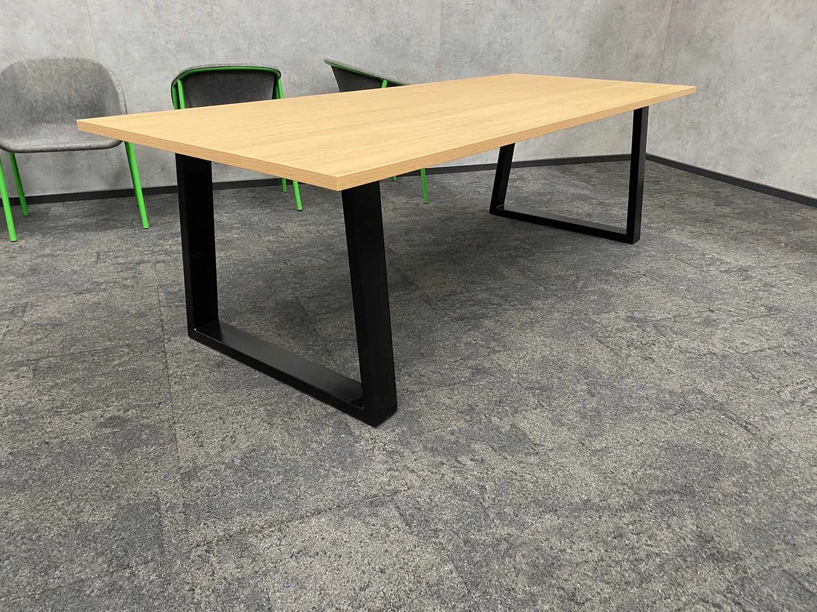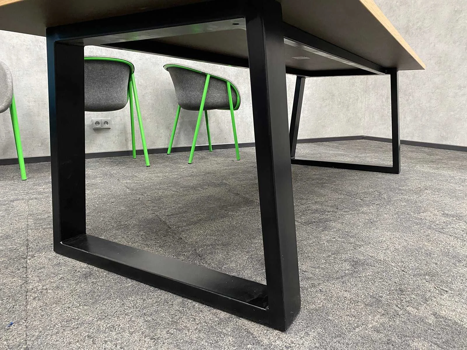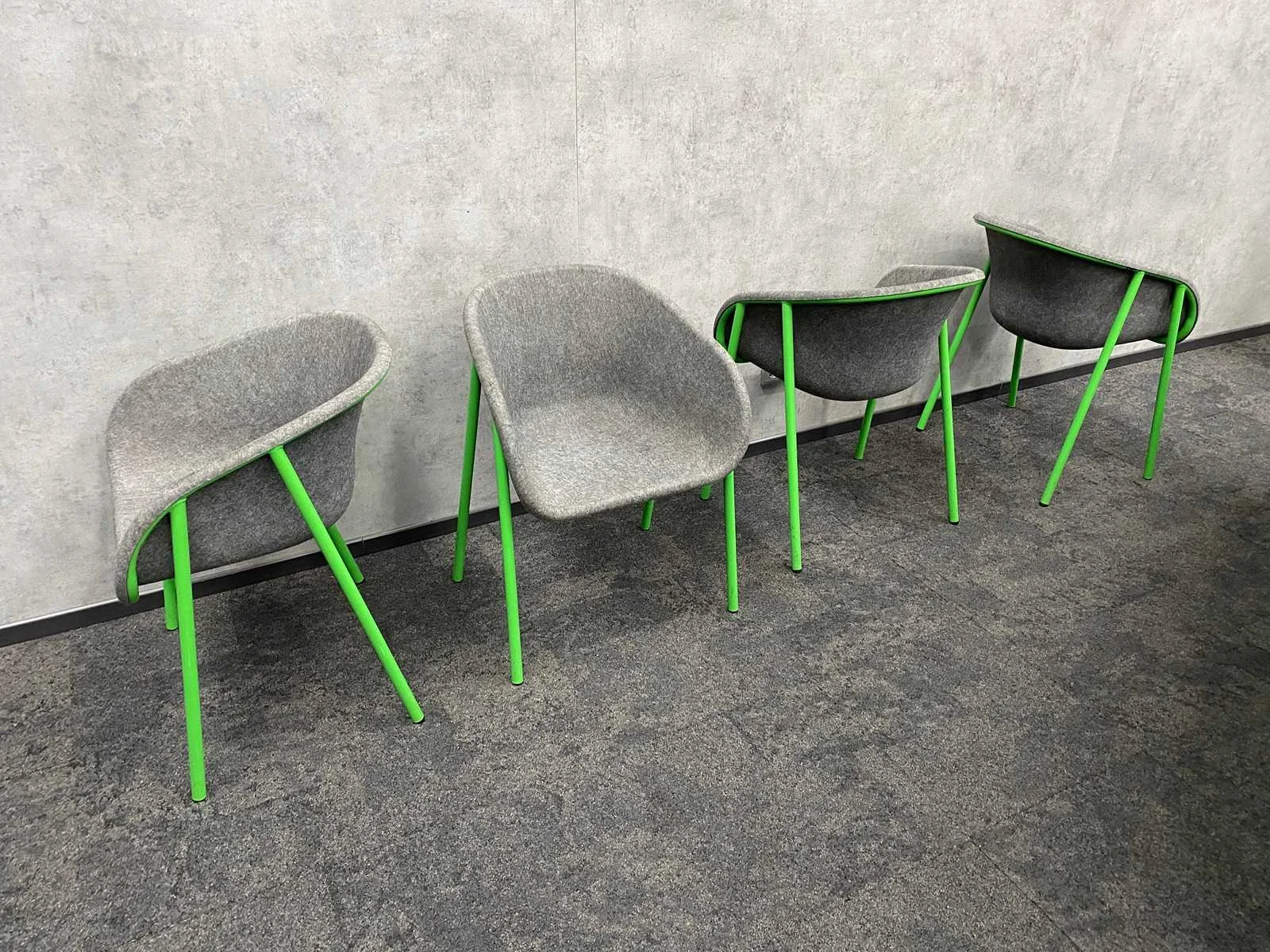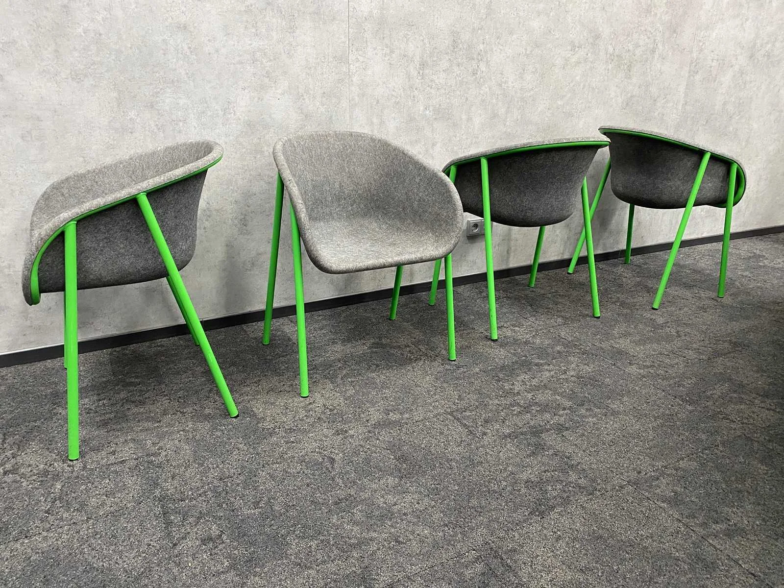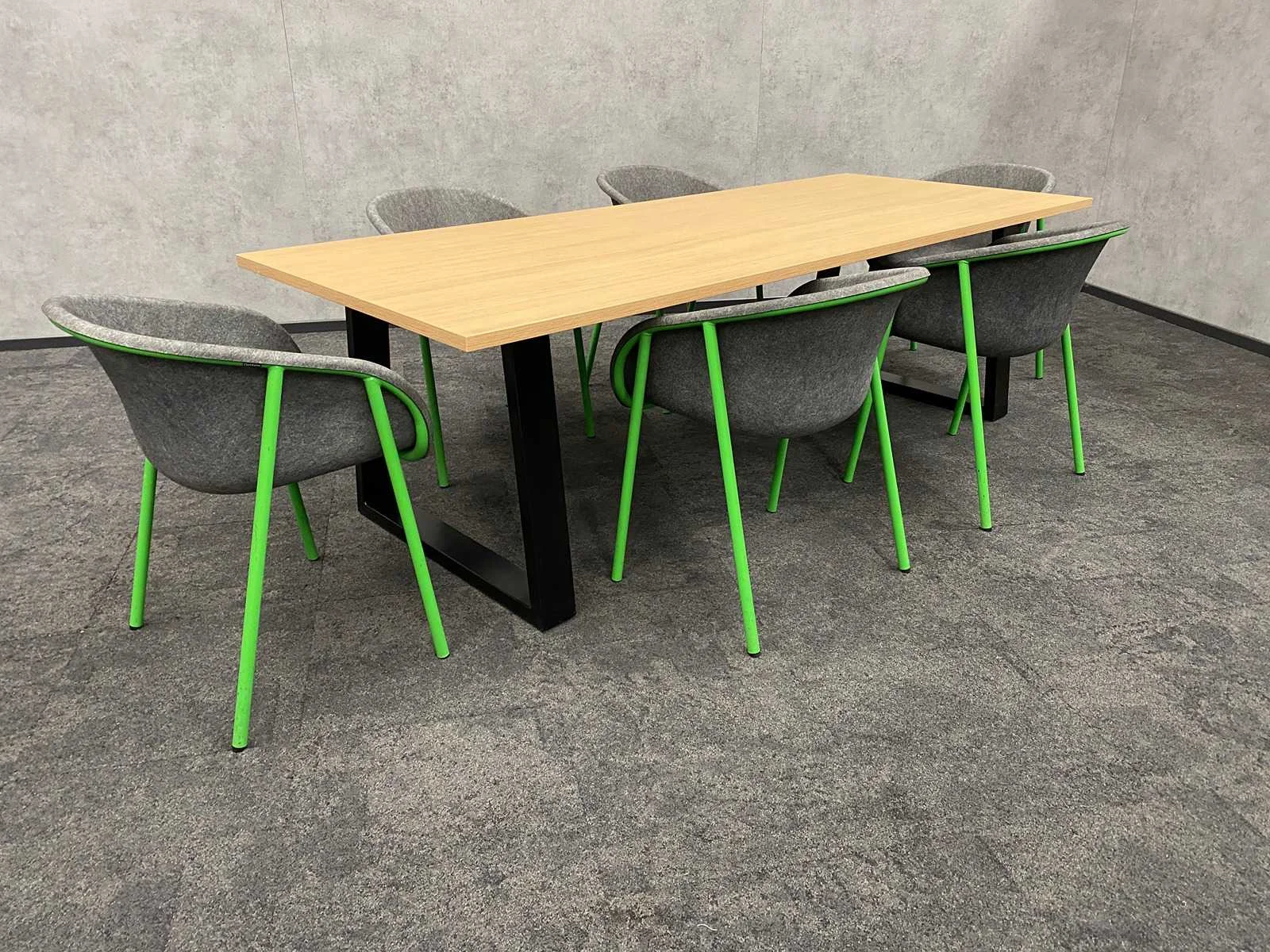 Kavel bestaande uit 6x design stoelen gemaakt van gerecycled PET-vilt (plastic flessen) en hoogwaardig staal. -- 1x conferentietafel v.v. zwart stalen frame en eikenkleurig melamine tafelblad. Nee Merk: DeVorm Kleur: groen, grijs, zwart, eiken Lengte: 250cm Breedte: 100cm Hoogte: 75cm Zithoogte: 45cm