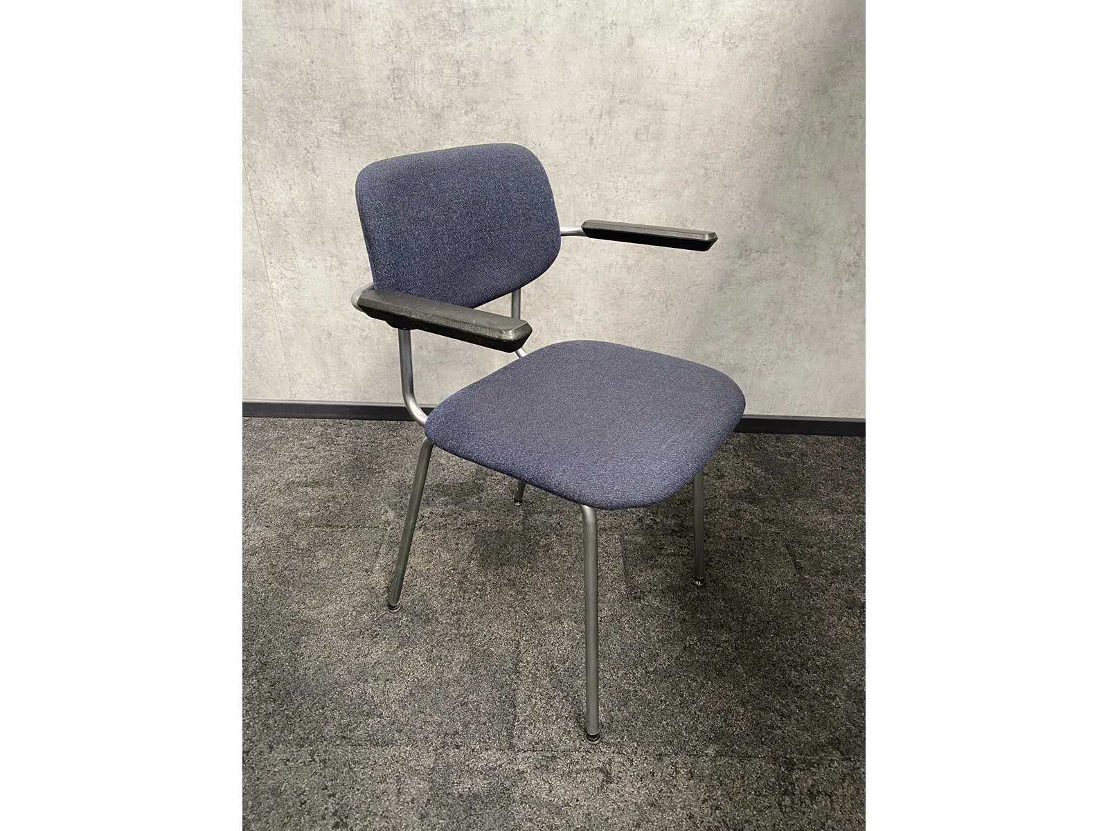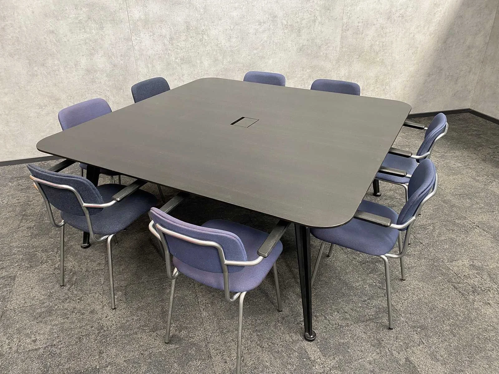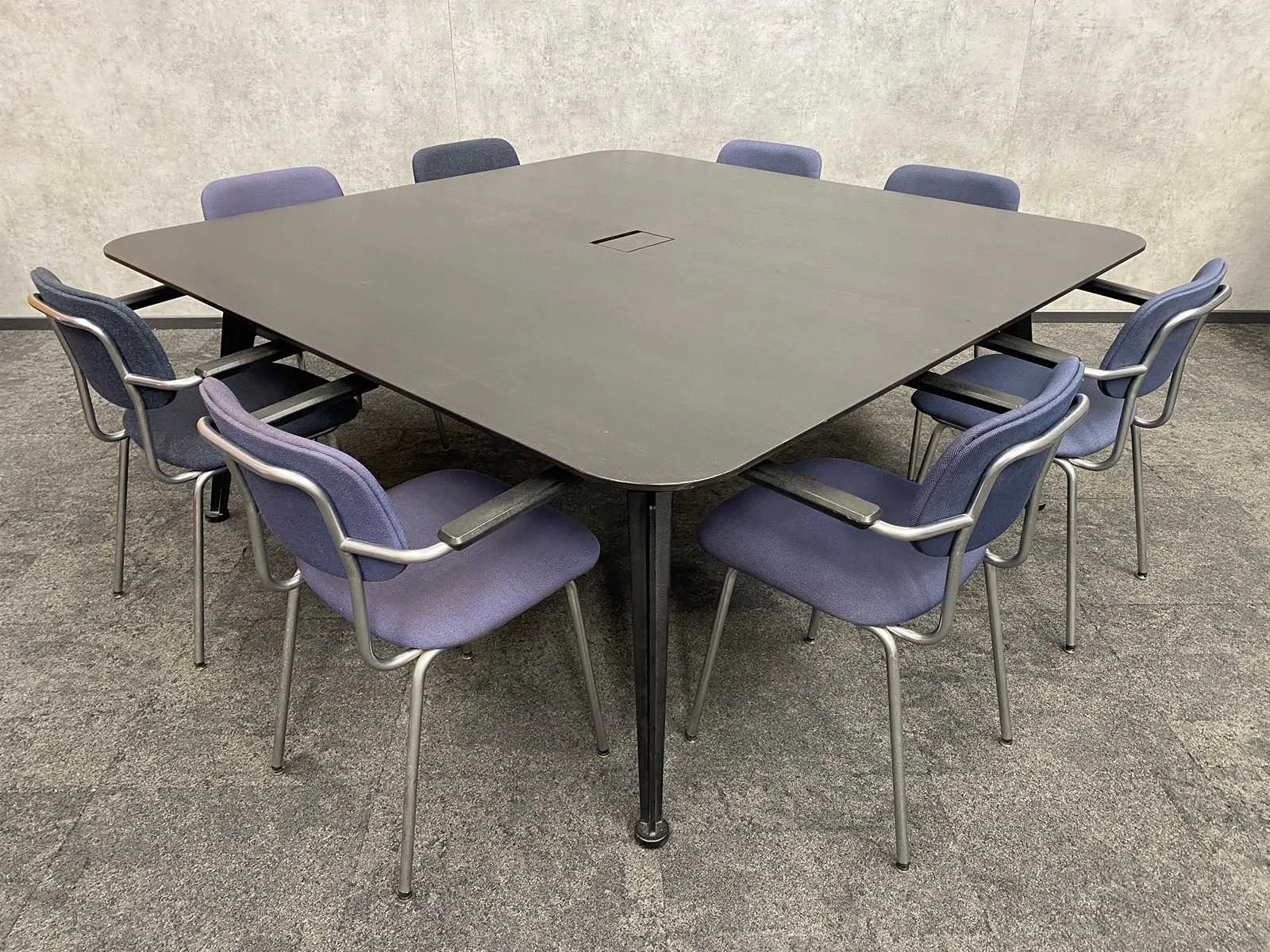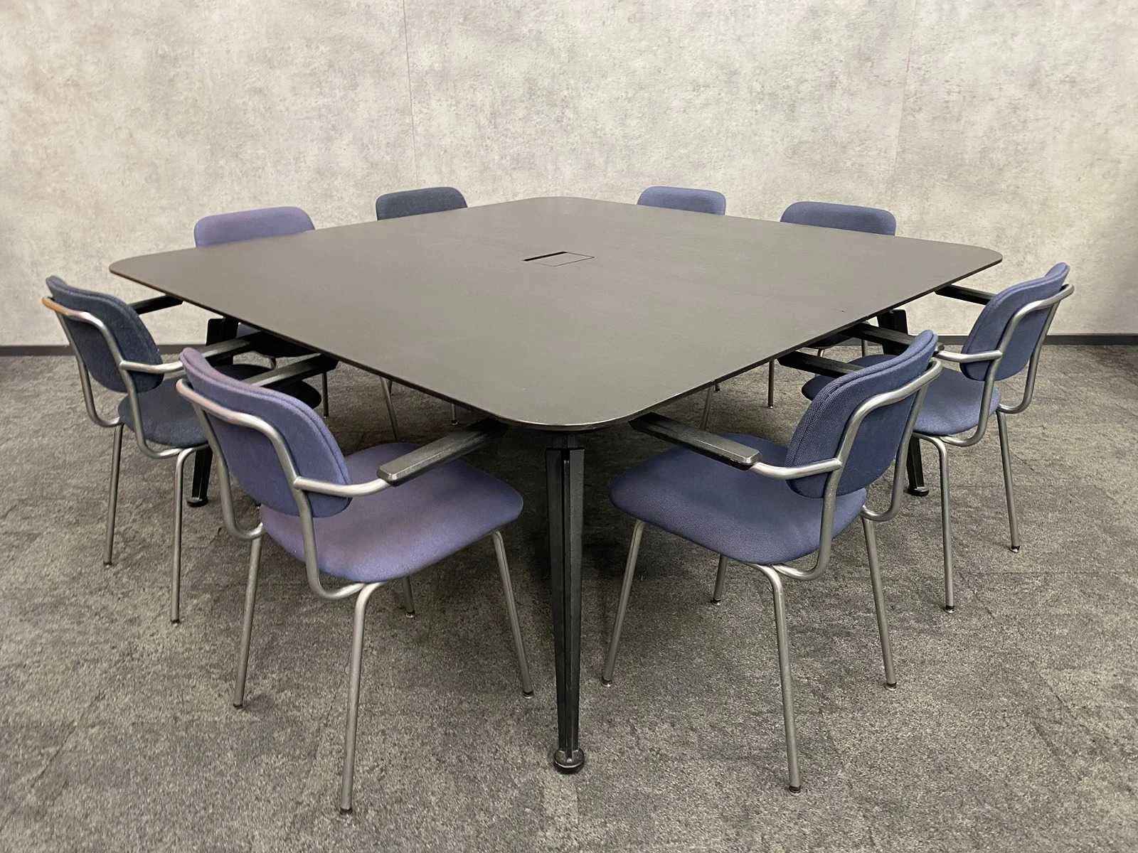 Kavel bestaande uit 1x CASE01 design tafel v.v. in hoogte instelbaar frame. --- 8x Gipsen 1235 design stoel. let op 3 diverse kleuren blauw. Nee Merk: CASE01/ Gispen Lengte: 180cm Breedte: 180cm Hoogte: 74cm