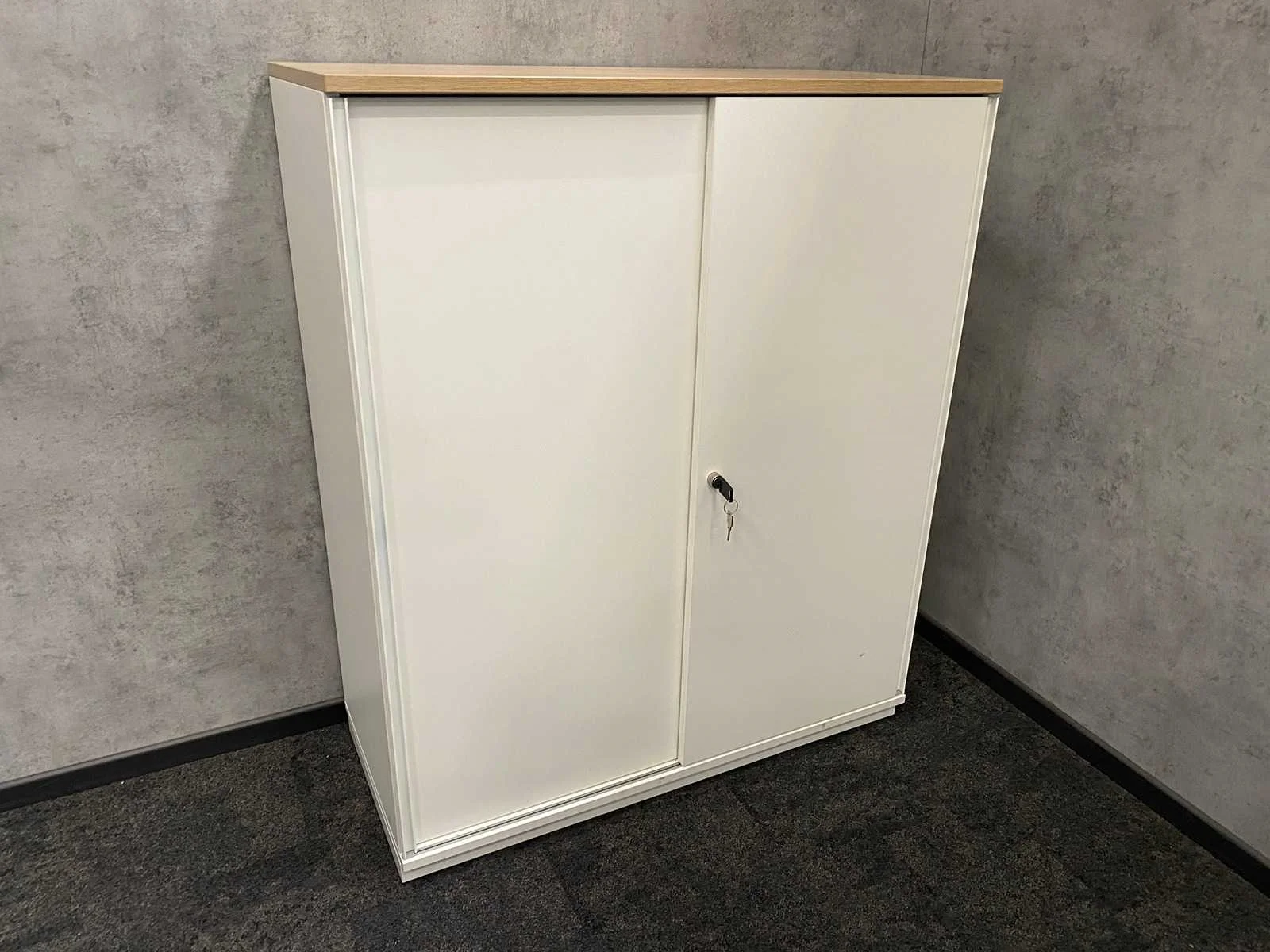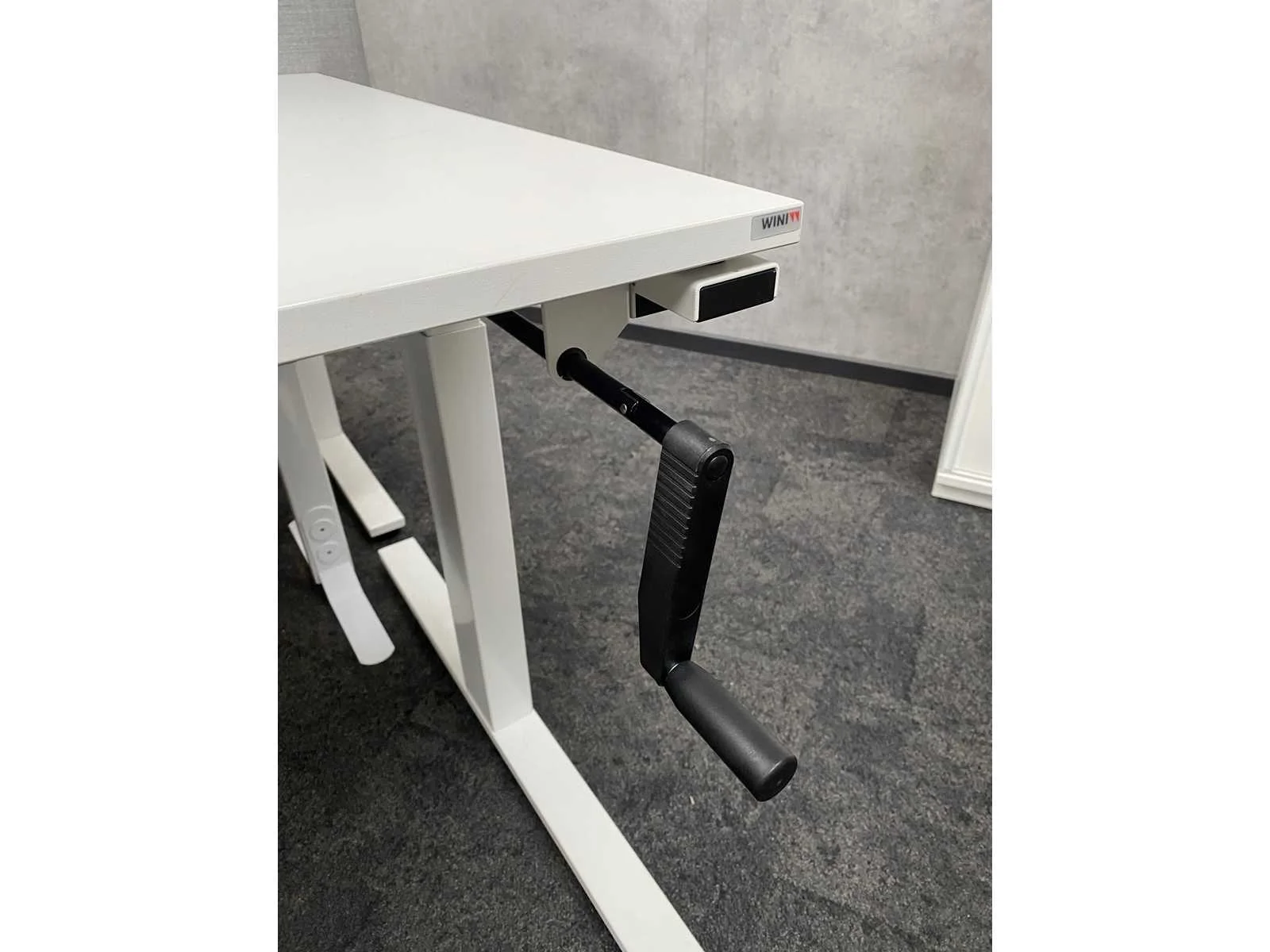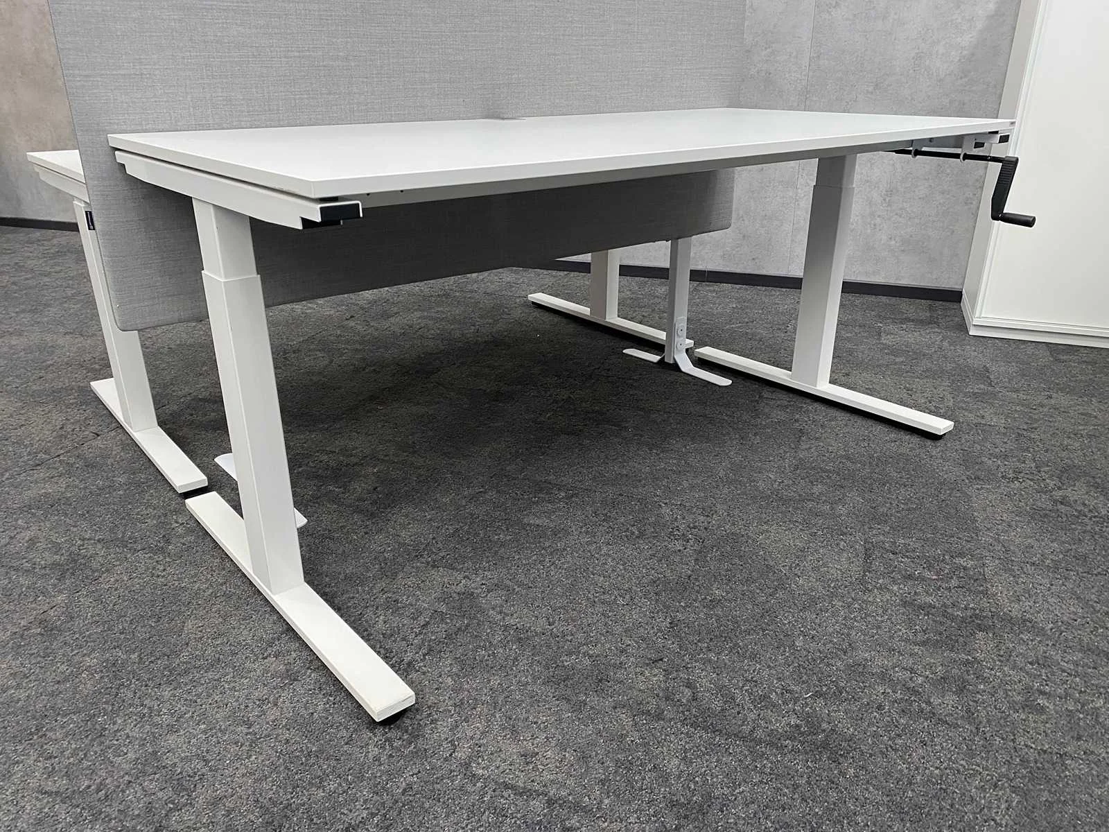 Kavel bestaande uit 2x Wini zit-zit slinger bureau met draadgoot. Afm. ca. 160x80 cm. ---- 1x Götessons grijs akoestische scheidingswand op voet. ---- 1x Wini melamine opbergkast. Afm. ca. hxbxd 81x60x45 cm. met 1`verstelbaar legbord, zonder sleutel, 1x Wini melamine opbergkast met sleutel en 4 verstelbare legborden. Afm. ca. hxbxd 120x100x45 cm. Nee Merk: Wini Slingerbureau: true