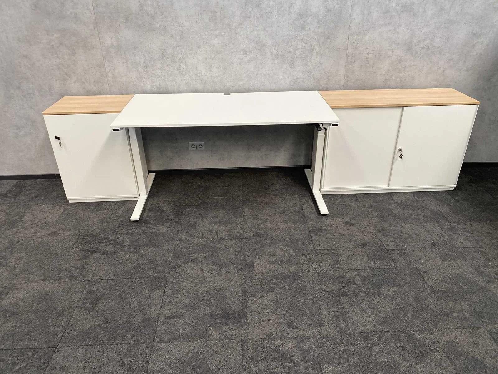 Kavel bestaande uit 1x Wini zit-zit slinger bureau met draadgoot. Afm. ca. 160x80 cm. ---- 1x Wini melamine opbergkast. Afm. ca. hxbxd 82x60x45 cm. met 1`verstelbaar legbord, met sleutel ---- 1x Wini melamine opbergkast. Afm. ca. hxbxd 82x120x45 cm. v.v. 2 verstelbare legborden, met sleutel Nee Merk: Wini Slingerbureau: true
