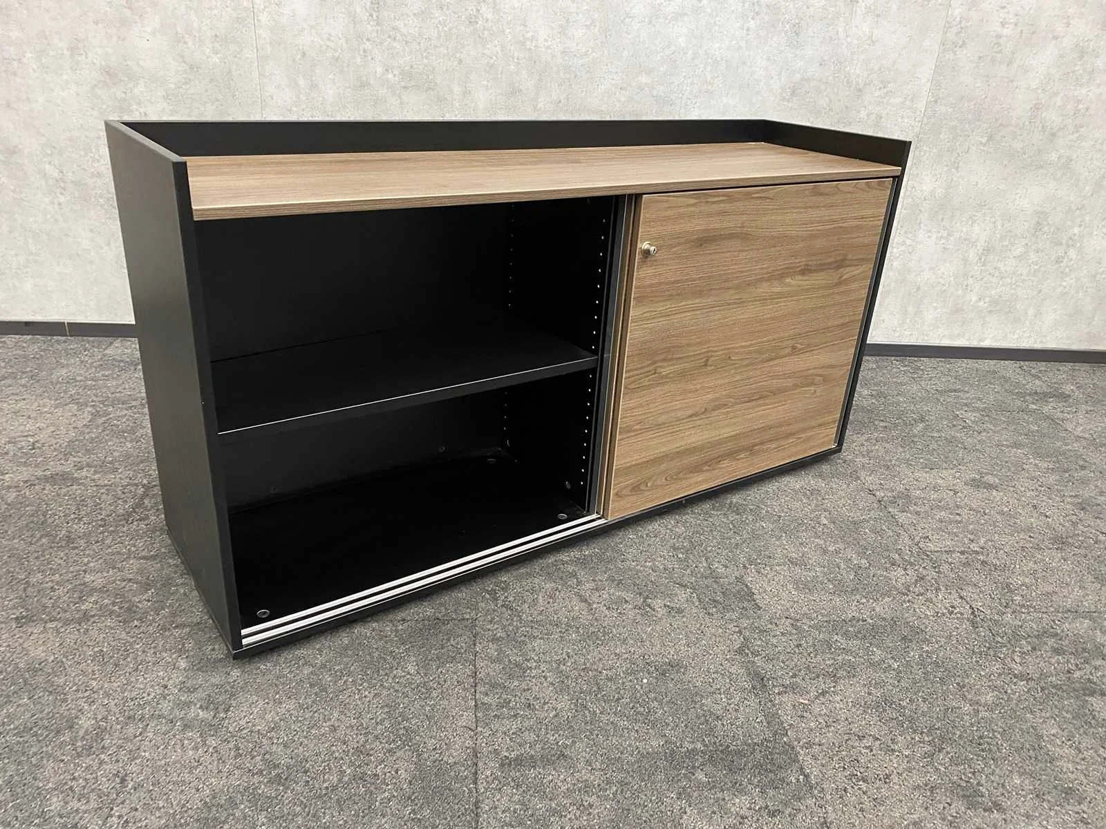 Met 2 verstelbare legborden, zonder sleutel Nee Kleur: zwart, noten Breedte: 160cm Hoogte: 83cm Diepte: 45cm Materiaal: melamine