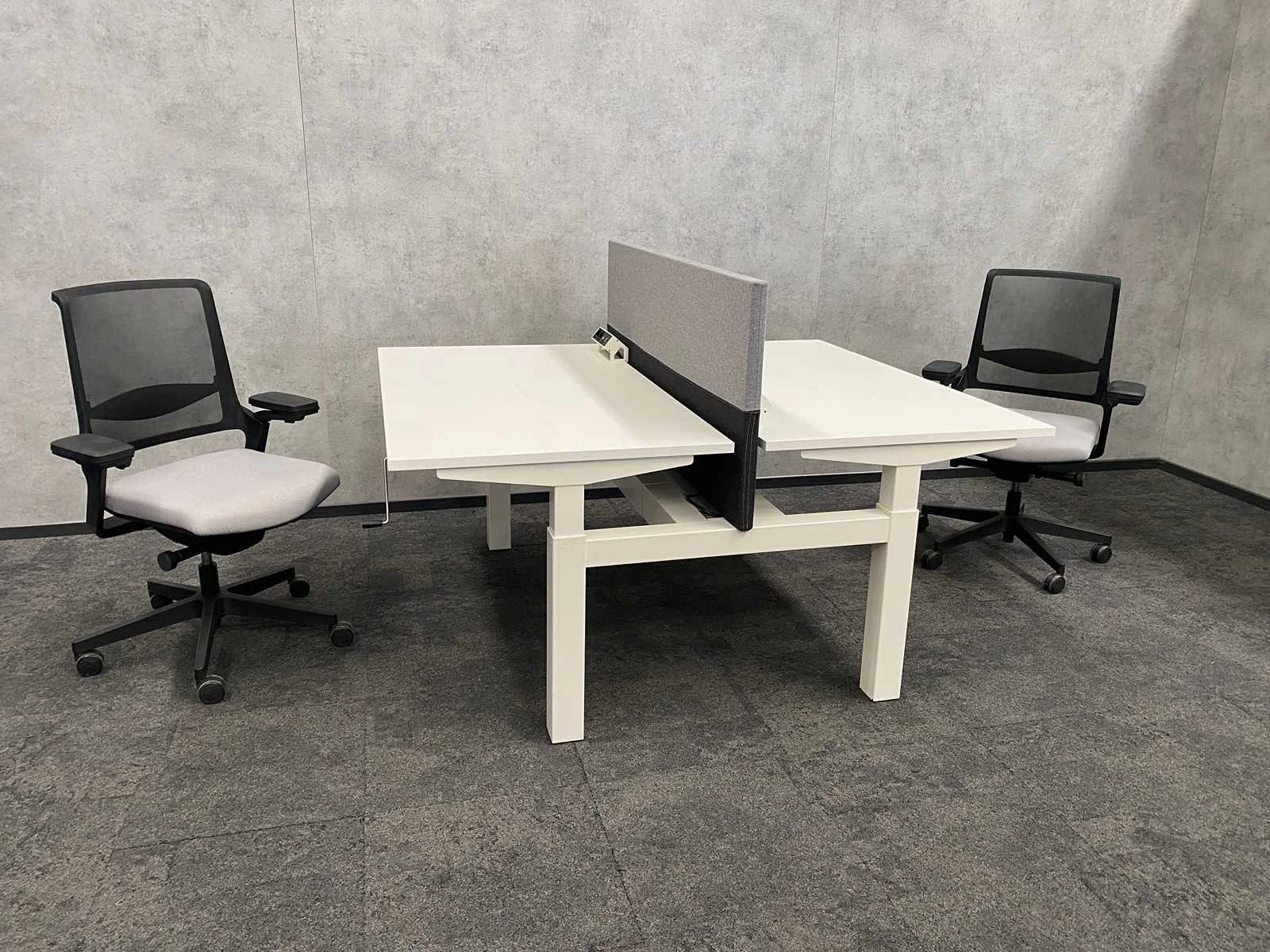 Kavel bestaande uit 2x Interstuhl Movy ergonomische bureaustoel v.v. 4D armleggers, zithoogte en zitdiepte instelbaar, kantelmechanisme rugleuning, verstelbare lendensteun. ----- 2x Bachman opbouwstekkerblok (2x230V + 2x USB) ----- 1x in hoogte verstelbaar duo bureau v.v. handslinger, grijs/ antraciet akoestische scheidingswand, draadgoot. Afm. ca. hoogte 64.5 tot 92.5 cm. bxd 140x80 cm. - LET OP transportafmetingen bureau ca. hxbxd 65x140x170 cm. Nee Slingerbureau: true
