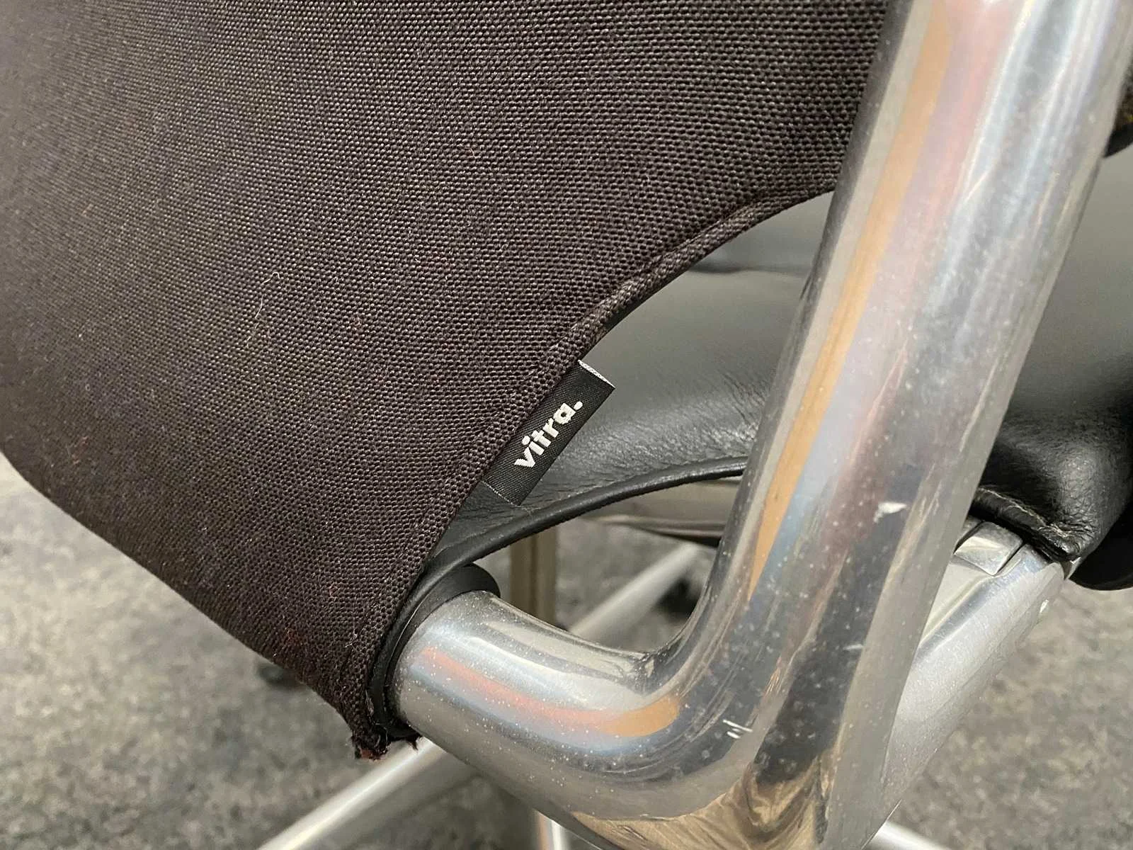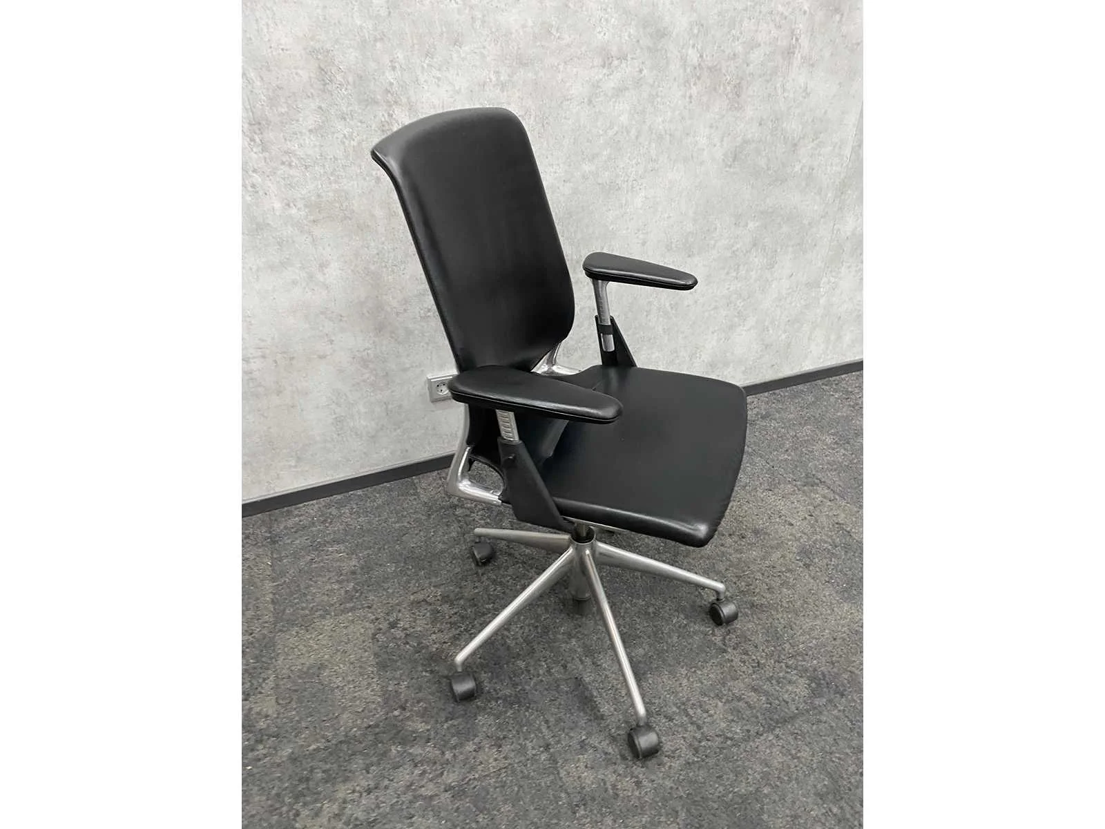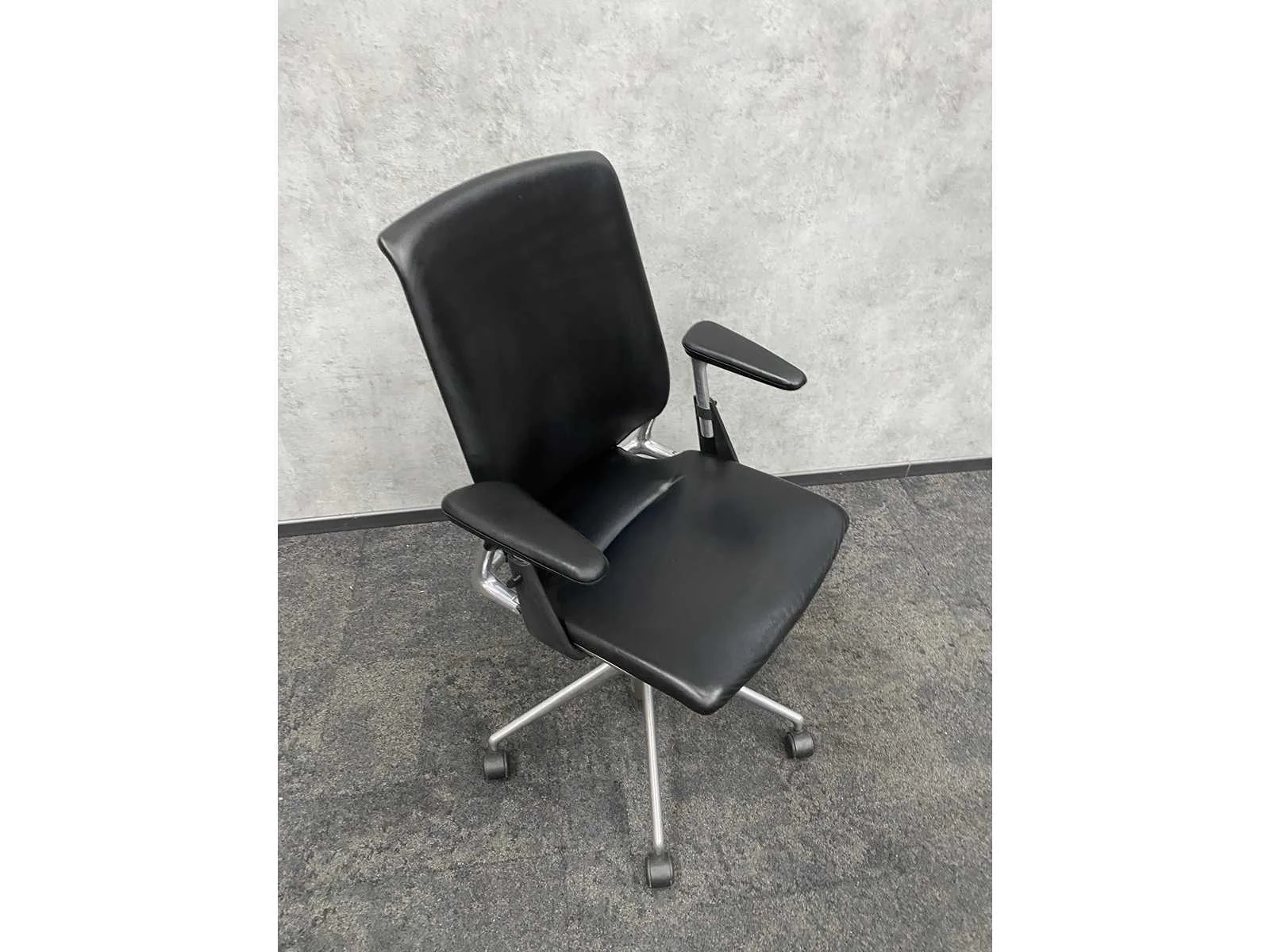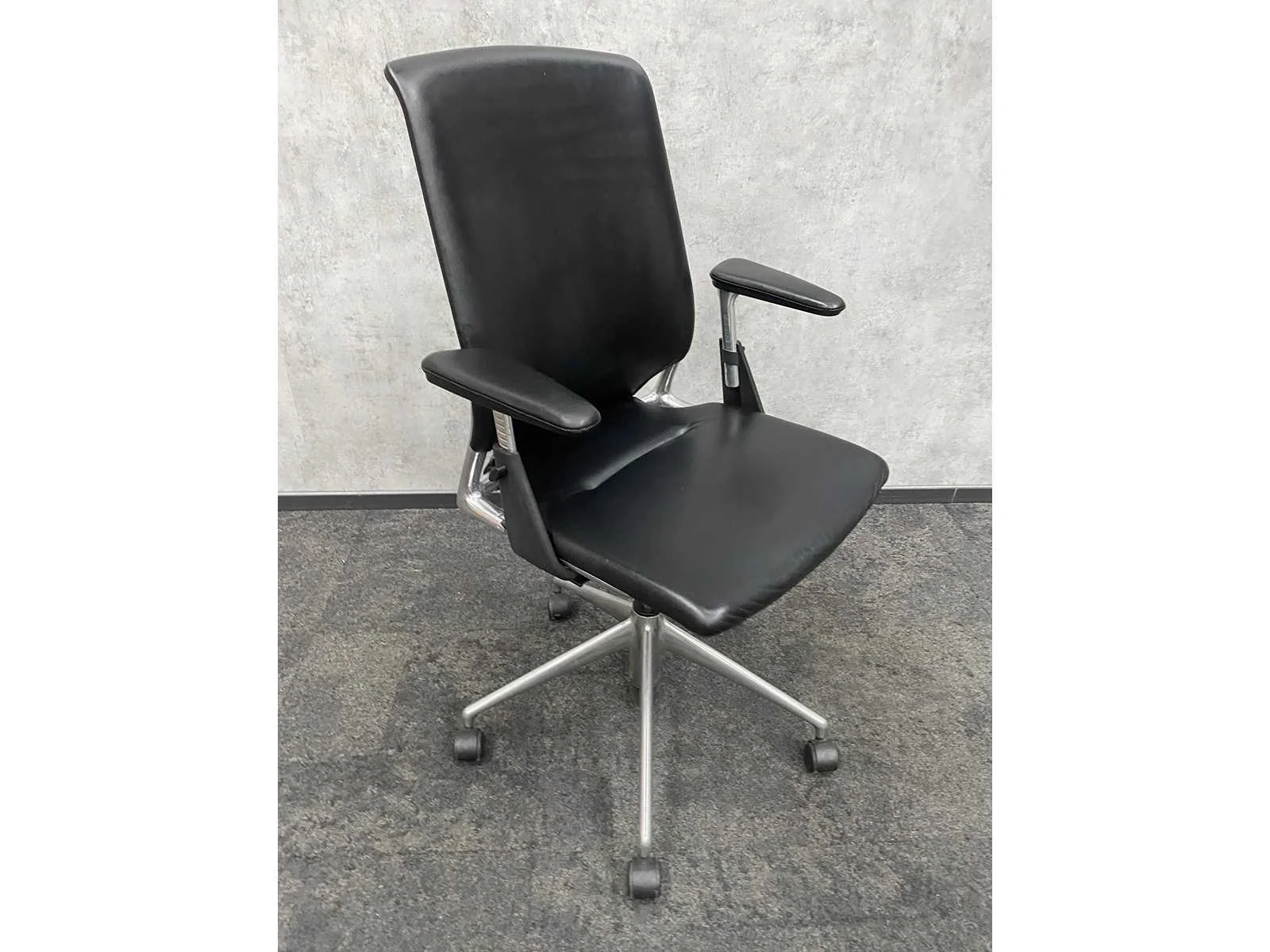 V.v. in hoogte instelbare armleggers, zithoogte instelbaar. Nee Merk: Vitra Meda Kleur: zwart, chroom