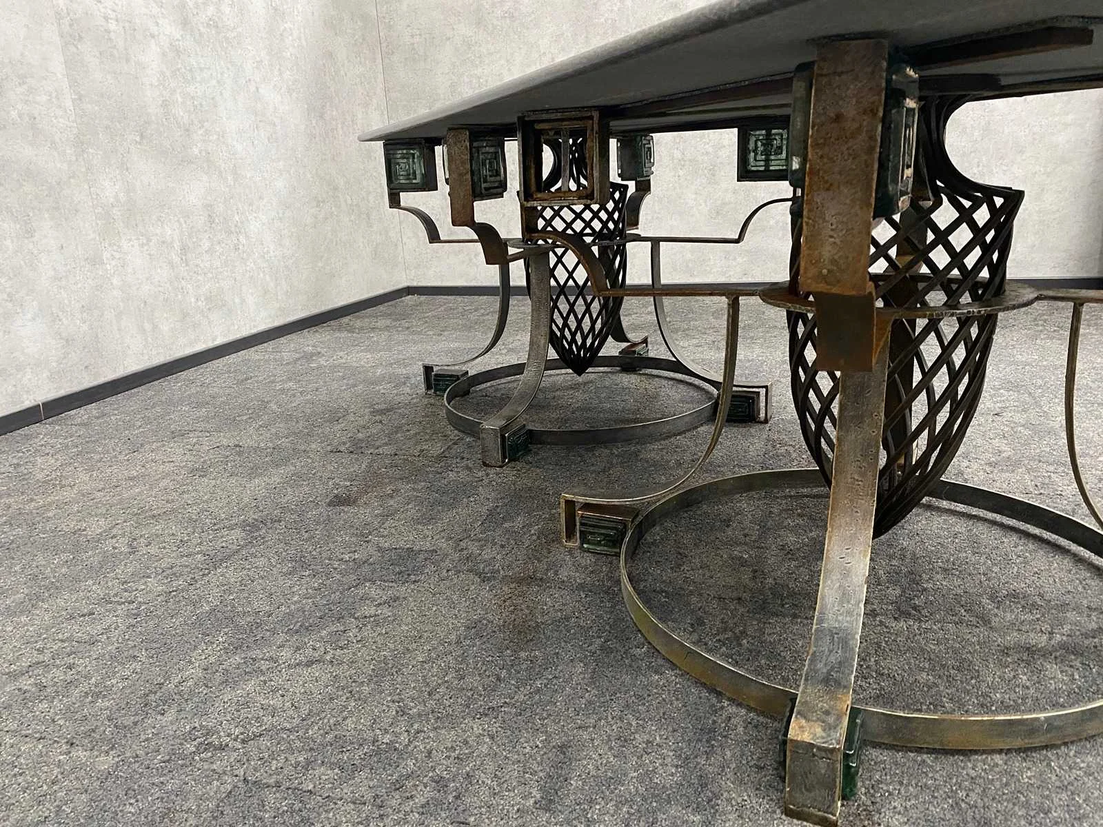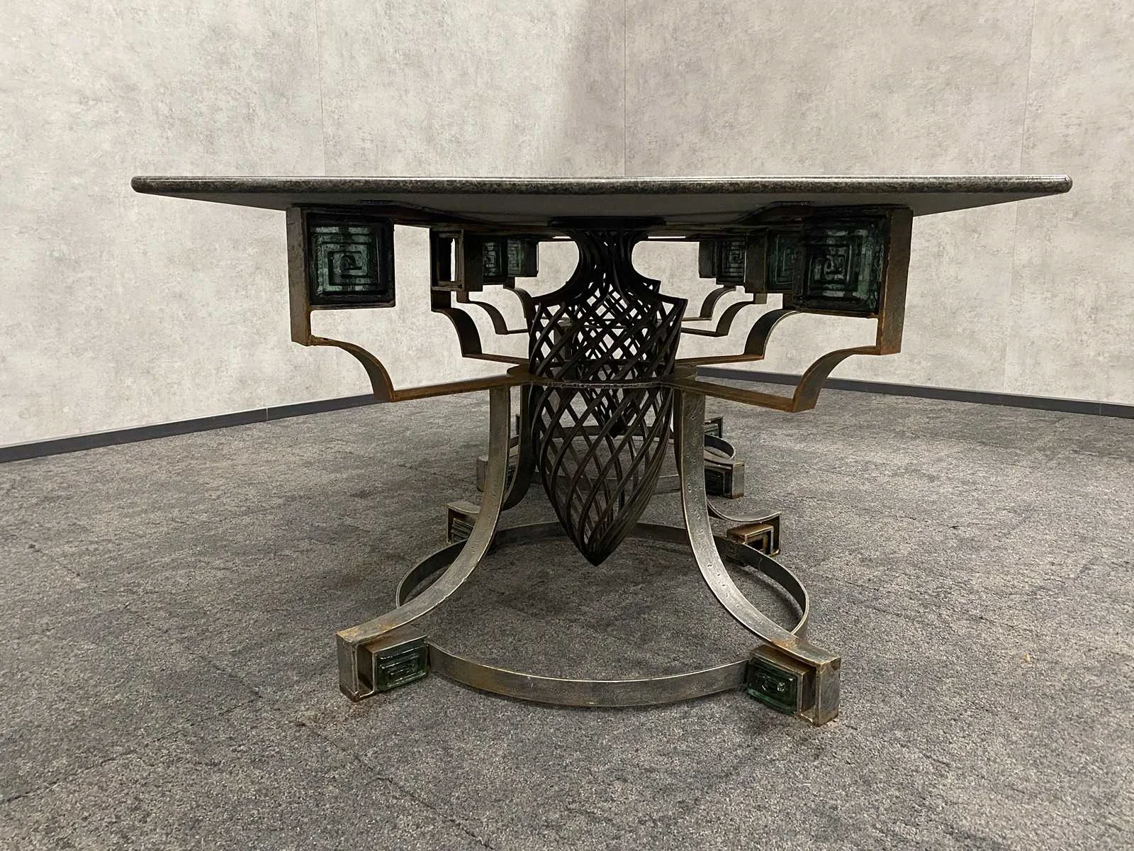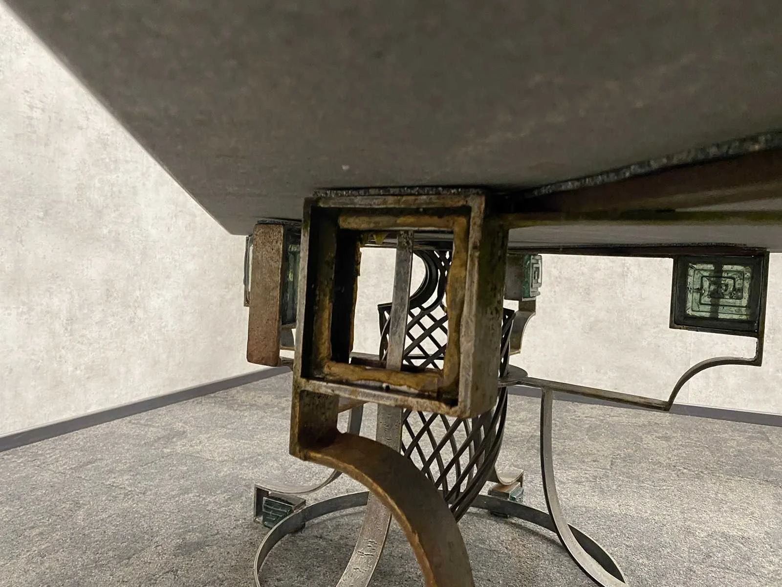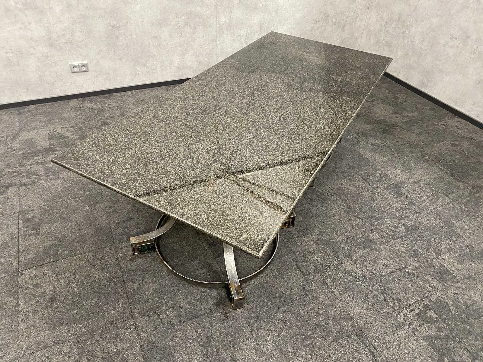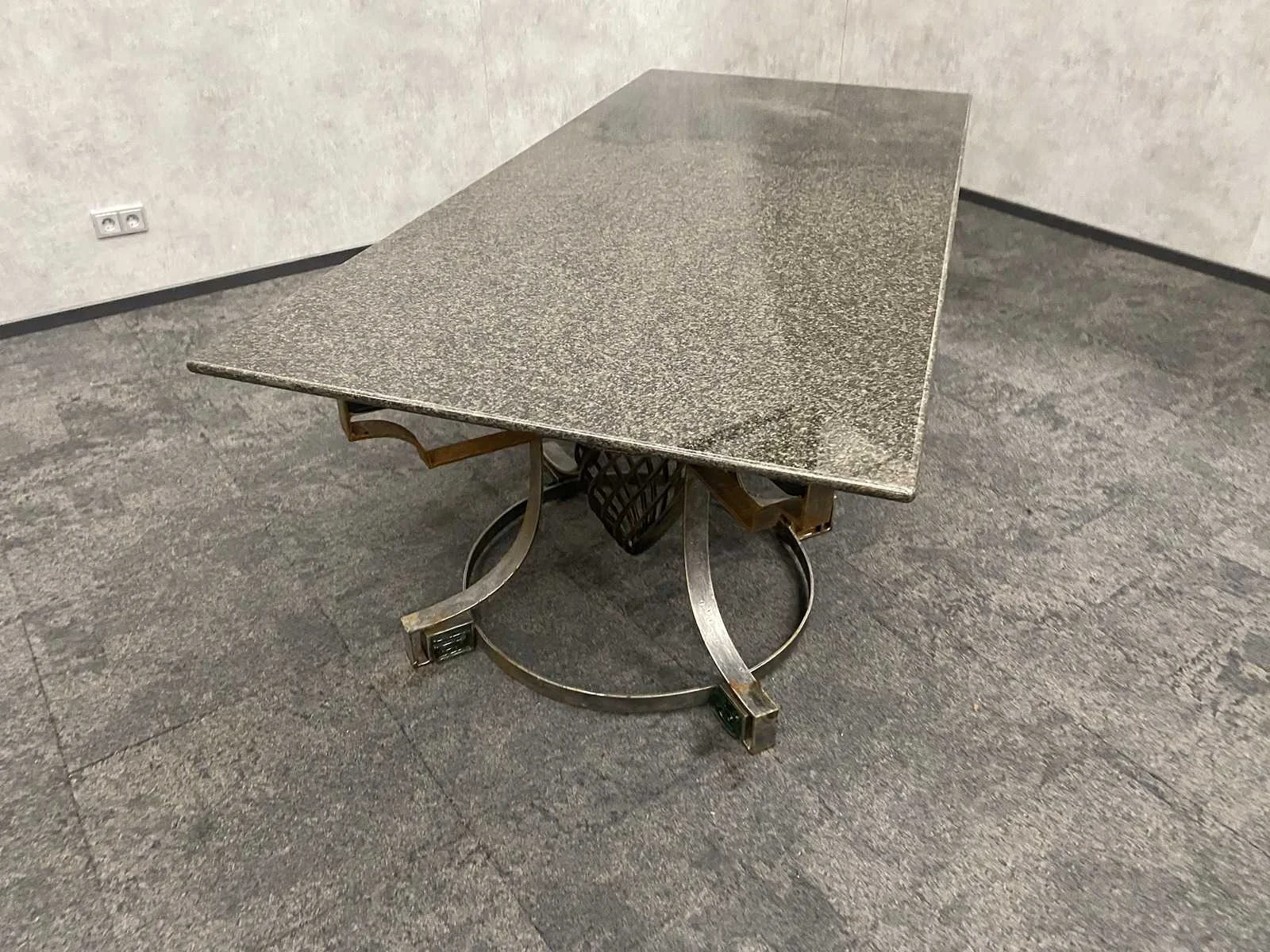 Tafel v.v. gezoet composiet blad. --- let op glazen ornamenten incompleet. --- Afm. ca. hxbxd 73.5x220x100 cm. Nee