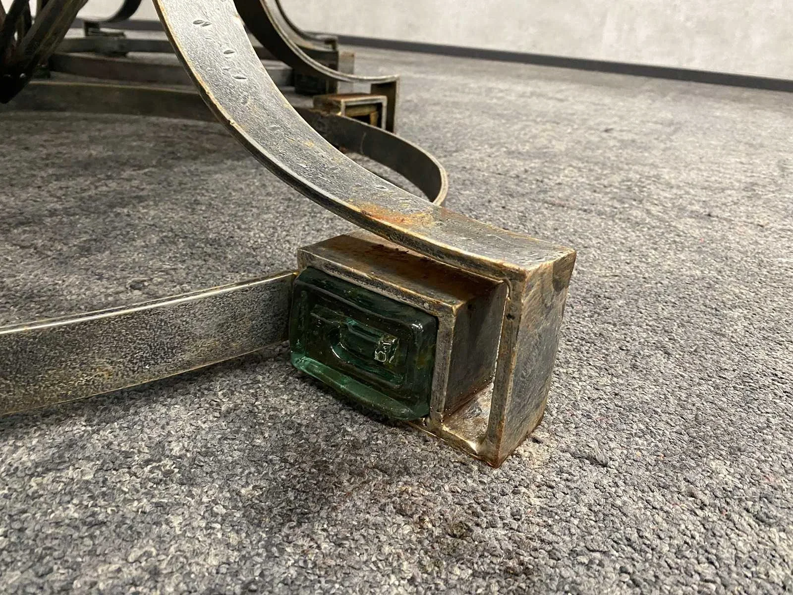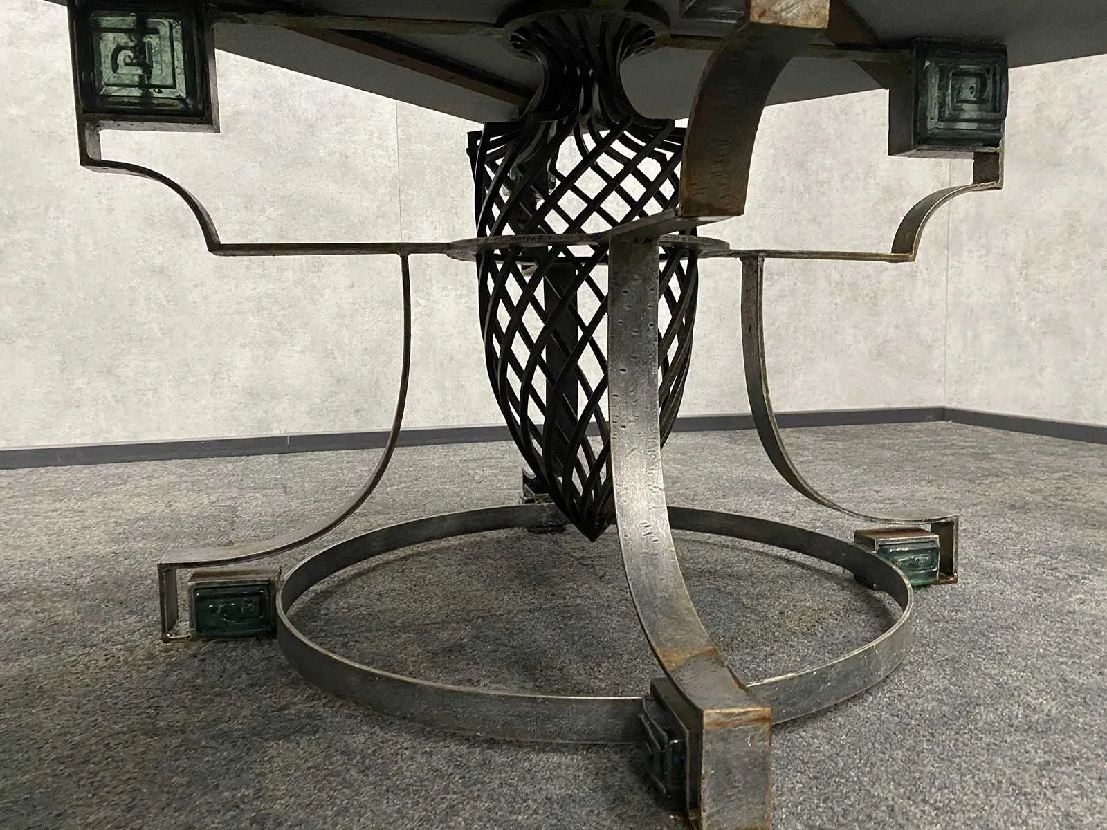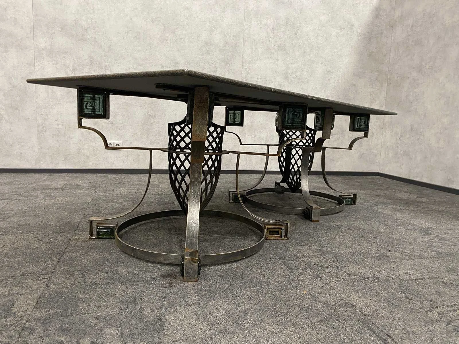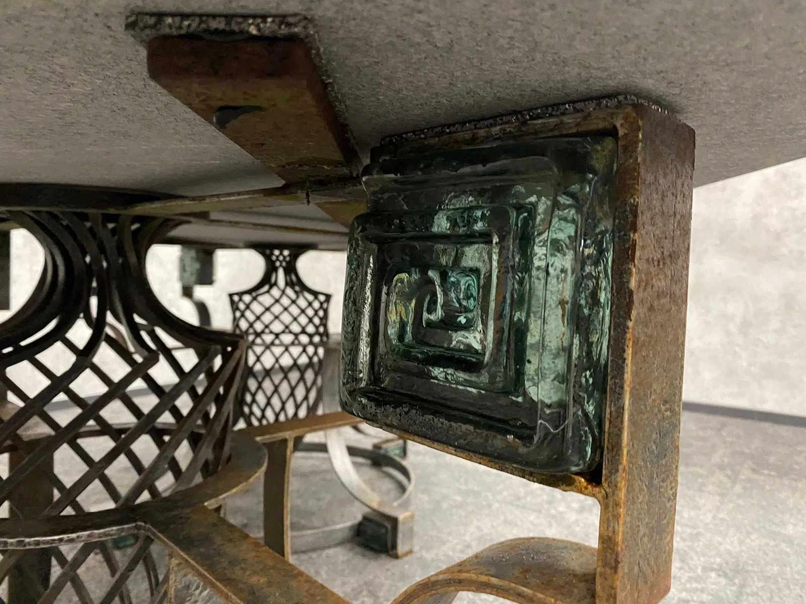 Tafel v.v. gezoet composiet blad. --- let op glazen ornamenten incompleet. --- Afm. ca. hxbxd 73.5x220x100 cm. Nee