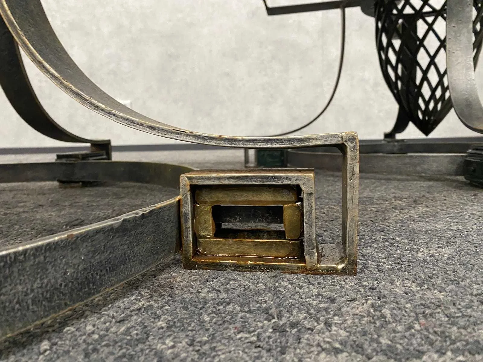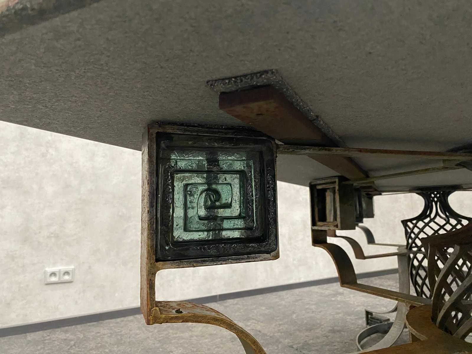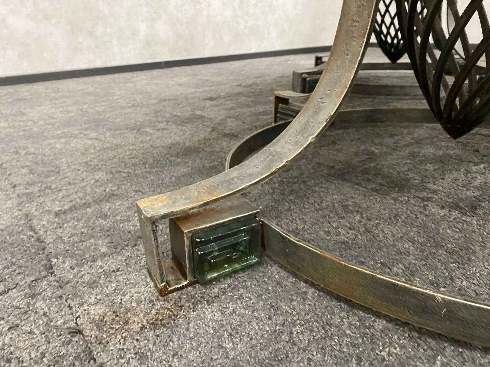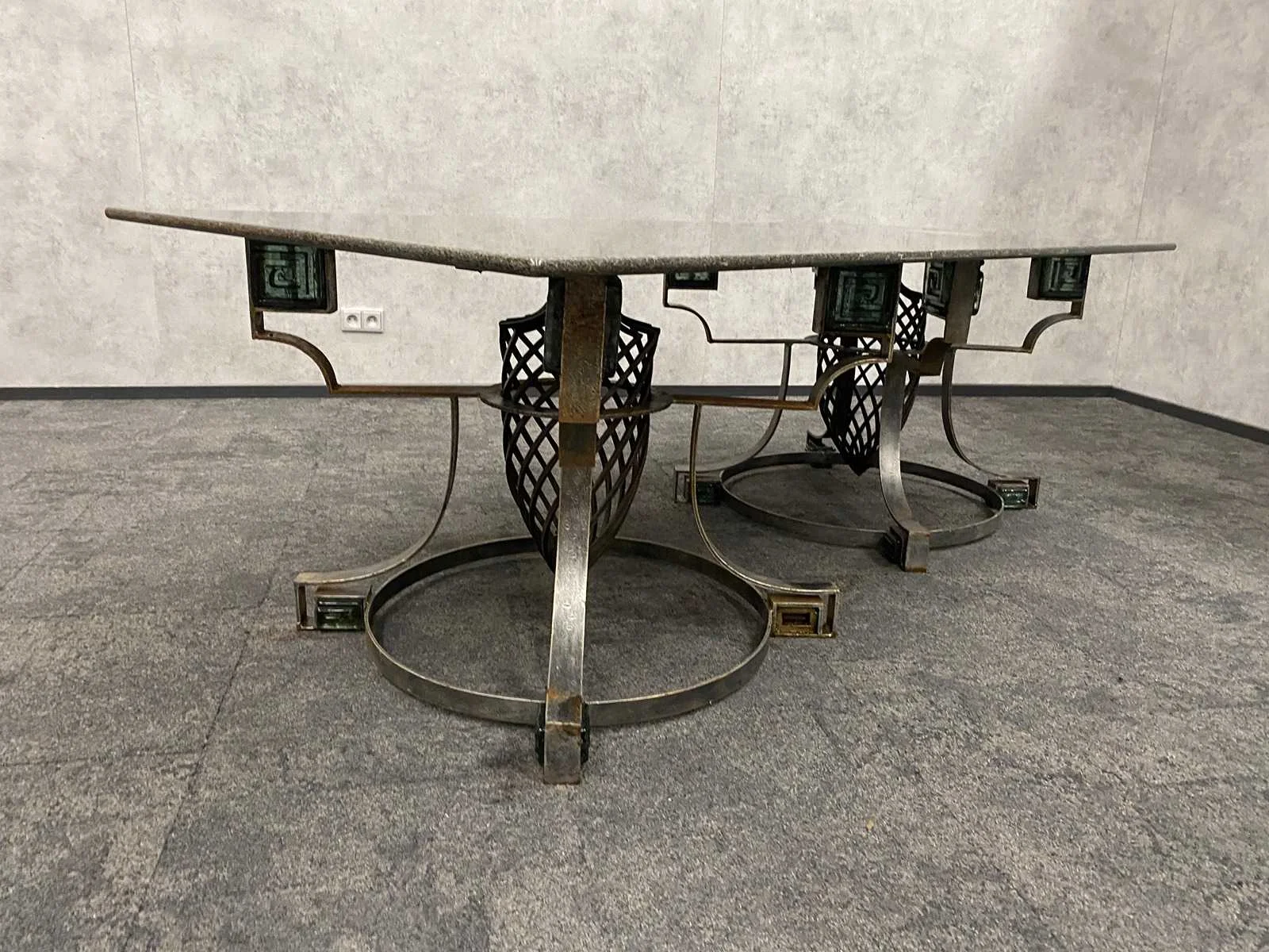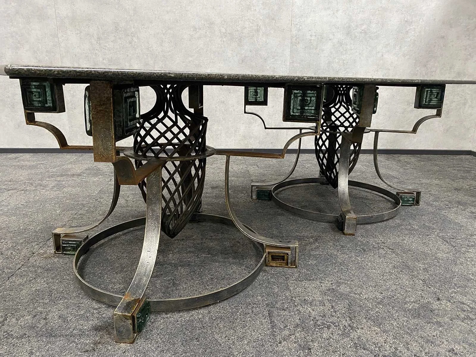 Tafel v.v. gezoet composiet blad. --- let op glazen ornamenten incompleet. --- Afm. ca. hxbxd 73.5x220x100 cm. Nee