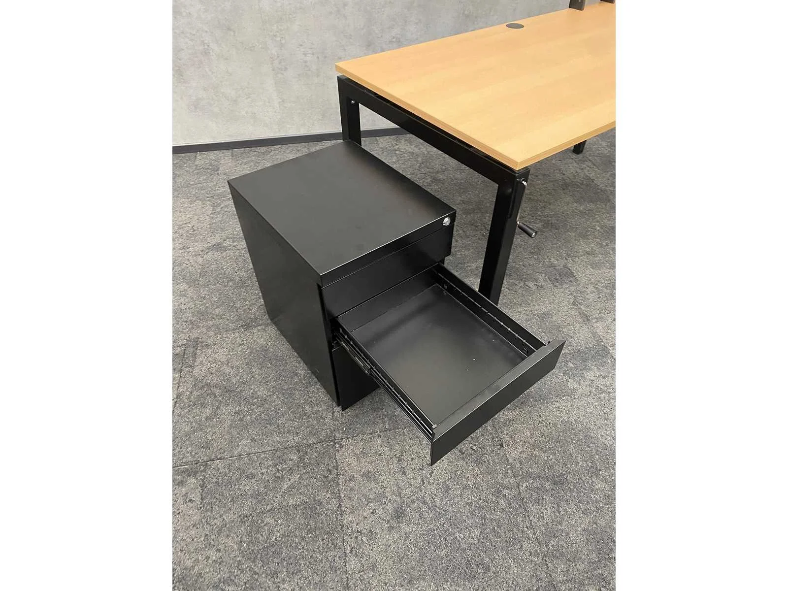 Kavel bestaande uit: 1 x slinger bureau v.v. kabeldoorvoer, draadgoot en opbouwstekkerblok --- 1 x verrijdbaar stalen ladeblok afmeting ca. h63xb41.5xd50cm zonder sleutel --- 1 x WeWork netweave bureaustoel v.v. in hoogte verstelbare armleggers, verstelbare lendesteun, zithoogte instelbaar, kantelmechanisme rugleuning Nee