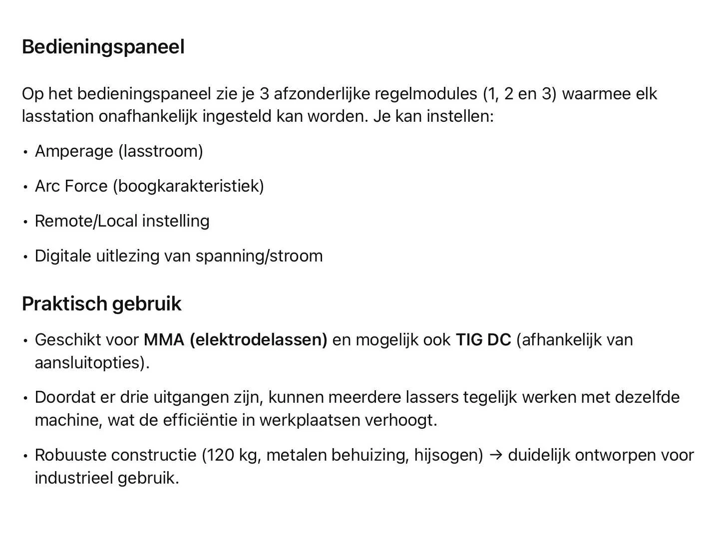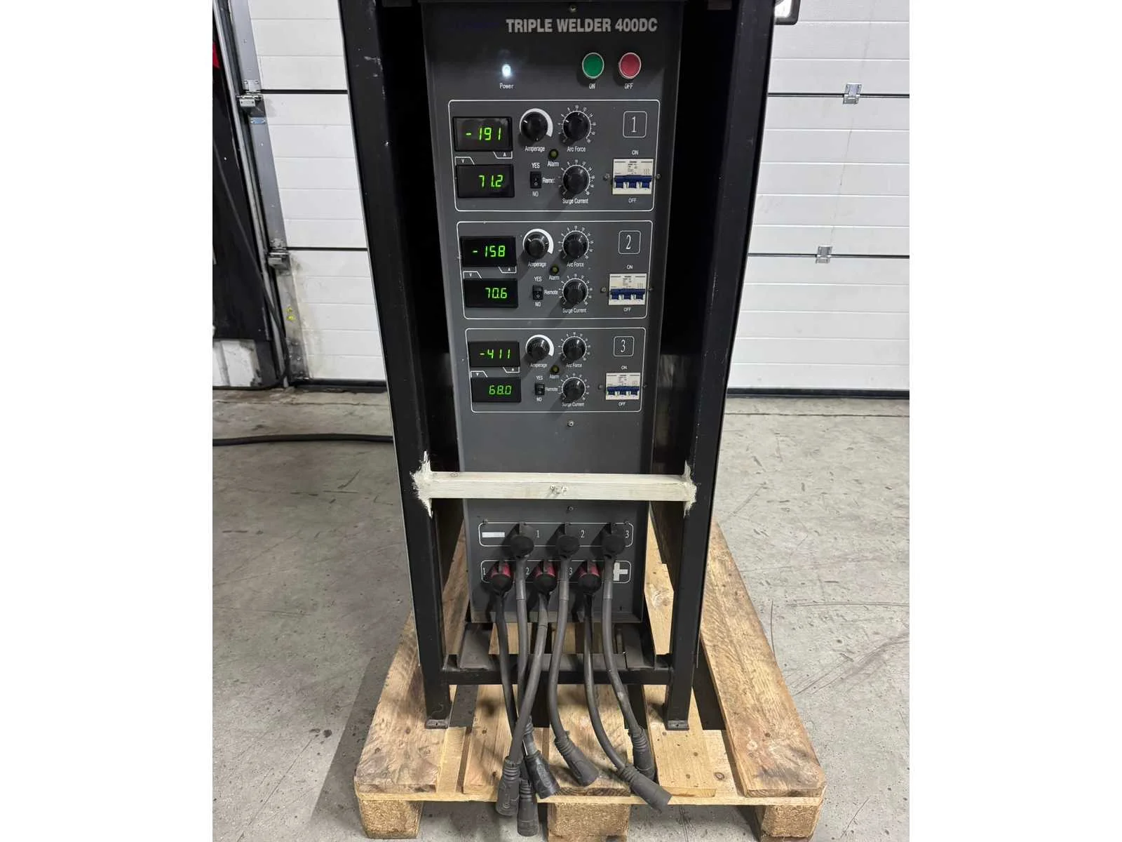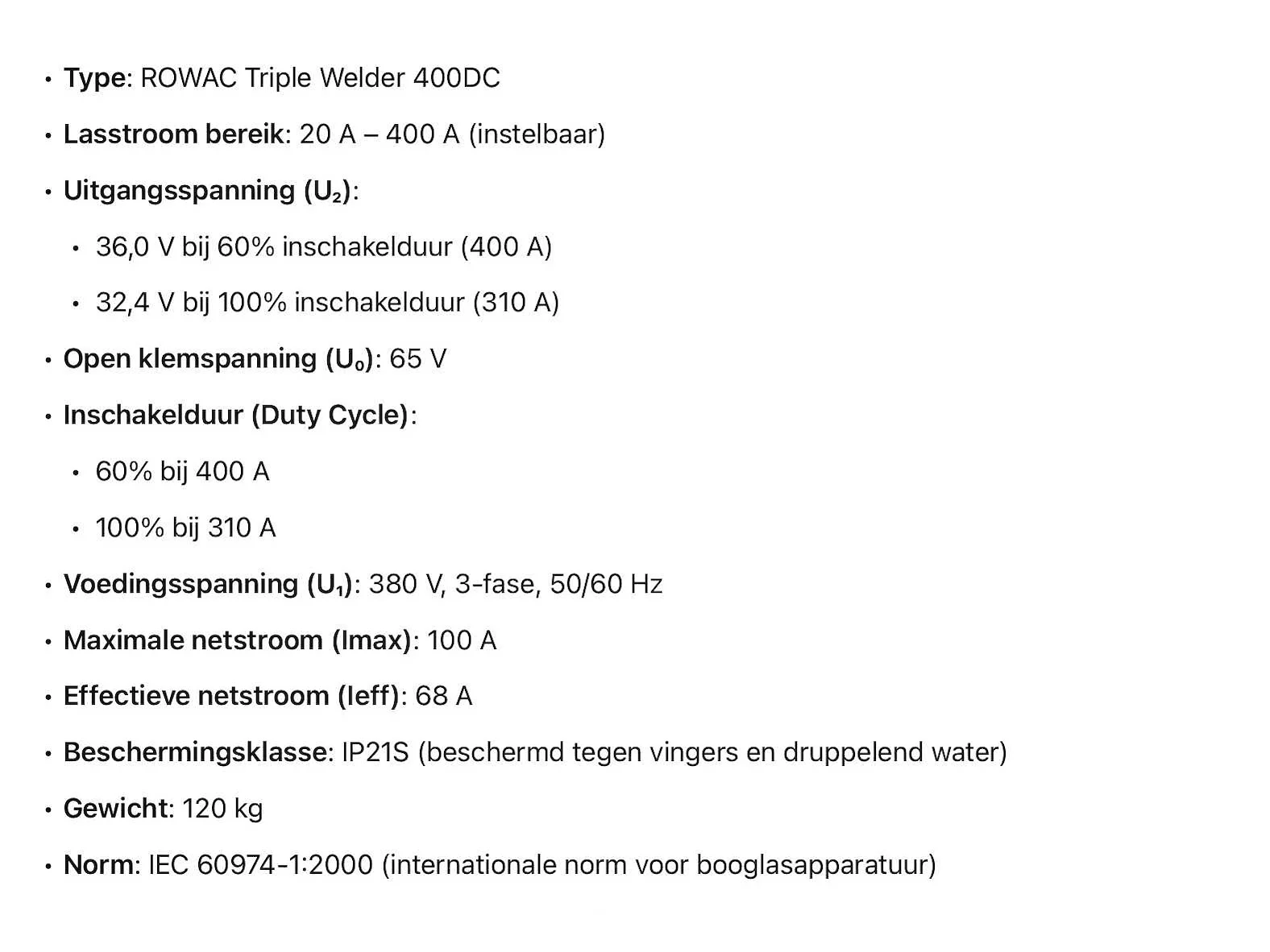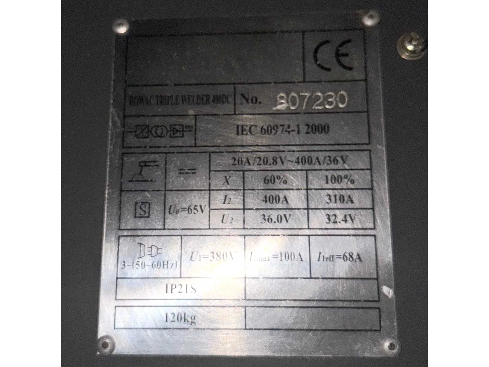 In werkende staat. Nee Merk: Rowac Type: Triple Welder 400 DC lasapparaat Serienummer: 807230 Aansluiting: 400V Machinegewicht: 120kg Afmeting l: 1000mm Afmeting b: 600mm Afmeting h: 1000mm