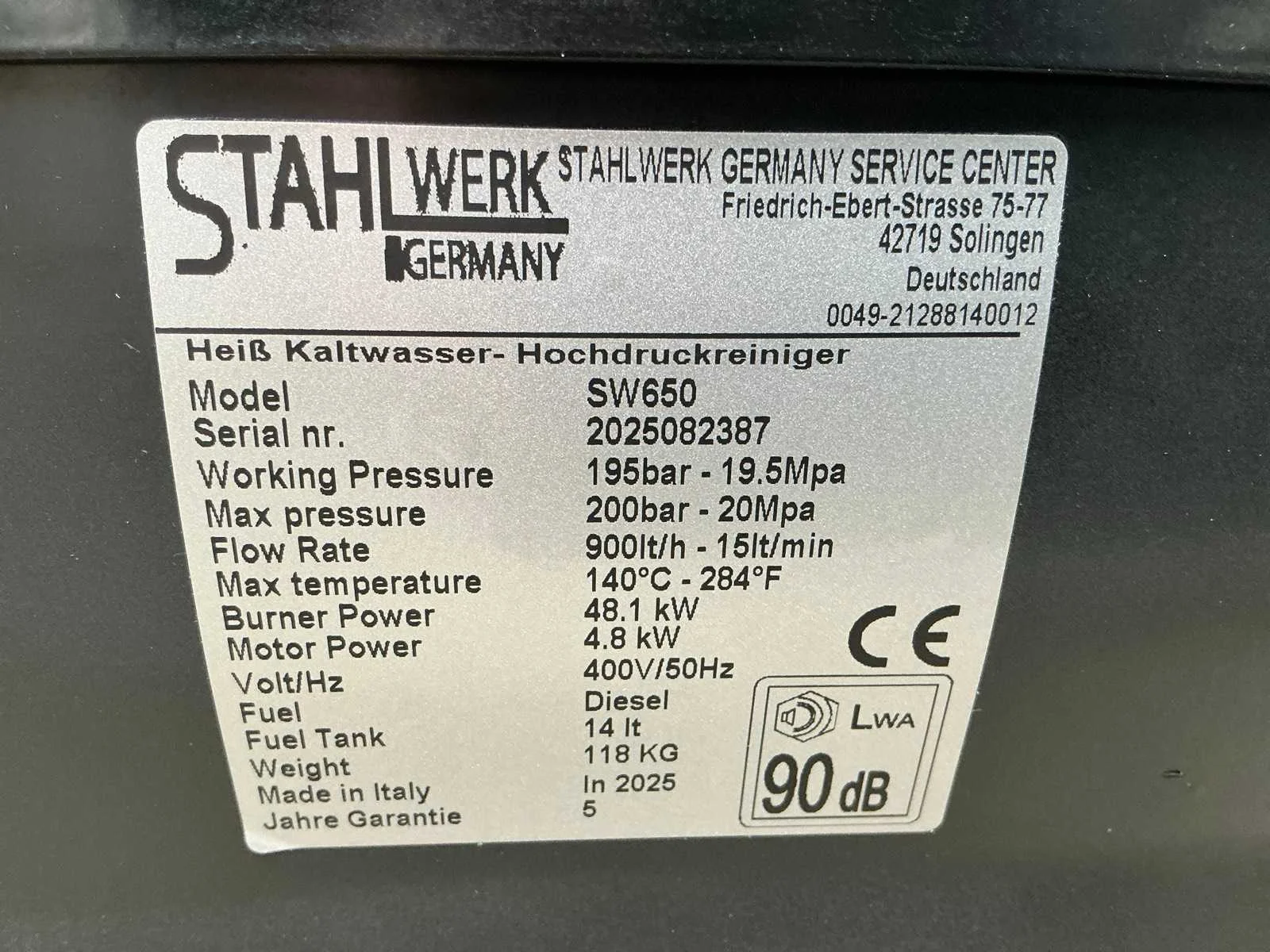 Voorzien van: model: SW 650, werkdruk: 195bar – 19.5Mpa, maximale druk: 200bar – 20Mpa, capaciteit: 900 l/u – 15 l/min, maximale temperatuur: 140°C - 284°F, brander vermogen: 48,1 kW, motorkracht: 5,5 kW, stroomvoorziening: 400V/50Hz, wasmiddel tank: diesel, gewicht: 118kg, lengte slang 5m. Nee Merk: Stahlwerk Type: SW650 Model: SW650 Bouwjaar: 2025 Lengte: 1400cm Breedte: 800cm Hoogte: 1400cm
