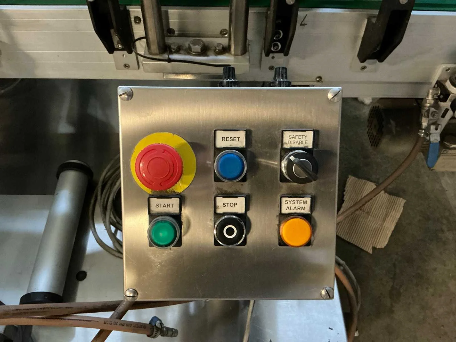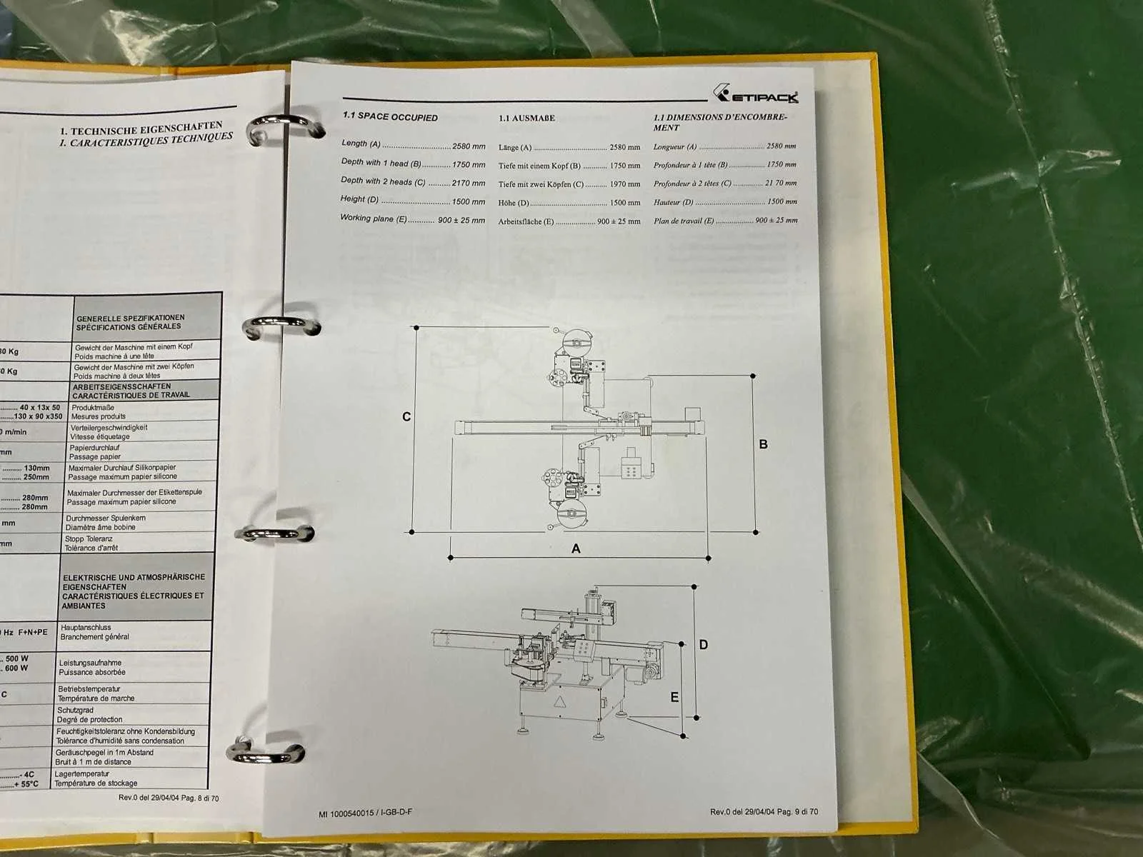 Onder andere voorzien van: handleiding, 220V aansluiting, luchtaansluiting, bedieningskast, onderstel met stempels, verstelbare invoer, noodstop. In werkende staat. Nee Merk: Etipack Type: Sistema 5 Bouwjaar: 2008 Serienummer: 07/000002808 Aansluiting: 220V Eigen gewicht: 460kg Totale afmeting L: 2580mm Totale afmeting Breedte: 2170mm Totale afmeting Hoogte: 1500mm