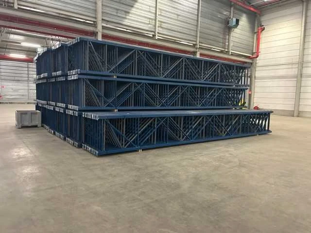 Foto ter indicatie; gebundeld en professioneel gedemonteerd; stijlbreedte 100mm; met voetjes; 7*4631 / 56*4633 Nee Merk: Redirack Sectie afm. b: 1050mm Sectie diepte: 2700mm Sectie afm. h: 8850mm Aantal staanders: 7 Aantal liggers: 56 Geconstrueerd: true