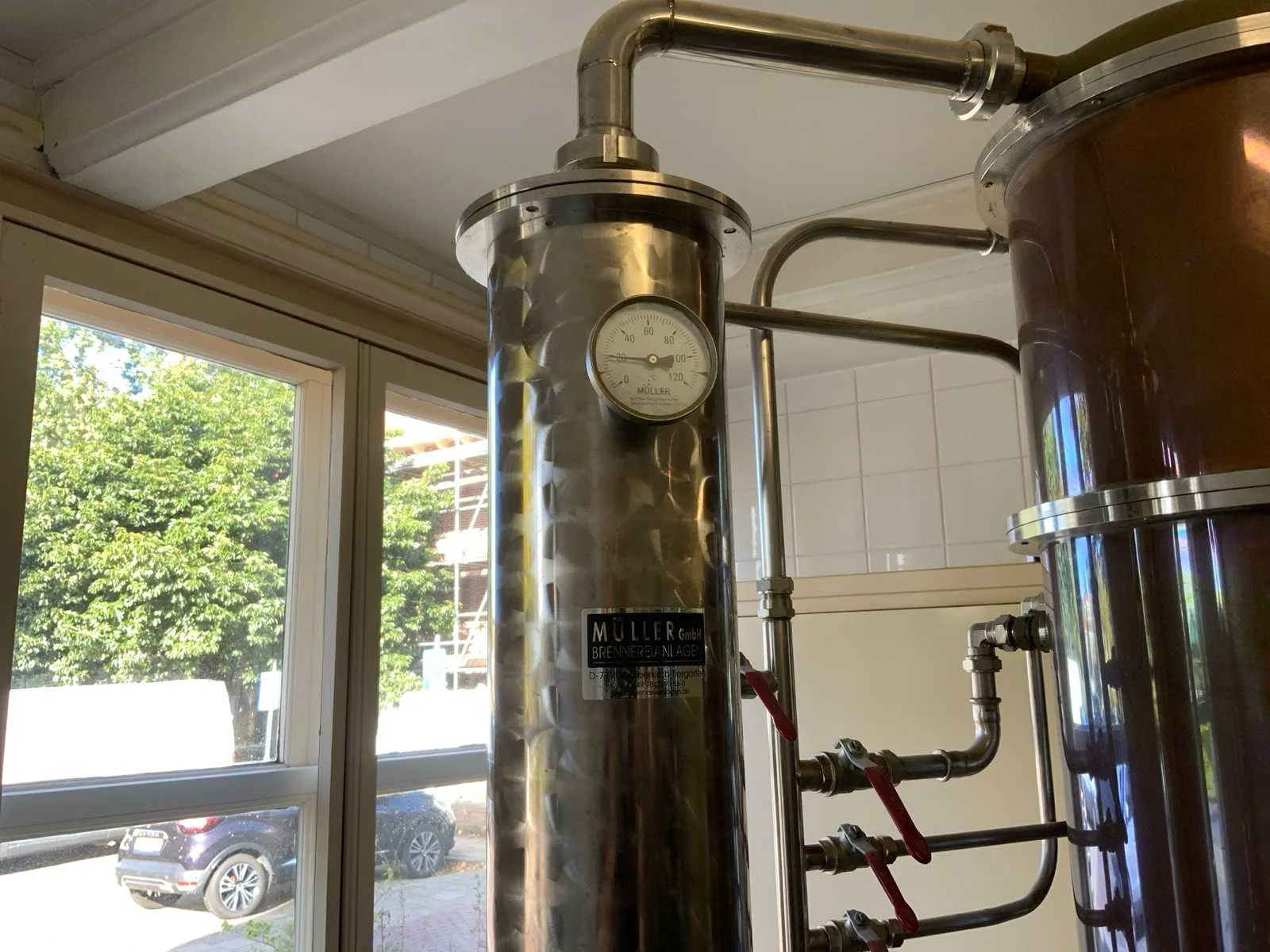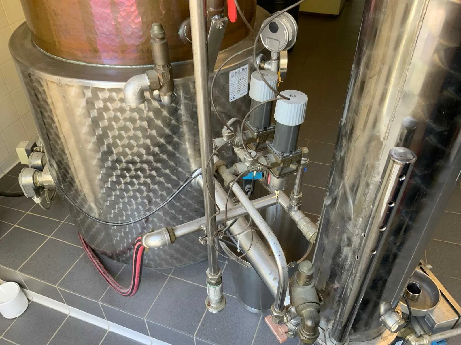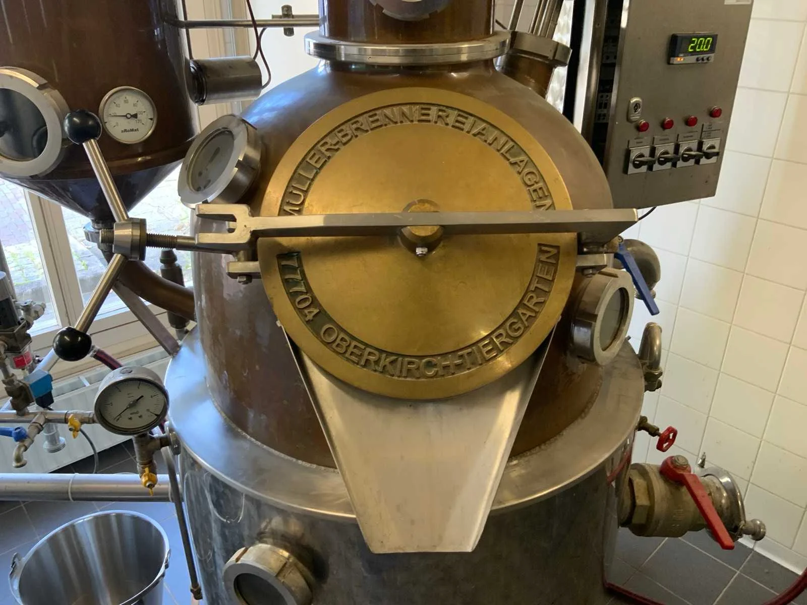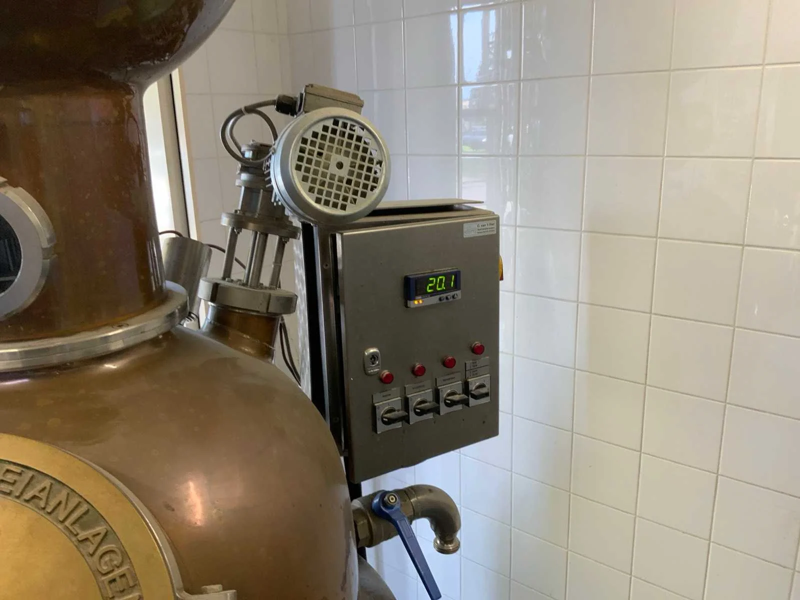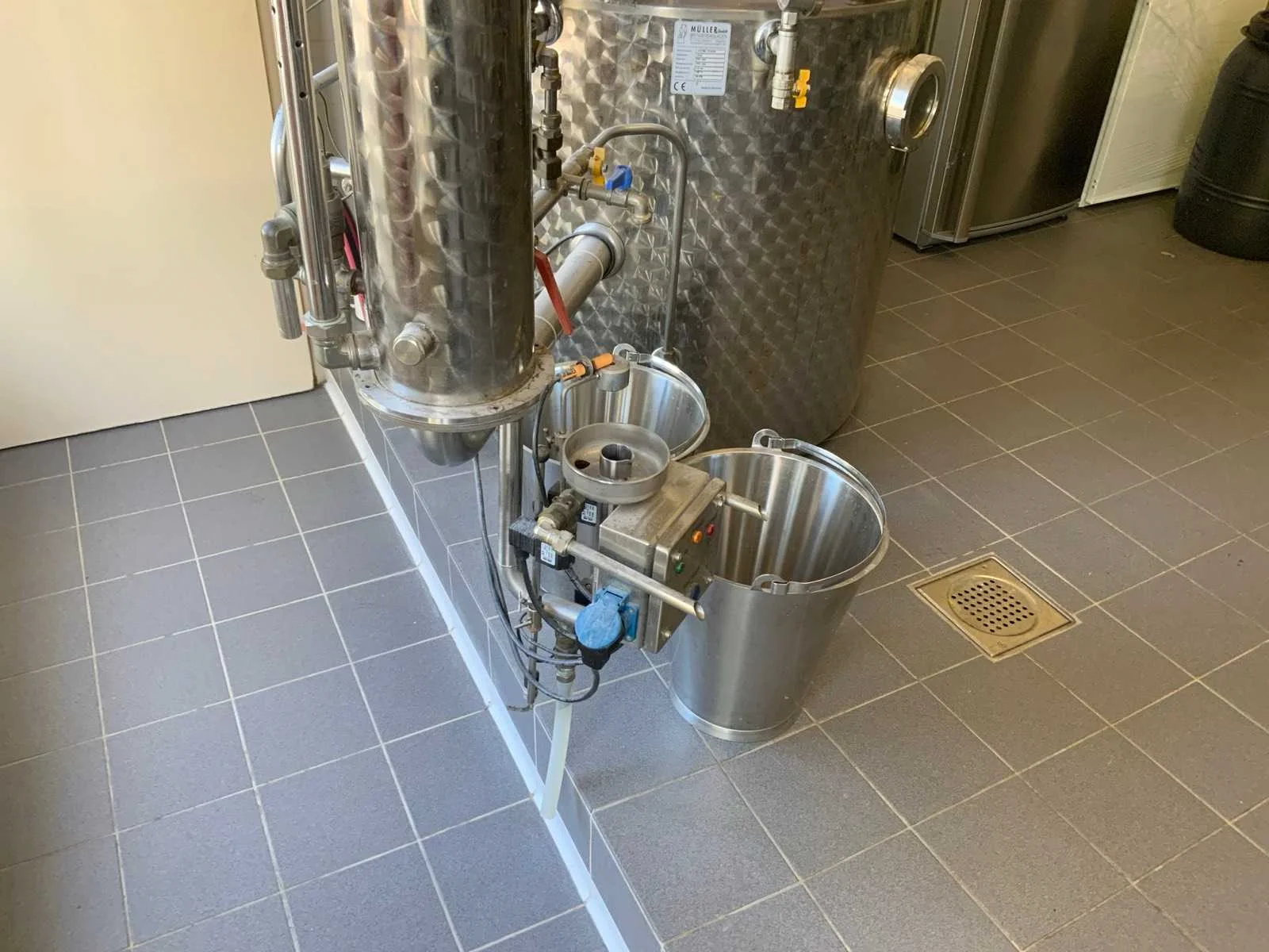 Müller Brennereianlage Typ AROMA IV met aRoMat-verstärker; hoogwaardige vol-koper distilleerinstallatie; model: Typ AROMA IV; waterbad met vuurhaard; koperen ketel 3 mm dik; koud gevormd en gehamerd; keteldiameter 750 mm; aroma-hoed met 100 L stoomruimte en 2 m² koperoppervlak; zijdelingse kolom met geïntegreerde aRoMat-spiraal; RVS buizenkoeler met 1,5 m² koeloppervlak; glockenböden individueel afsluitbaar; sprayball-reinigingssysteem in hoed, kolom en condensor; elektrisch roerwerk met 93 tpm; conische tresteruitloop (Ø 350 mm); verlicht inspectievenster in ketelbrust; heetwatertank 130 L met drukverhogingspomp (tot 6 bar); automatische destillat-trenner DT103 (volgens %vol); centrale besturingskast voor complete systeemaansturing; gepatenteerde Wassergeizer I & II voor terugwinning en verwarming; geïntegreerde koperen katalysator (Kupferadsorber) voor cyanidebinding; extreem aromabehoud dankzij aRoMat-systeem; rendement geoptimaliseerd; onderhoudsvriendelijk; ontwerp volgens Duitse standaard Müller GmbH Nee Merk: Müller Type: Aromat Bouwjaar: 2009 Serienummer: AROMA IV/3535 Aansluiting: 440V Totale afmeting L: 1170mm Totale afmeting Breedte: 2000mm Totale afmeting Hoogte: 2400mm