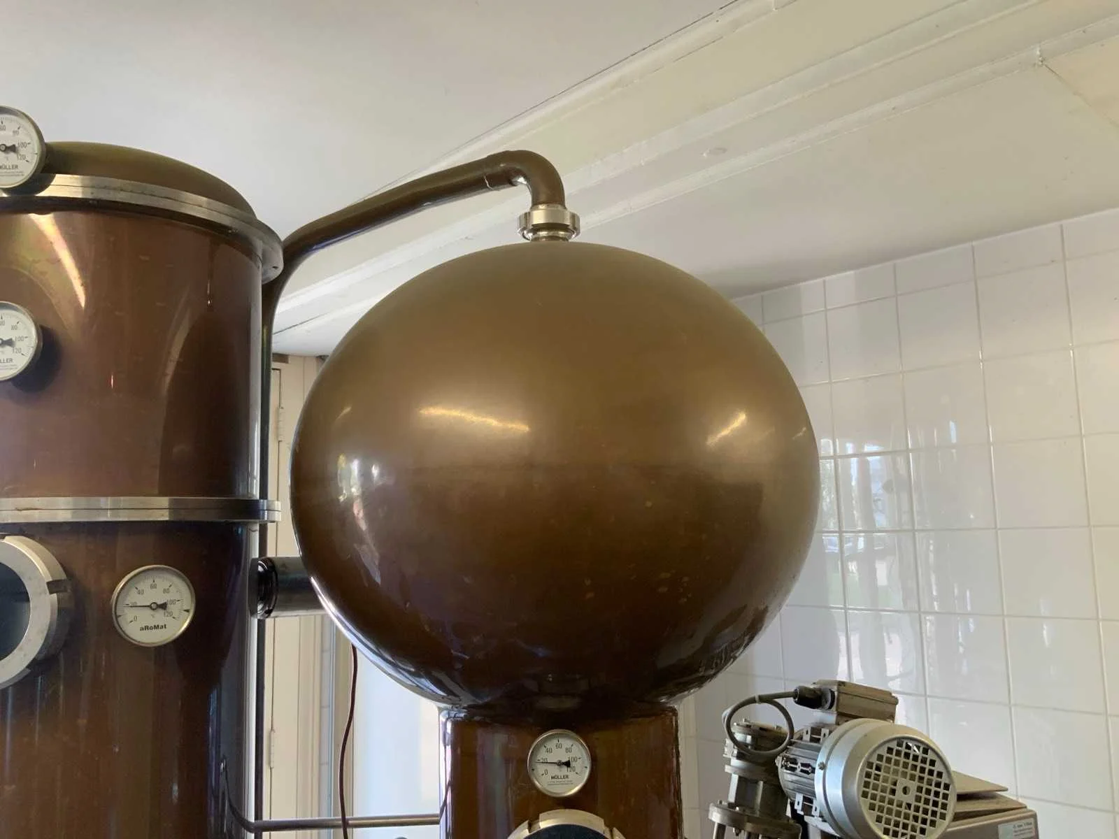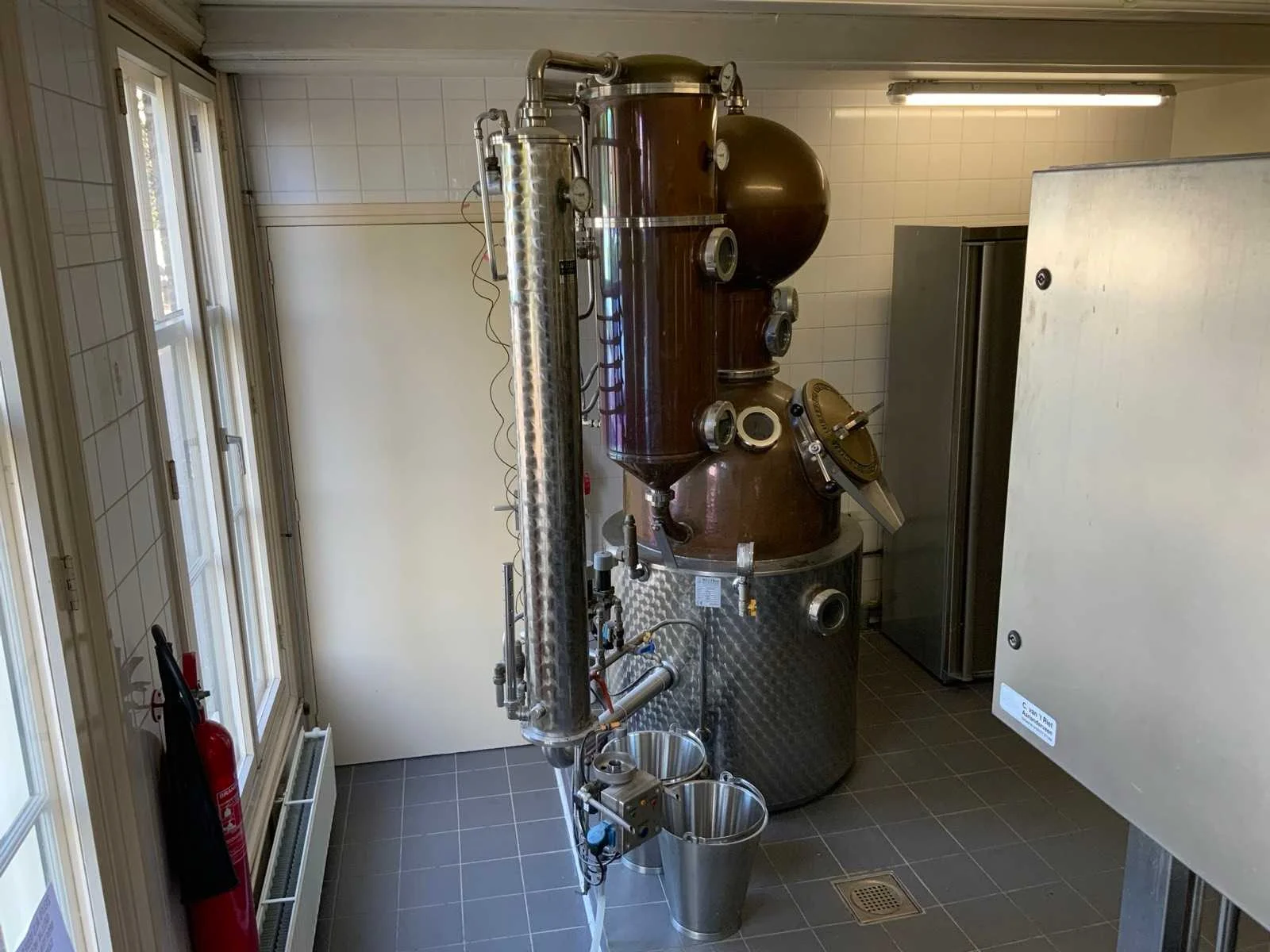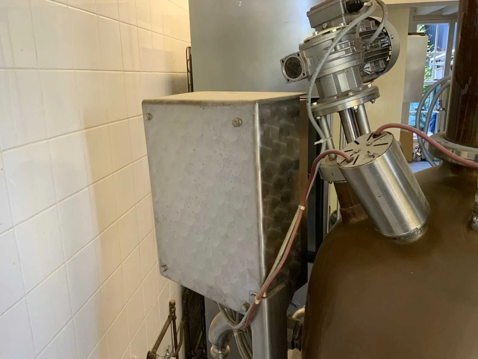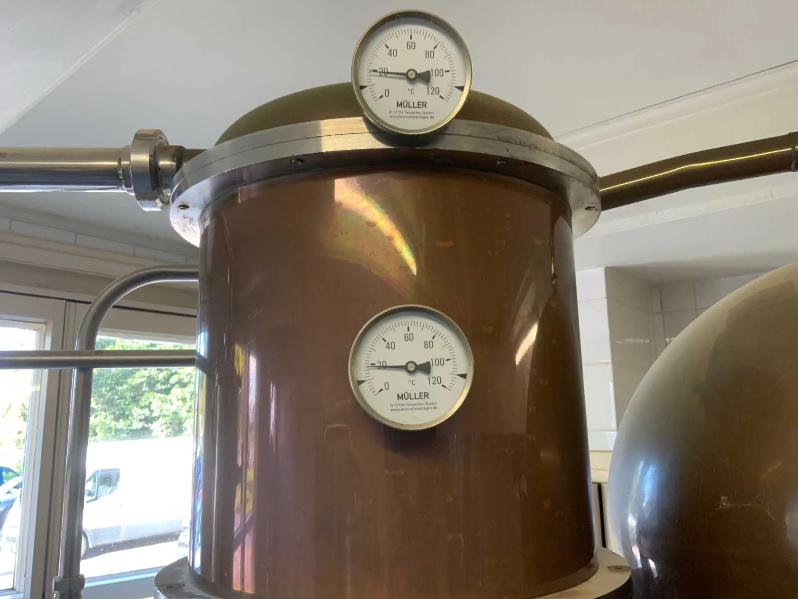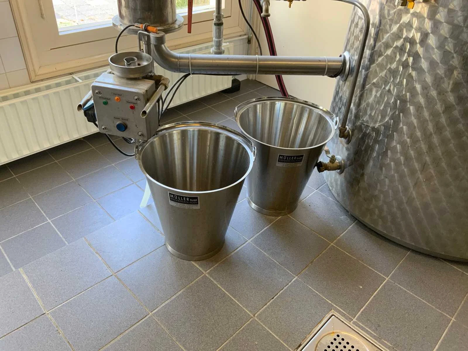 Müller Brennereianlage Typ AROMA IV met aRoMat-verstärker; hoogwaardige vol-koper distilleerinstallatie; model: Typ AROMA IV; waterbad met vuurhaard; koperen ketel 3 mm dik; koud gevormd en gehamerd; keteldiameter 750 mm; aroma-hoed met 100 L stoomruimte en 2 m² koperoppervlak; zijdelingse kolom met geïntegreerde aRoMat-spiraal; RVS buizenkoeler met 1,5 m² koeloppervlak; glockenböden individueel afsluitbaar; sprayball-reinigingssysteem in hoed, kolom en condensor; elektrisch roerwerk met 93 tpm; conische tresteruitloop (Ø 350 mm); verlicht inspectievenster in ketelbrust; heetwatertank 130 L met drukverhogingspomp (tot 6 bar); automatische destillat-trenner DT103 (volgens %vol); centrale besturingskast voor complete systeemaansturing; gepatenteerde Wassergeizer I & II voor terugwinning en verwarming; geïntegreerde koperen katalysator (Kupferadsorber) voor cyanidebinding; extreem aromabehoud dankzij aRoMat-systeem; rendement geoptimaliseerd; onderhoudsvriendelijk; ontwerp volgens Duitse standaard Müller GmbH Nee Merk: Müller Type: Aromat Bouwjaar: 2009 Serienummer: AROMA IV/3535 Aansluiting: 440V Totale afmeting L: 1170mm Totale afmeting Breedte: 2000mm Totale afmeting Hoogte: 2400mm