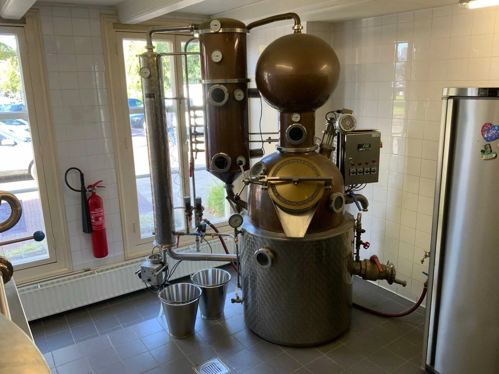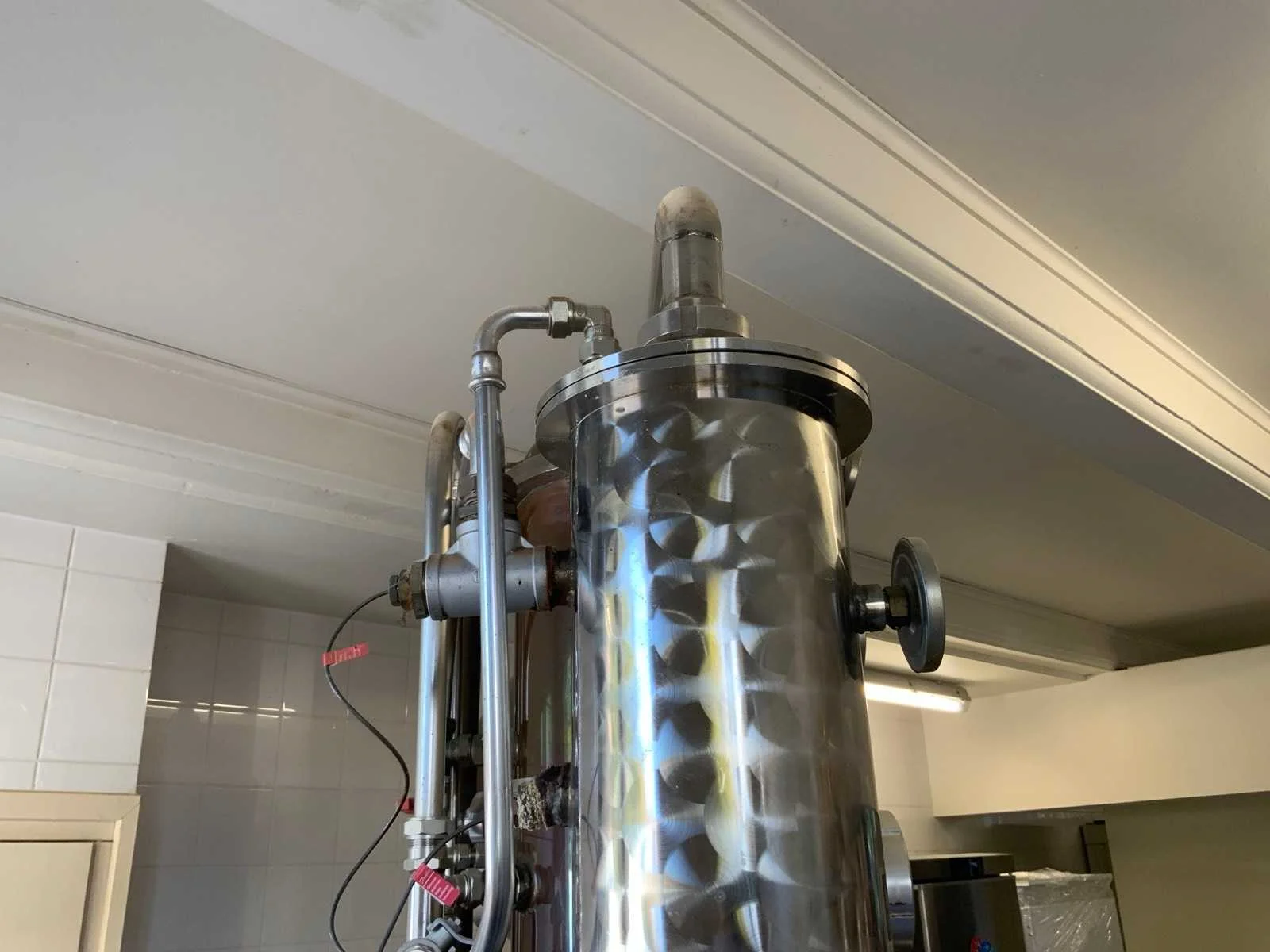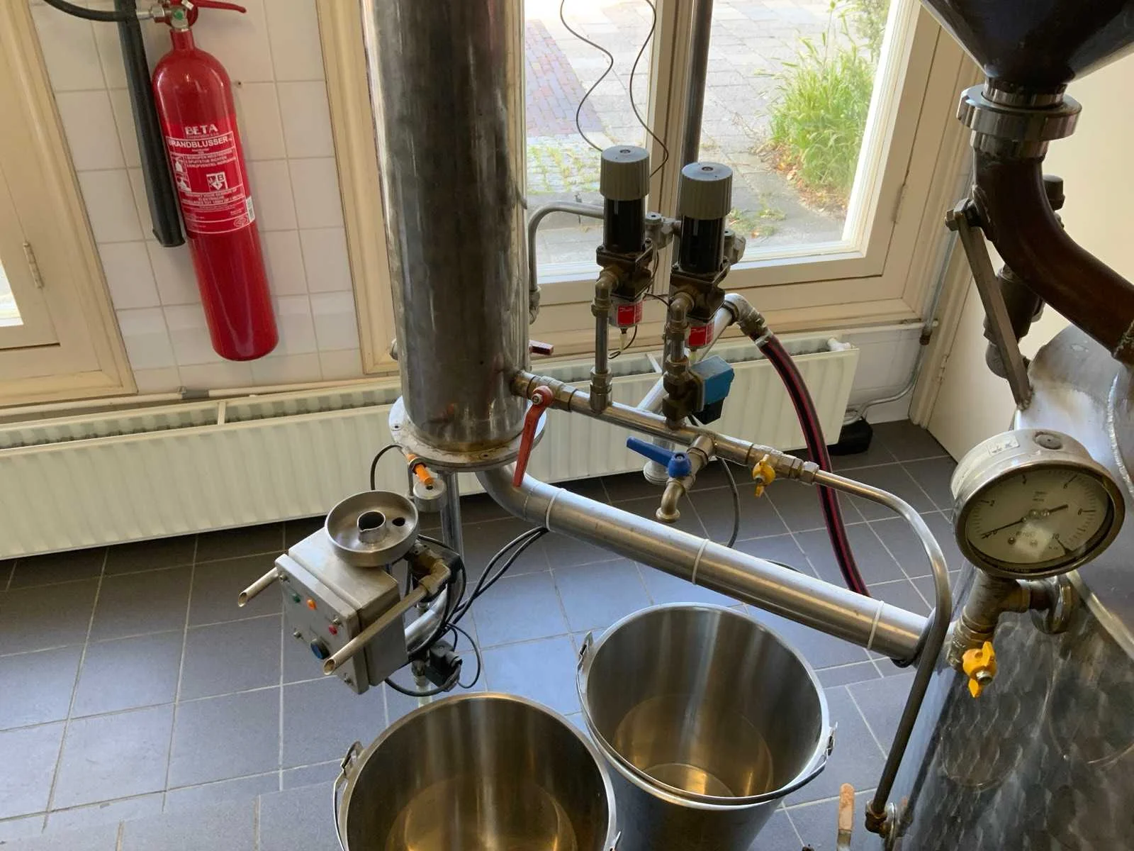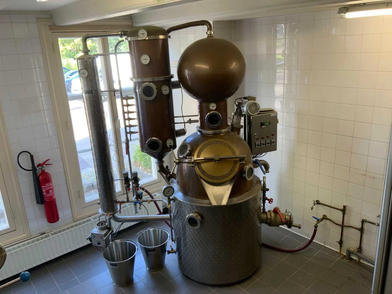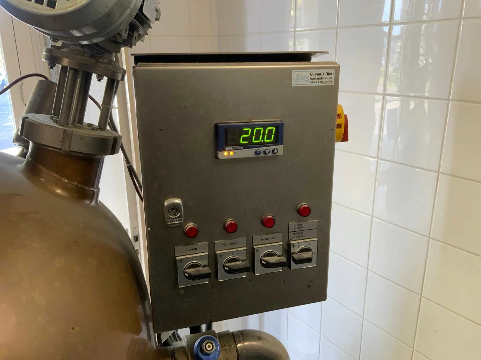 Müller Brennereianlage Typ AROMA IV met aRoMat-verstärker; hoogwaardige vol-koper distilleerinstallatie; model: Typ AROMA IV; waterbad met vuurhaard; koperen ketel 3 mm dik; koud gevormd en gehamerd; keteldiameter 750 mm; aroma-hoed met 100 L stoomruimte en 2 m² koperoppervlak; zijdelingse kolom met geïntegreerde aRoMat-spiraal; RVS buizenkoeler met 1,5 m² koeloppervlak; glockenböden individueel afsluitbaar; sprayball-reinigingssysteem in hoed, kolom en condensor; elektrisch roerwerk met 93 tpm; conische tresteruitloop (Ø 350 mm); verlicht inspectievenster in ketelbrust; heetwatertank 130 L met drukverhogingspomp (tot 6 bar); automatische destillat-trenner DT103 (volgens %vol); centrale besturingskast voor complete systeemaansturing; gepatenteerde Wassergeizer I & II voor terugwinning en verwarming; geïntegreerde koperen katalysator (Kupferadsorber) voor cyanidebinding; extreem aromabehoud dankzij aRoMat-systeem; rendement geoptimaliseerd; onderhoudsvriendelijk; ontwerp volgens Duitse standaard Müller GmbH Nee Merk: Müller Type: Aromat Bouwjaar: 2009 Serienummer: AROMA IV/3535 Aansluiting: 440V Totale afmeting L: 1170mm Totale afmeting Breedte: 2000mm Totale afmeting Hoogte: 2400mm