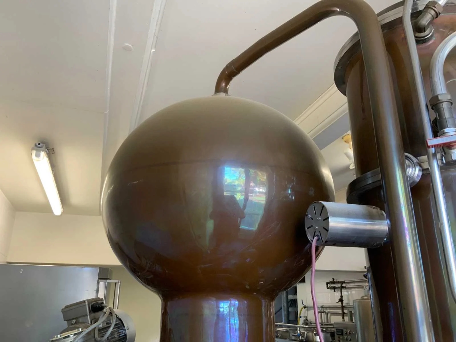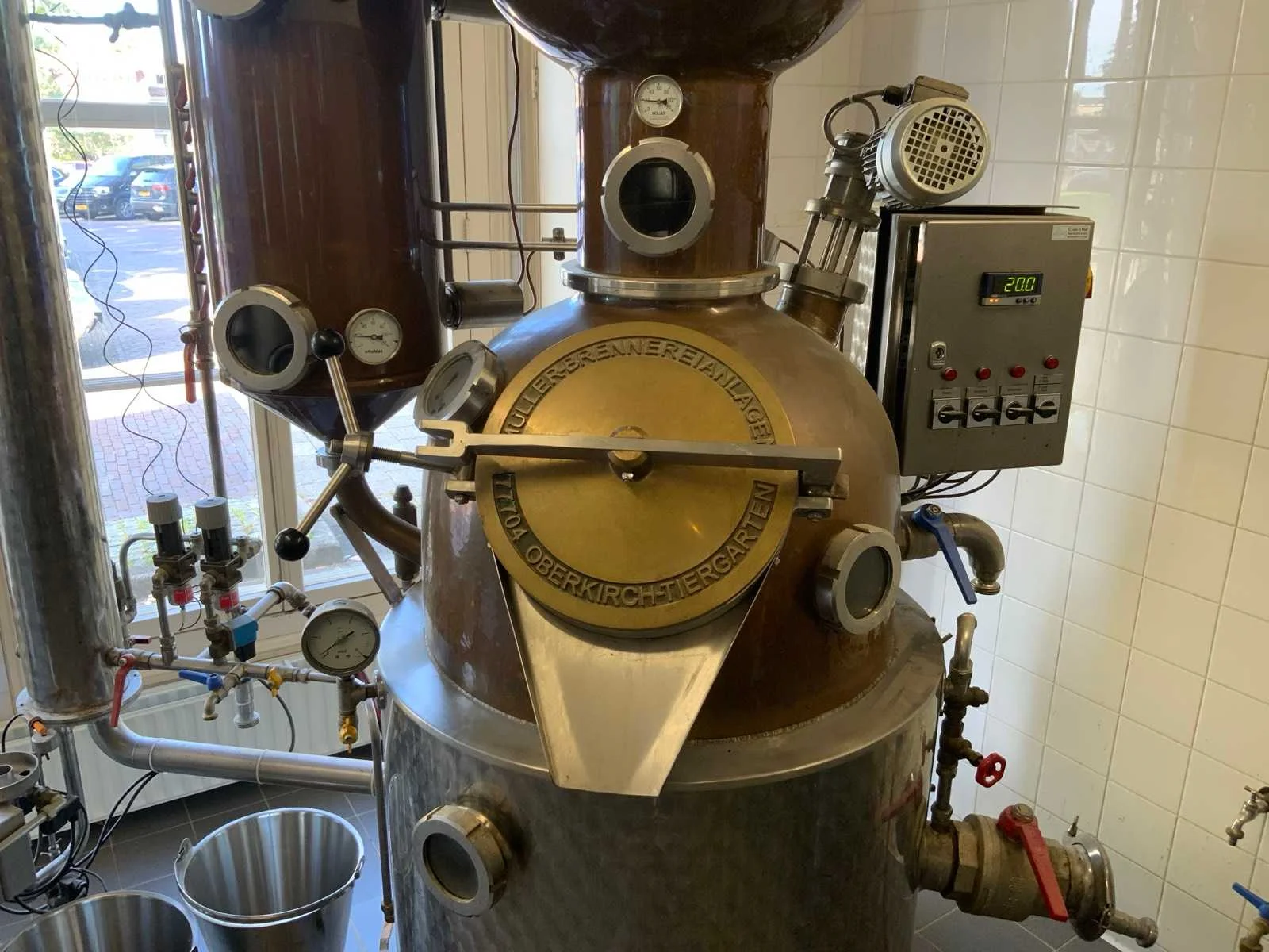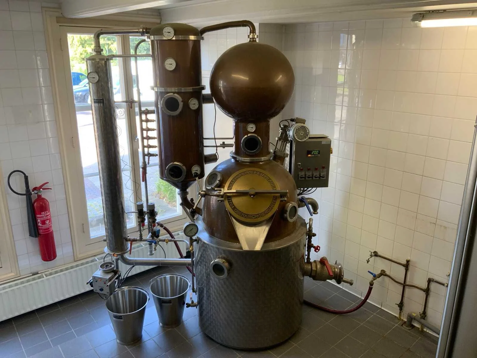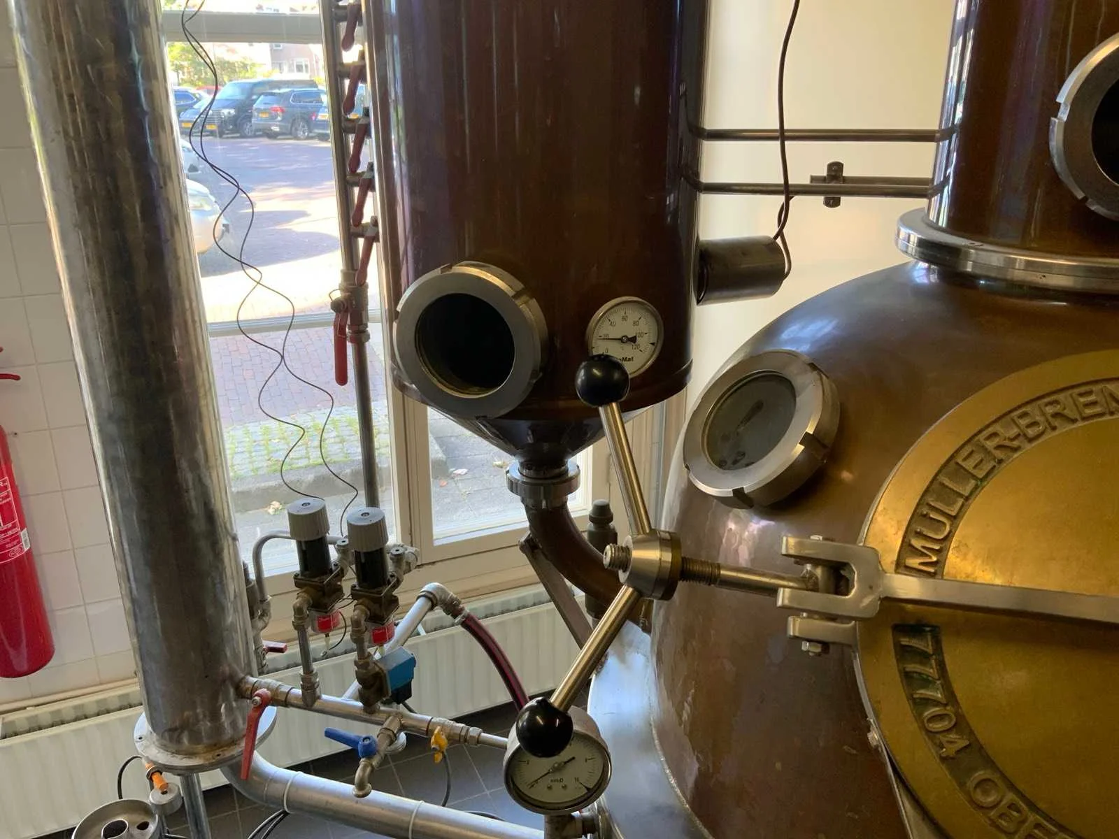 Müller Brennereianlage Typ AROMA IV met aRoMat-verstärker; hoogwaardige vol-koper distilleerinstallatie; model: Typ AROMA IV; waterbad met vuurhaard; koperen ketel 3 mm dik; koud gevormd en gehamerd; keteldiameter 750 mm; aroma-hoed met 100 L stoomruimte en 2 m² koperoppervlak; zijdelingse kolom met geïntegreerde aRoMat-spiraal; RVS buizenkoeler met 1,5 m² koeloppervlak; glockenböden individueel afsluitbaar; sprayball-reinigingssysteem in hoed, kolom en condensor; elektrisch roerwerk met 93 tpm; conische tresteruitloop (Ø 350 mm); verlicht inspectievenster in ketelbrust; heetwatertank 130 L met drukverhogingspomp (tot 6 bar); automatische destillat-trenner DT103 (volgens %vol); centrale besturingskast voor complete systeemaansturing; gepatenteerde Wassergeizer I & II voor terugwinning en verwarming; geïntegreerde koperen katalysator (Kupferadsorber) voor cyanidebinding; extreem aromabehoud dankzij aRoMat-systeem; rendement geoptimaliseerd; onderhoudsvriendelijk; ontwerp volgens Duitse standaard Müller GmbH Nee Merk: Müller Type: Aromat Bouwjaar: 2009 Serienummer: AROMA IV/3535 Aansluiting: 440V Totale afmeting L: 1170mm Totale afmeting Breedte: 2000mm Totale afmeting Hoogte: 2400mm