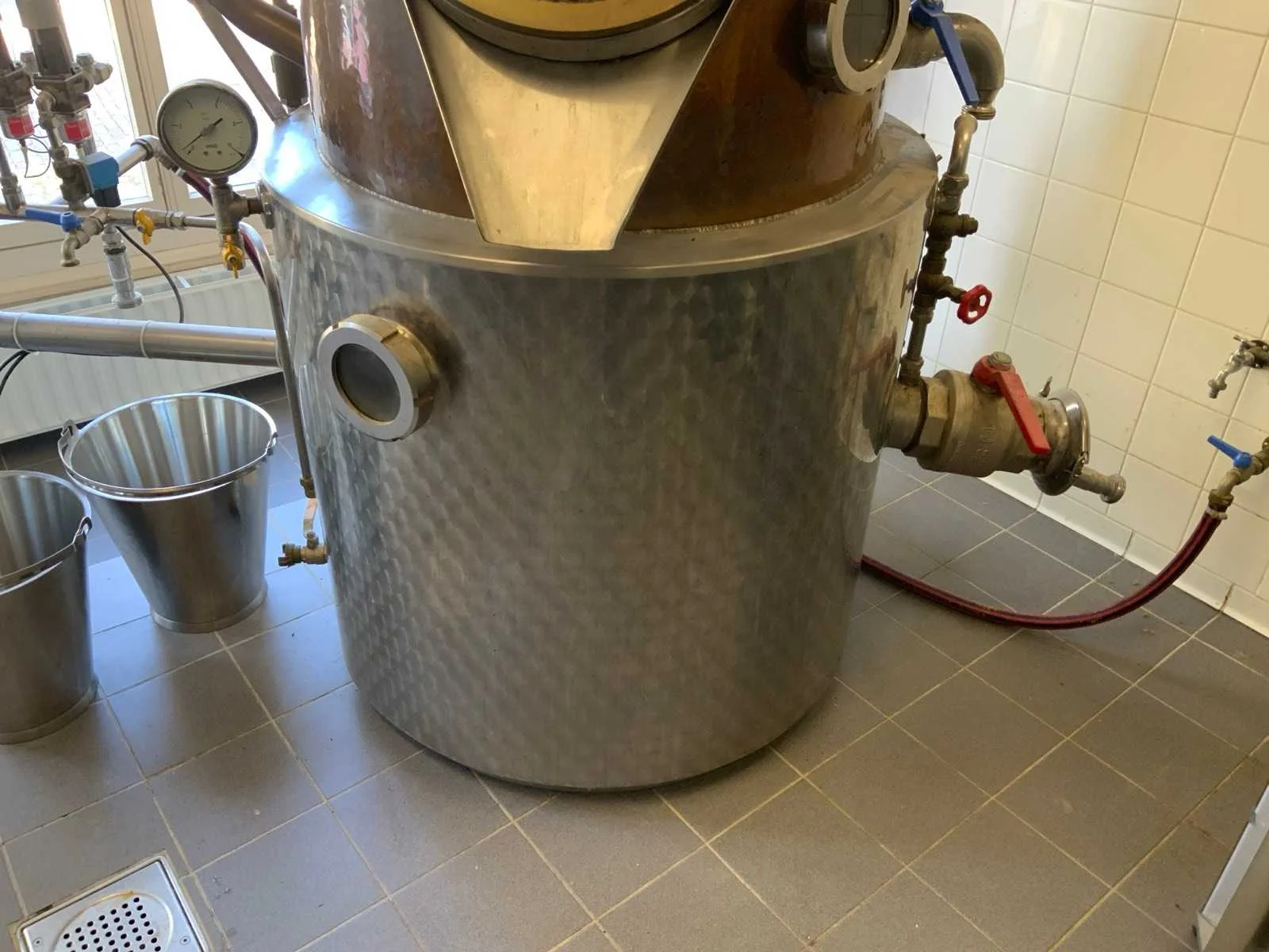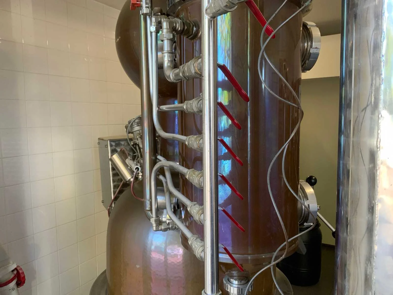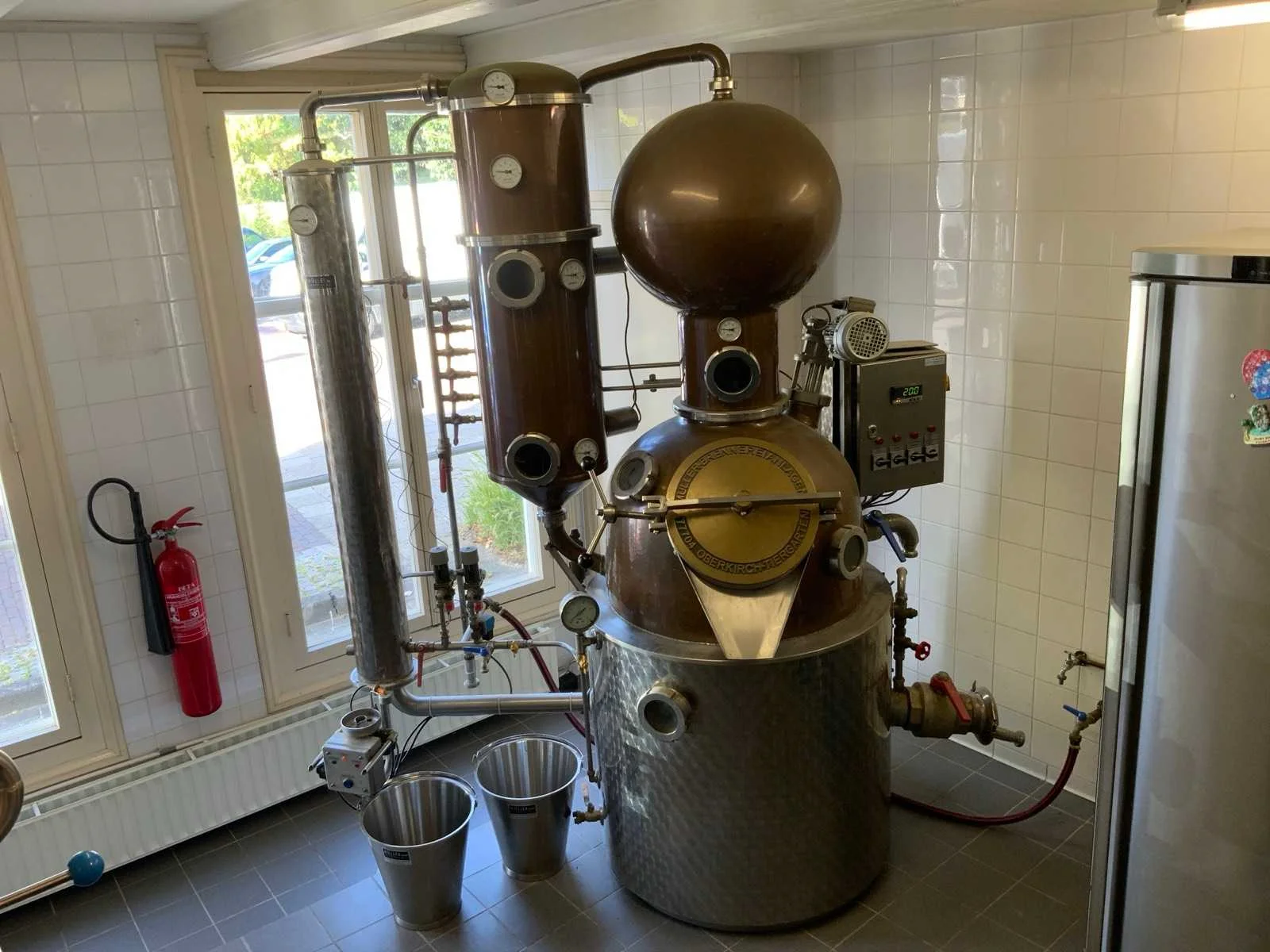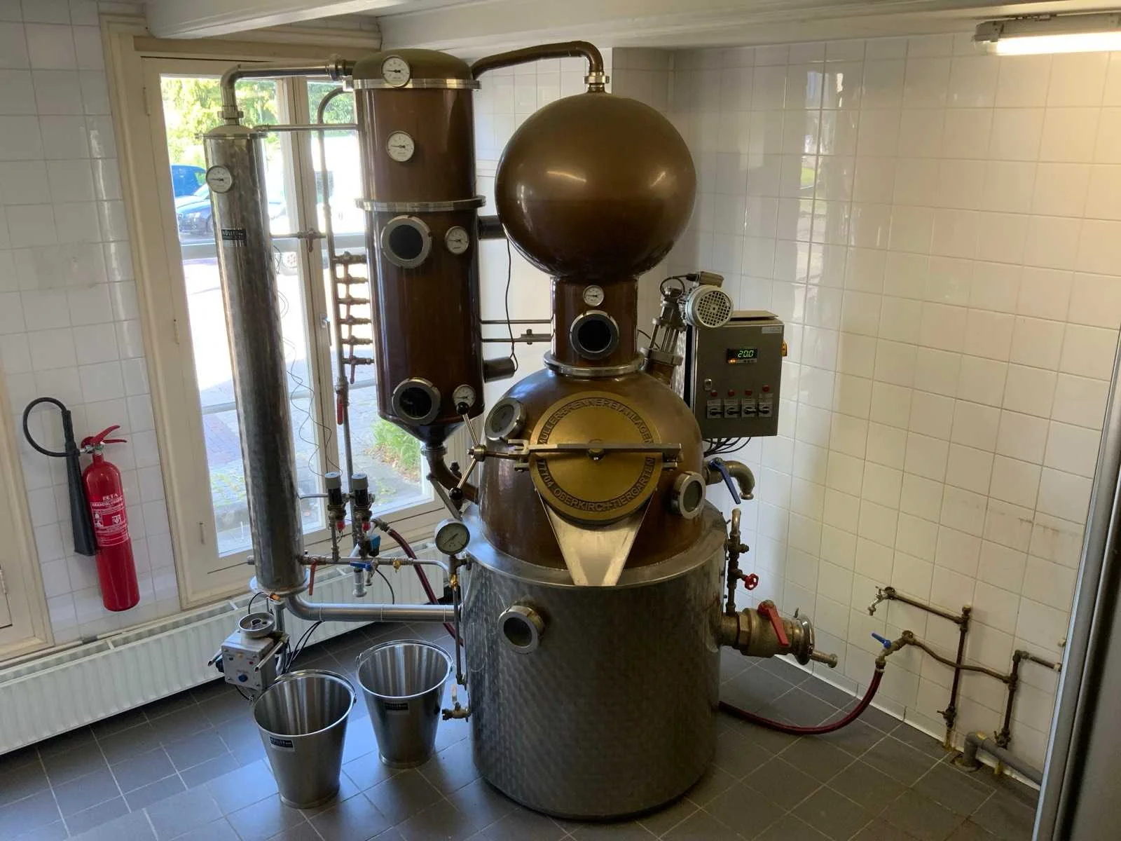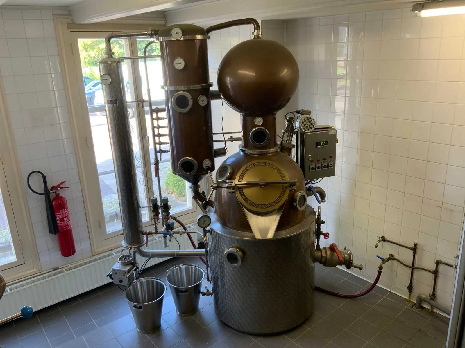 Müller Brennereianlage Typ AROMA IV met aRoMat-verstärker; hoogwaardige vol-koper distilleerinstallatie; model: Typ AROMA IV; waterbad met vuurhaard; koperen ketel 3 mm dik; koud gevormd en gehamerd; keteldiameter 750 mm; aroma-hoed met 100 L stoomruimte en 2 m² koperoppervlak; zijdelingse kolom met geïntegreerde aRoMat-spiraal; RVS buizenkoeler met 1,5 m² koeloppervlak; glockenböden individueel afsluitbaar; sprayball-reinigingssysteem in hoed, kolom en condensor; elektrisch roerwerk met 93 tpm; conische tresteruitloop (Ø 350 mm); verlicht inspectievenster in ketelbrust; heetwatertank 130 L met drukverhogingspomp (tot 6 bar); automatische destillat-trenner DT103 (volgens %vol); centrale besturingskast voor complete systeemaansturing; gepatenteerde Wassergeizer I & II voor terugwinning en verwarming; geïntegreerde koperen katalysator (Kupferadsorber) voor cyanidebinding; extreem aromabehoud dankzij aRoMat-systeem; rendement geoptimaliseerd; onderhoudsvriendelijk; ontwerp volgens Duitse standaard Müller GmbH Nee Merk: Müller Type: Aromat Bouwjaar: 2009 Serienummer: AROMA IV/3535 Aansluiting: 440V Totale afmeting L: 1170mm Totale afmeting Breedte: 2000mm Totale afmeting Hoogte: 2400mm