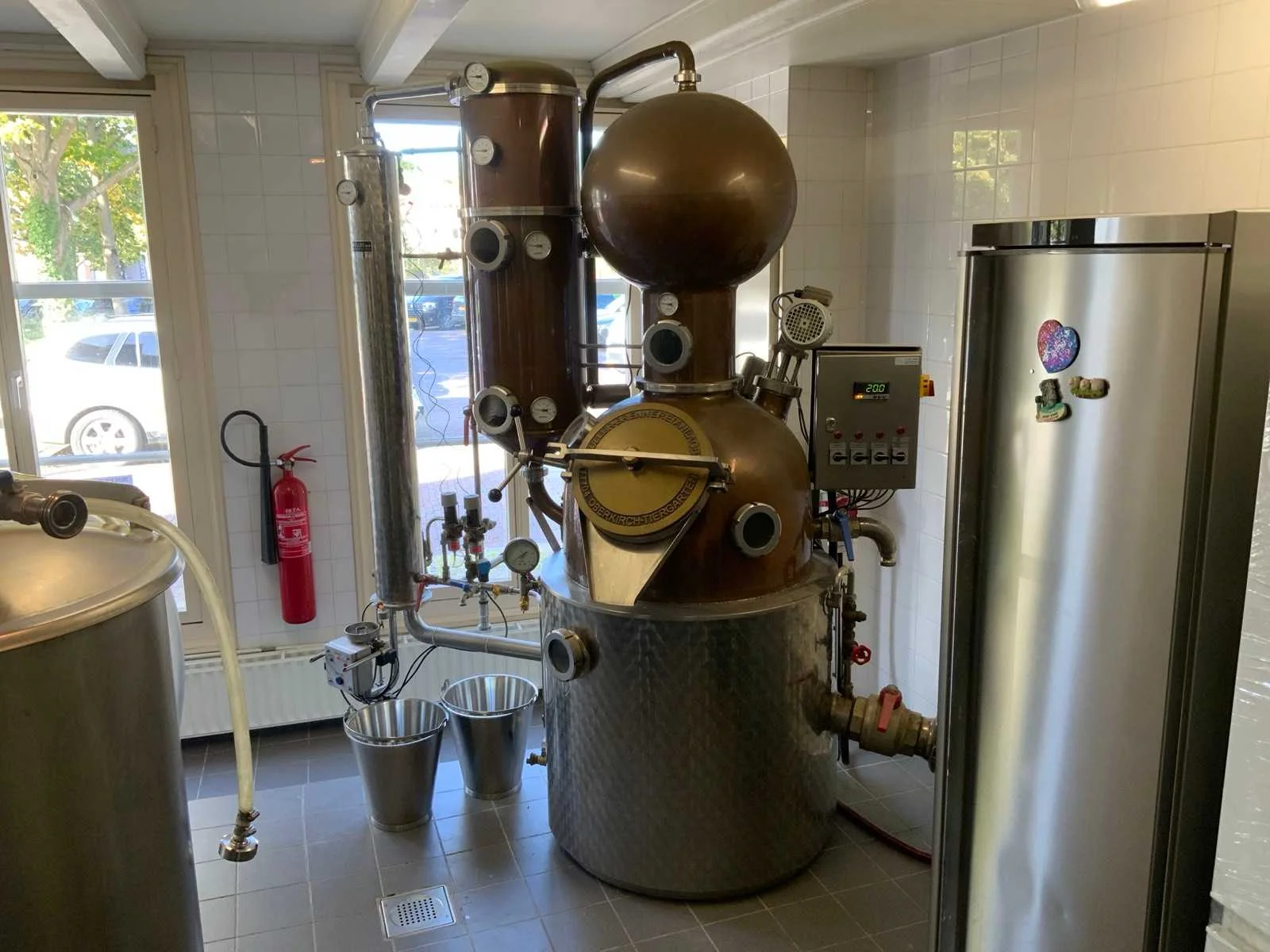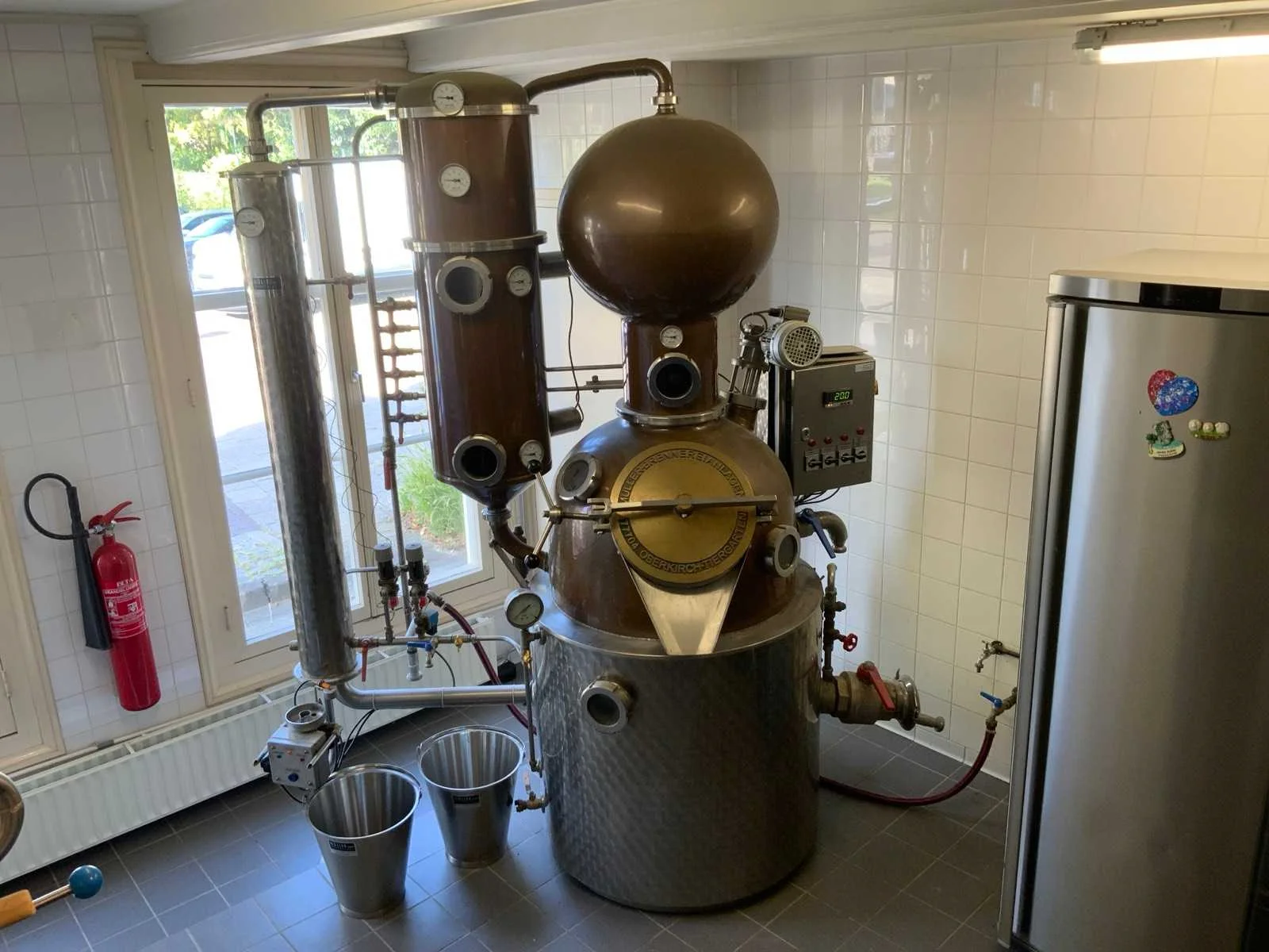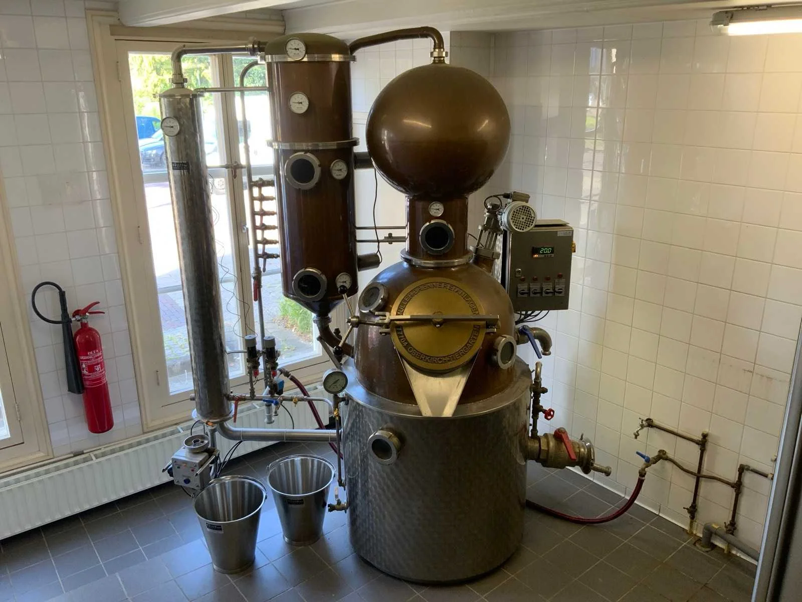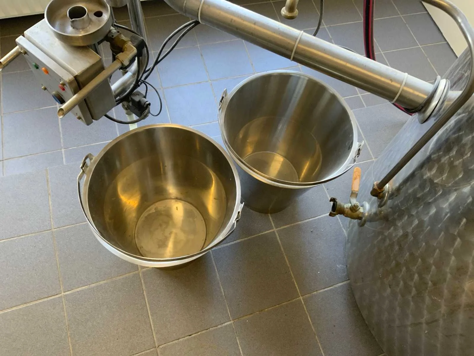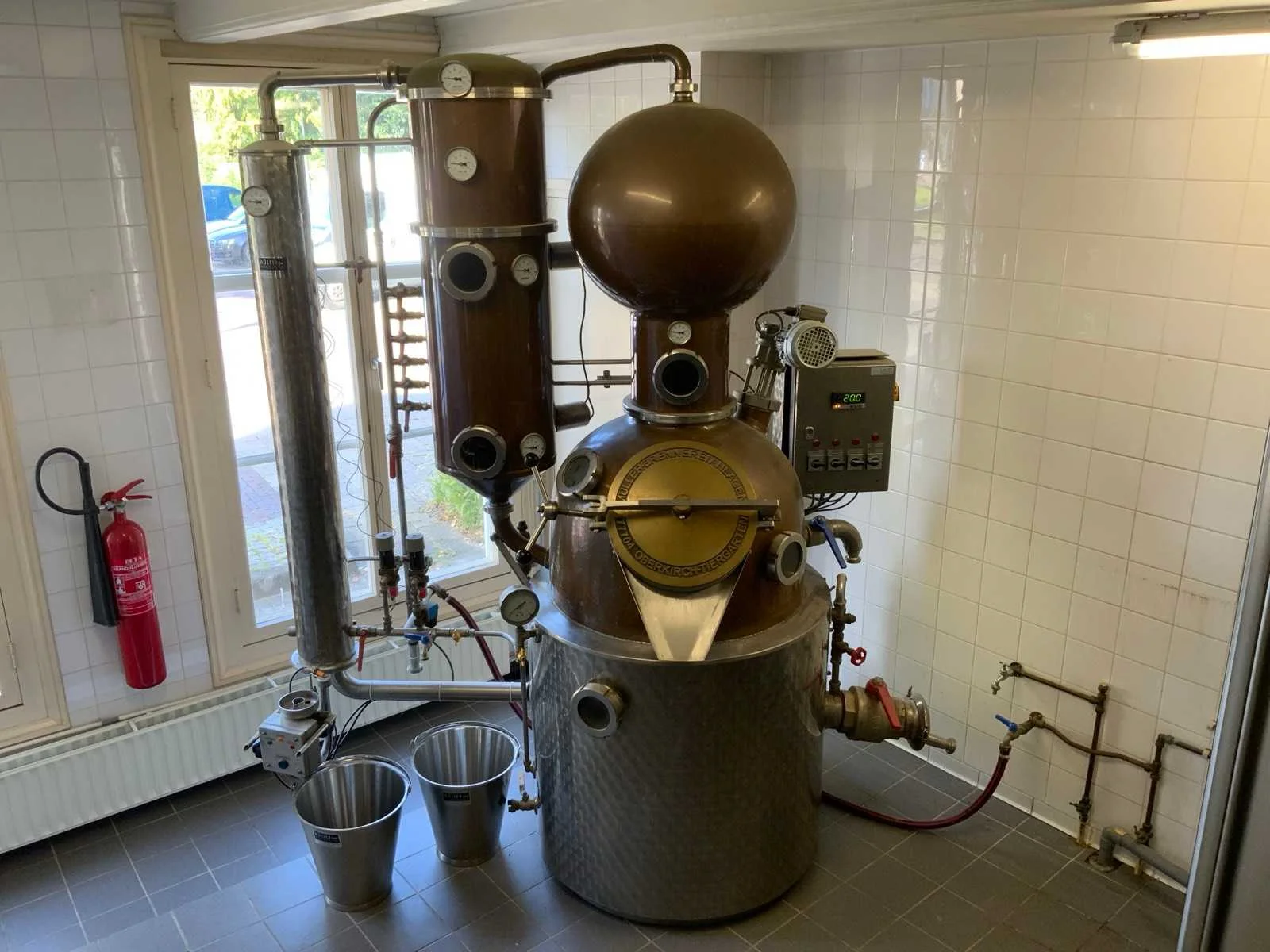 Müller Brennereianlage Typ AROMA IV met aRoMat-verstärker; hoogwaardige vol-koper distilleerinstallatie; model: Typ AROMA IV; waterbad met vuurhaard; koperen ketel 3 mm dik; koud gevormd en gehamerd; keteldiameter 750 mm; aroma-hoed met 100 L stoomruimte en 2 m² koperoppervlak; zijdelingse kolom met geïntegreerde aRoMat-spiraal; RVS buizenkoeler met 1,5 m² koeloppervlak; glockenböden individueel afsluitbaar; sprayball-reinigingssysteem in hoed, kolom en condensor; elektrisch roerwerk met 93 tpm; conische tresteruitloop (Ø 350 mm); verlicht inspectievenster in ketelbrust; heetwatertank 130 L met drukverhogingspomp (tot 6 bar); automatische destillat-trenner DT103 (volgens %vol); centrale besturingskast voor complete systeemaansturing; gepatenteerde Wassergeizer I & II voor terugwinning en verwarming; geïntegreerde koperen katalysator (Kupferadsorber) voor cyanidebinding; extreem aromabehoud dankzij aRoMat-systeem; rendement geoptimaliseerd; onderhoudsvriendelijk; ontwerp volgens Duitse standaard Müller GmbH Nee Merk: Müller Type: Aromat Bouwjaar: 2009 Serienummer: AROMA IV/3535 Aansluiting: 440V Totale afmeting L: 1170mm Totale afmeting Breedte: 2000mm Totale afmeting Hoogte: 2400mm