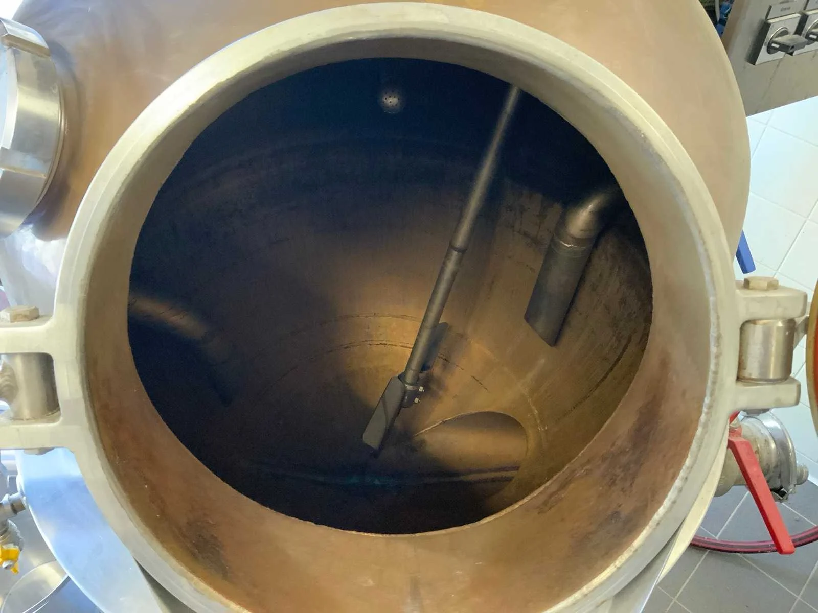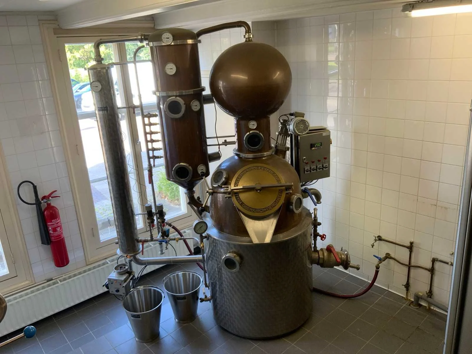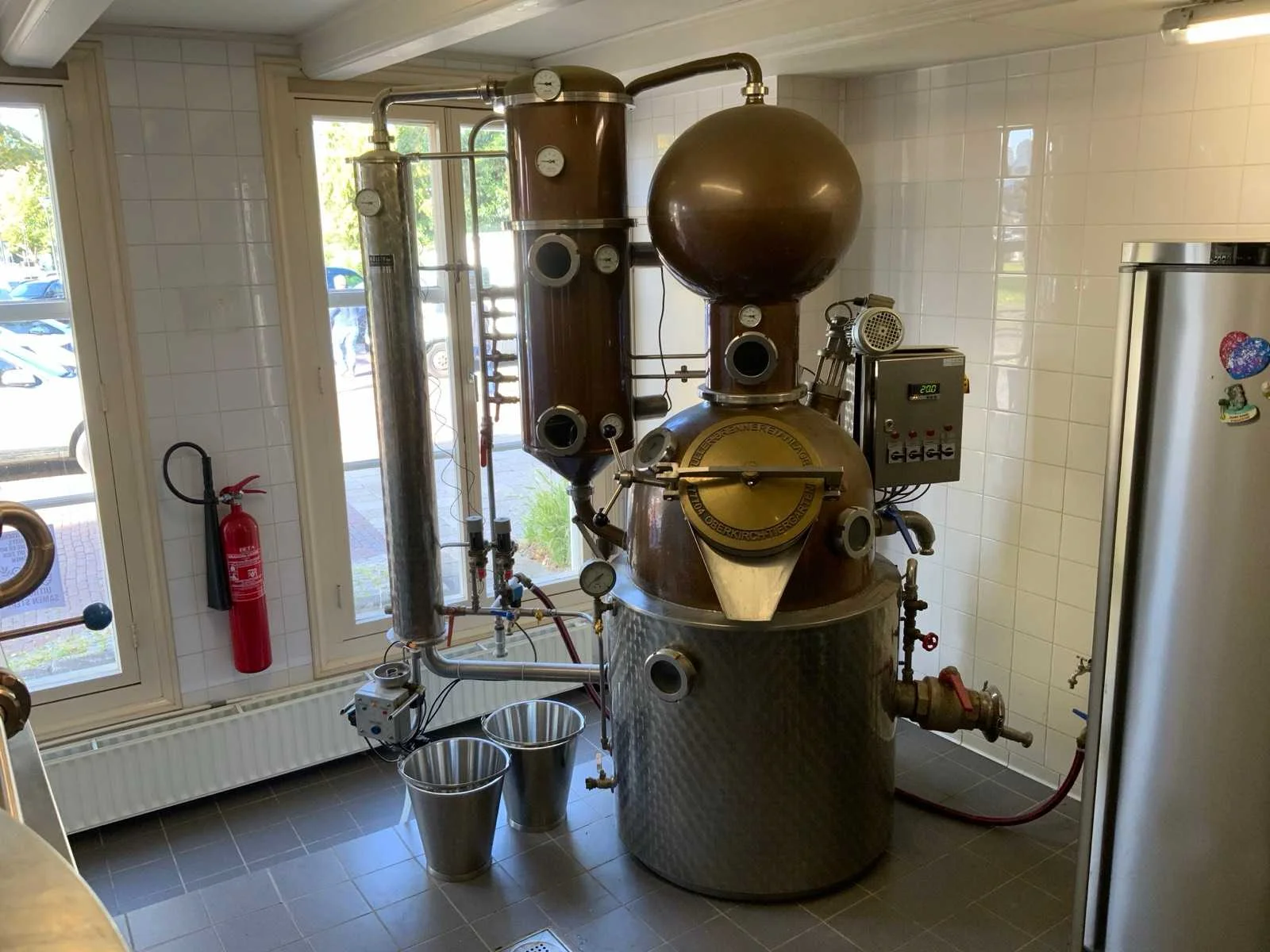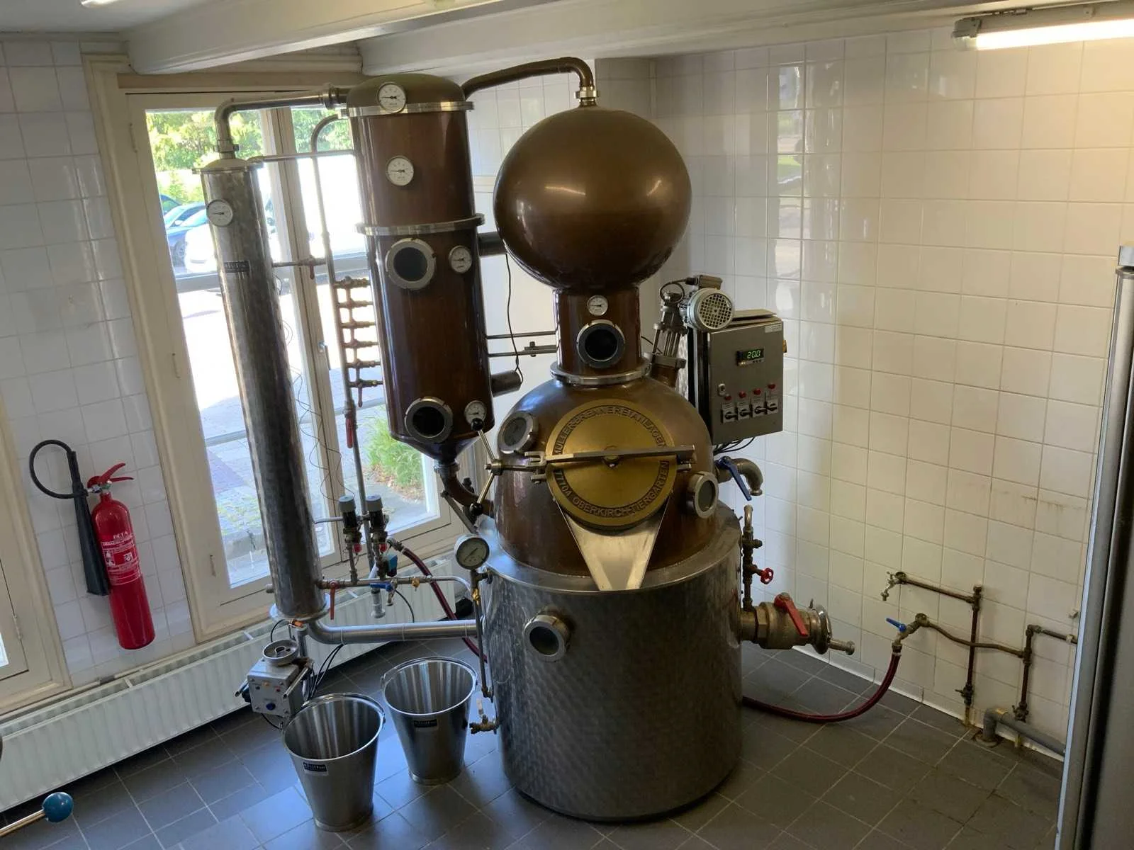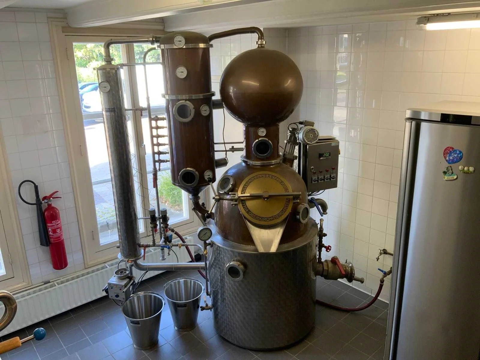 Müller Brennereianlage Typ AROMA IV met aRoMat-verstärker; hoogwaardige vol-koper distilleerinstallatie; model: Typ AROMA IV; waterbad met vuurhaard; koperen ketel 3 mm dik; koud gevormd en gehamerd; keteldiameter 750 mm; aroma-hoed met 100 L stoomruimte en 2 m² koperoppervlak; zijdelingse kolom met geïntegreerde aRoMat-spiraal; RVS buizenkoeler met 1,5 m² koeloppervlak; glockenböden individueel afsluitbaar; sprayball-reinigingssysteem in hoed, kolom en condensor; elektrisch roerwerk met 93 tpm; conische tresteruitloop (Ø 350 mm); verlicht inspectievenster in ketelbrust; heetwatertank 130 L met drukverhogingspomp (tot 6 bar); automatische destillat-trenner DT103 (volgens %vol); centrale besturingskast voor complete systeemaansturing; gepatenteerde Wassergeizer I & II voor terugwinning en verwarming; geïntegreerde koperen katalysator (Kupferadsorber) voor cyanidebinding; extreem aromabehoud dankzij aRoMat-systeem; rendement geoptimaliseerd; onderhoudsvriendelijk; ontwerp volgens Duitse standaard Müller GmbH Nee Merk: Müller Type: Aromat Bouwjaar: 2009 Serienummer: AROMA IV/3535 Aansluiting: 440V Totale afmeting L: 1170mm Totale afmeting Breedte: 2000mm Totale afmeting Hoogte: 2400mm