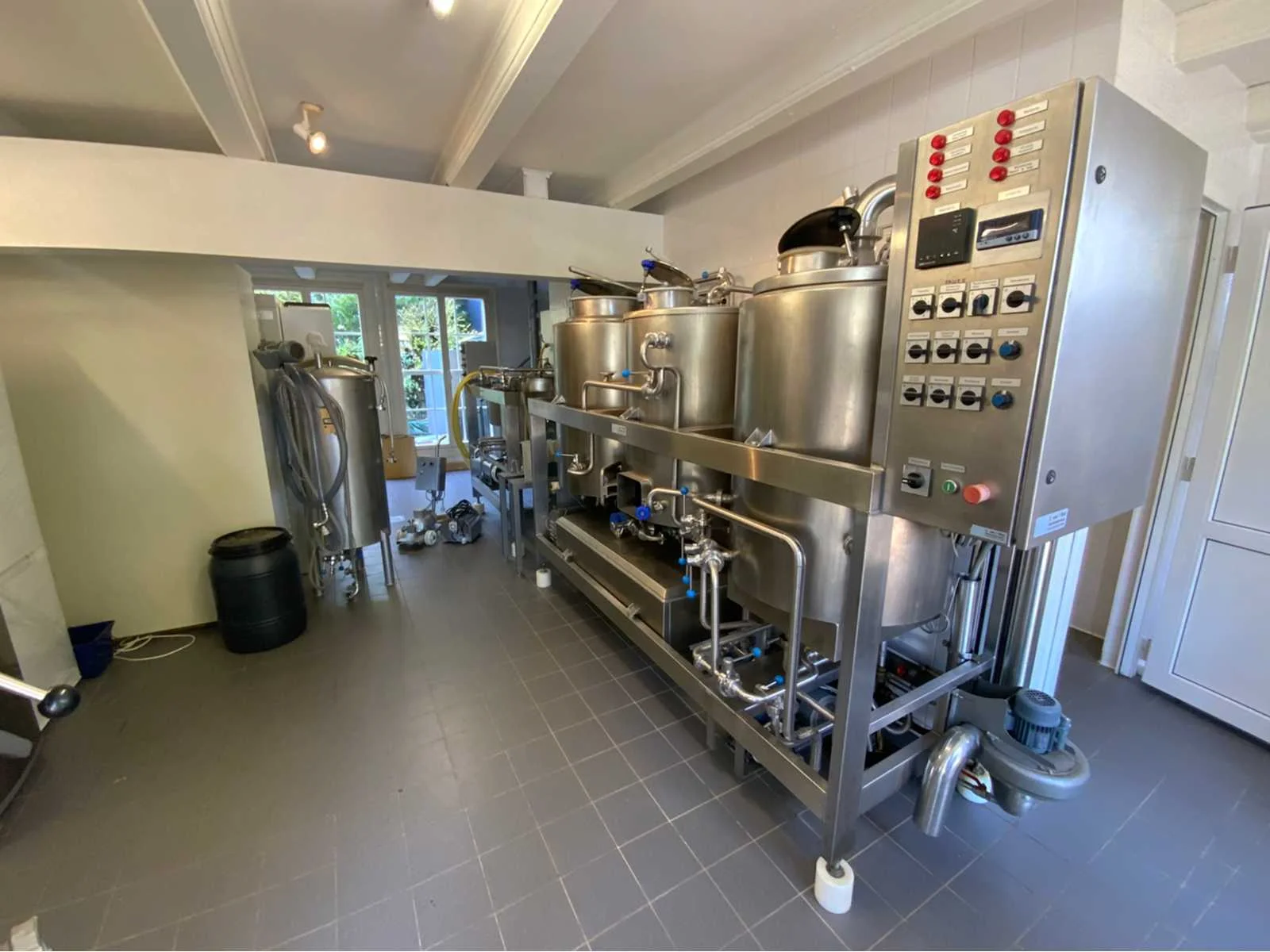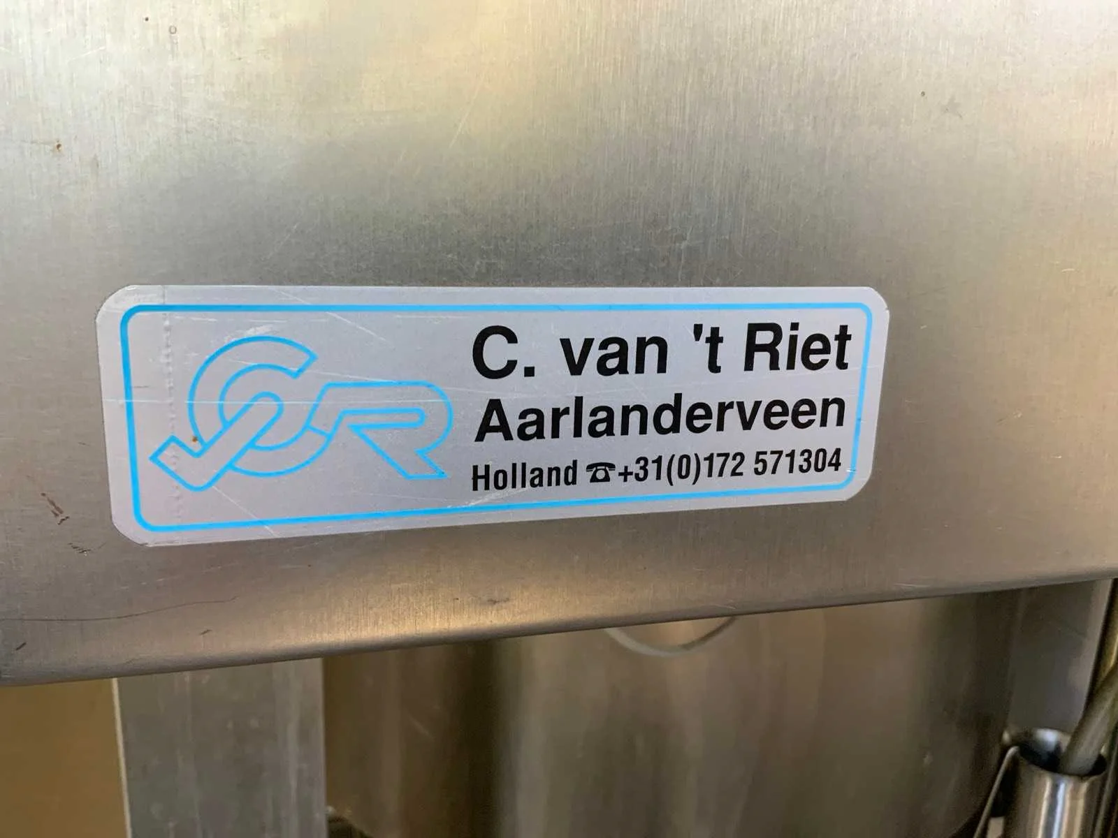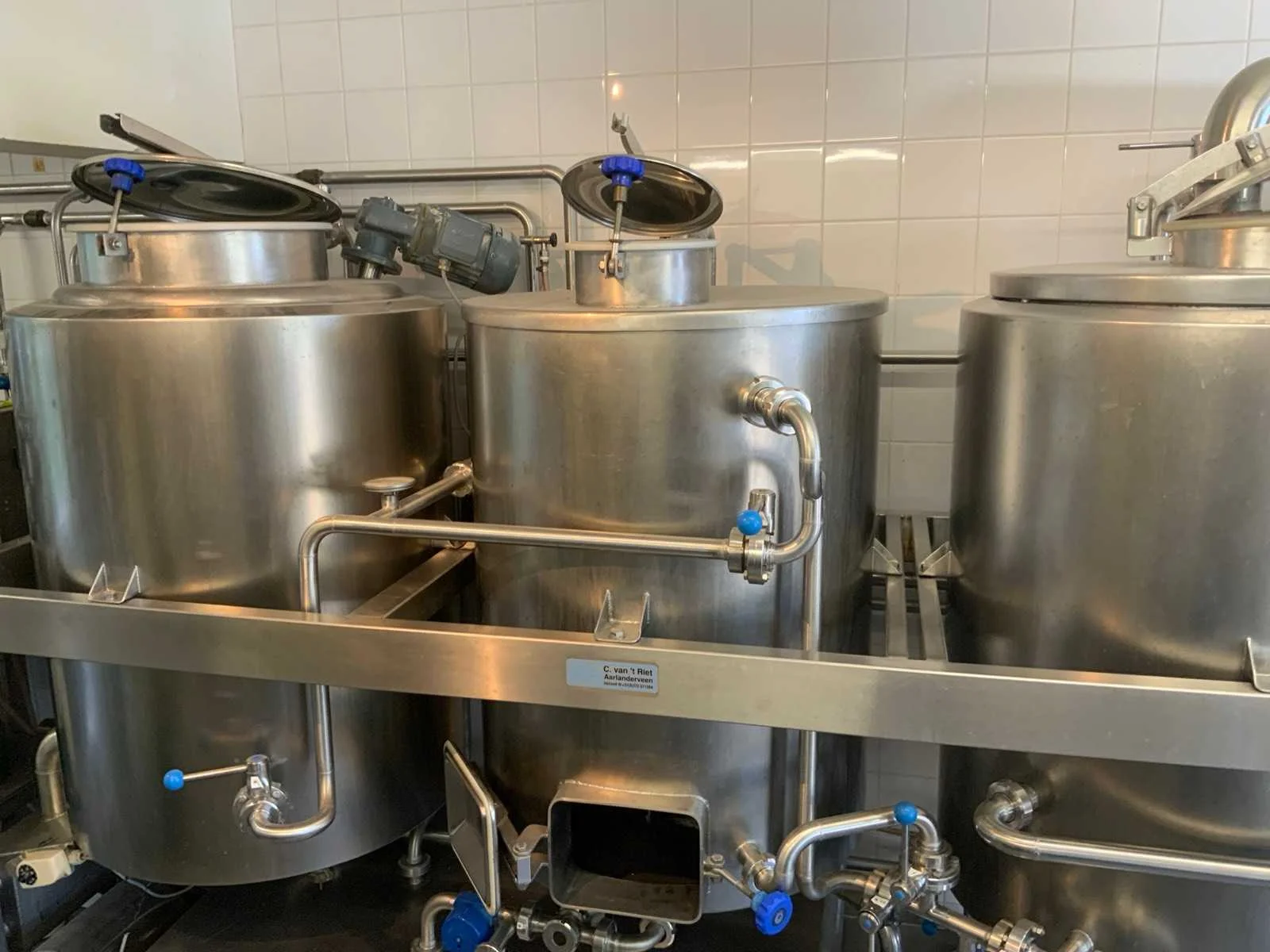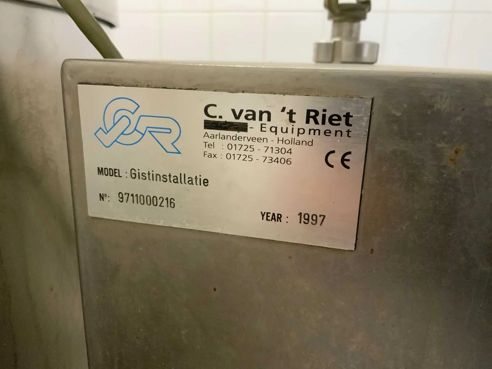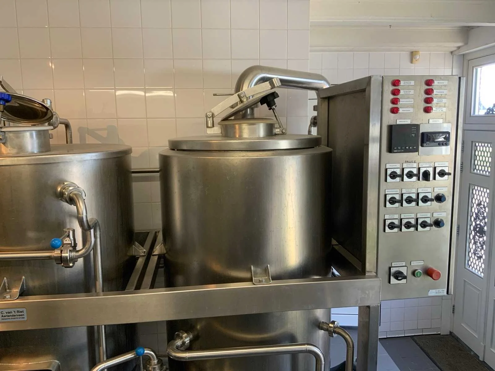 Voorzien van koelcel met koelunit “Polair MM 111 SF” (recent vervangen, binnenmaten: D1890 x B1920 x H1960 mm); 5 lageringvaten van 200 L; 1 afvulvat van 200 L met roermechanisme aangedreven door Nord SK 64L/4 motor (0,18 kW); Rotor-pomp voor afvullen van bierfusten; extra pomp van C. van ‘t Riet voor transport van hoofdvergistingsvloeistof naar lagervaten; complete brouwinstallatie type 9711000116, bouwjaar 1997 (920x3000x2100 mm); maischketel 250 L met Nord-roerwerk en indirecte verwarming via dubbelwandige waterbuffer (2 x 6 kW verwarmingselementen, uitbreiding tot 18 kW mogelijk); spoelfilterketel 250 L met geperforeerde filterplaat, pijlglas, terugfiltermechanisme, reinigingsluik (235x185 mm); kookketel 250 L met oliegevulde dubbelwandige verwarming (2 x 6 kW + uitbreidbaar), geïsoleerd deksel met sproeibol en RVS NW100 condensleiding, ventilator en watervernevelaar; opvang- en uitloopreservoir 157 L met schuine bodem, NW50 uitloop; besturingskast met digitale temperatuurregeling en software; CIP-unit type 0001000418, bouwjaar 2000 (890x1610x1710 mm), met twee RVS reinigingsketels van elk 100 L, dubbele wand met indirecte verwarming (2 x 6 kW), FP4600 reinigingspomp, aparte RVS besturingskast en volledige leidingwerkset; gistinstallatie type 9711000216, bouwjaar 1997 (1100x2300x1900 mm); twee dubbelwandige hoofdvergistingsvaten van 280 L met koelwatercirculatie, roerwerk, sproeibol en beluchtingspijp; platenkoeler type Sigma 7 (300 L/u capaciteit, 7000 L/u koelwater); chiller model TEA 081 (koelvermogen 27 kW, 1650x743x1350 mm, max. 8 kW); 2 platenwisselaars type 410/40; 2 RVS frames, in hoogte verstelbaar; uitgebreid RVS leidingwerk inclusief vlinderkleppen, T-stukken, puntstukken, koelleidingen en kijkglas; digitale pH-meter HI9024; geïsoleerde kweekkast met ventilatie en temperatuurregeling (440x640x480 mm); thermostatische mengkraan (50–90 °C, met thermometeraansluiting); watermeter met elektronische uitlezing en optionele PC-aansluiting. Nee Merk: C. van ‘t Riet