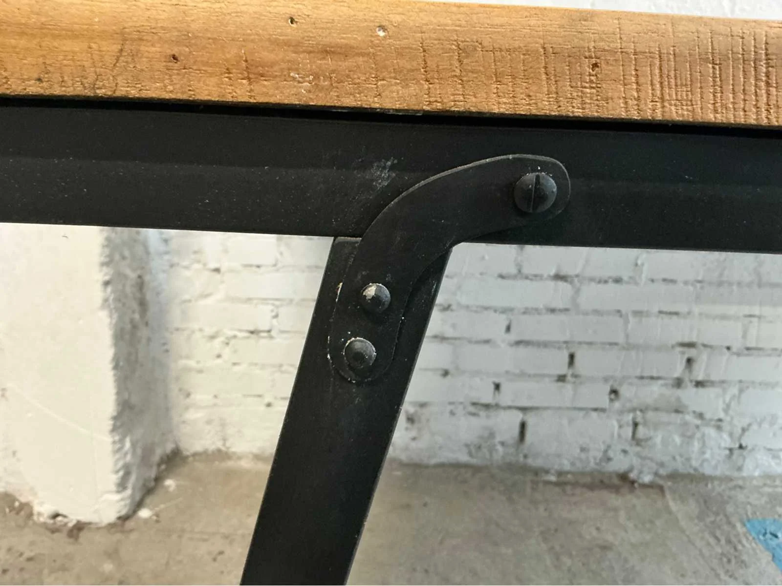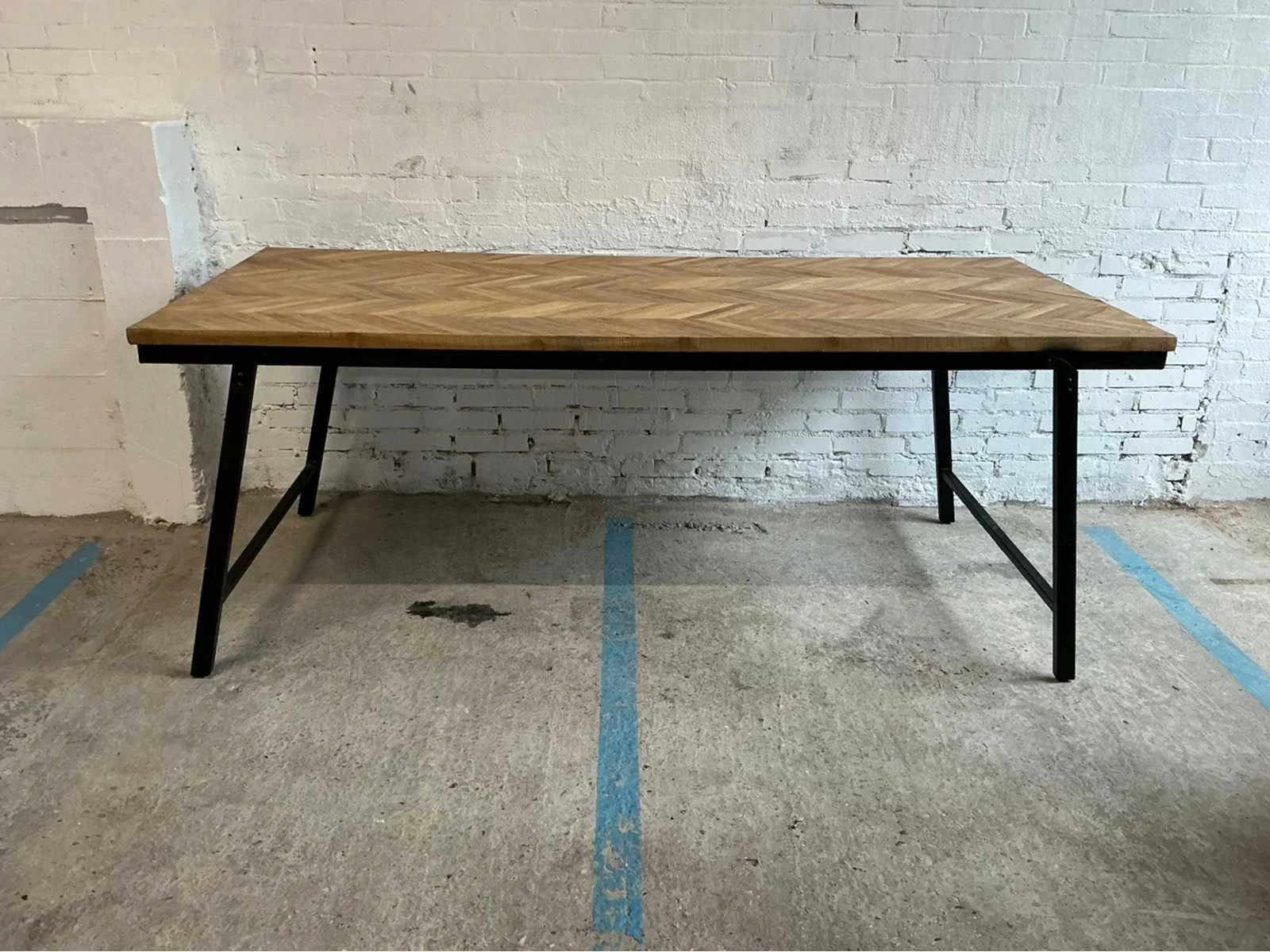 Robuust visgraatmotief, stalen tafel, massief houten tafelblad met vigneerlaag. Nee Model: Visgraatmotief, massief hout met vigneerlaag Zitplaatsen: 8 Lengte: 200cm Breedte: 90cm Hoogte: 77cm