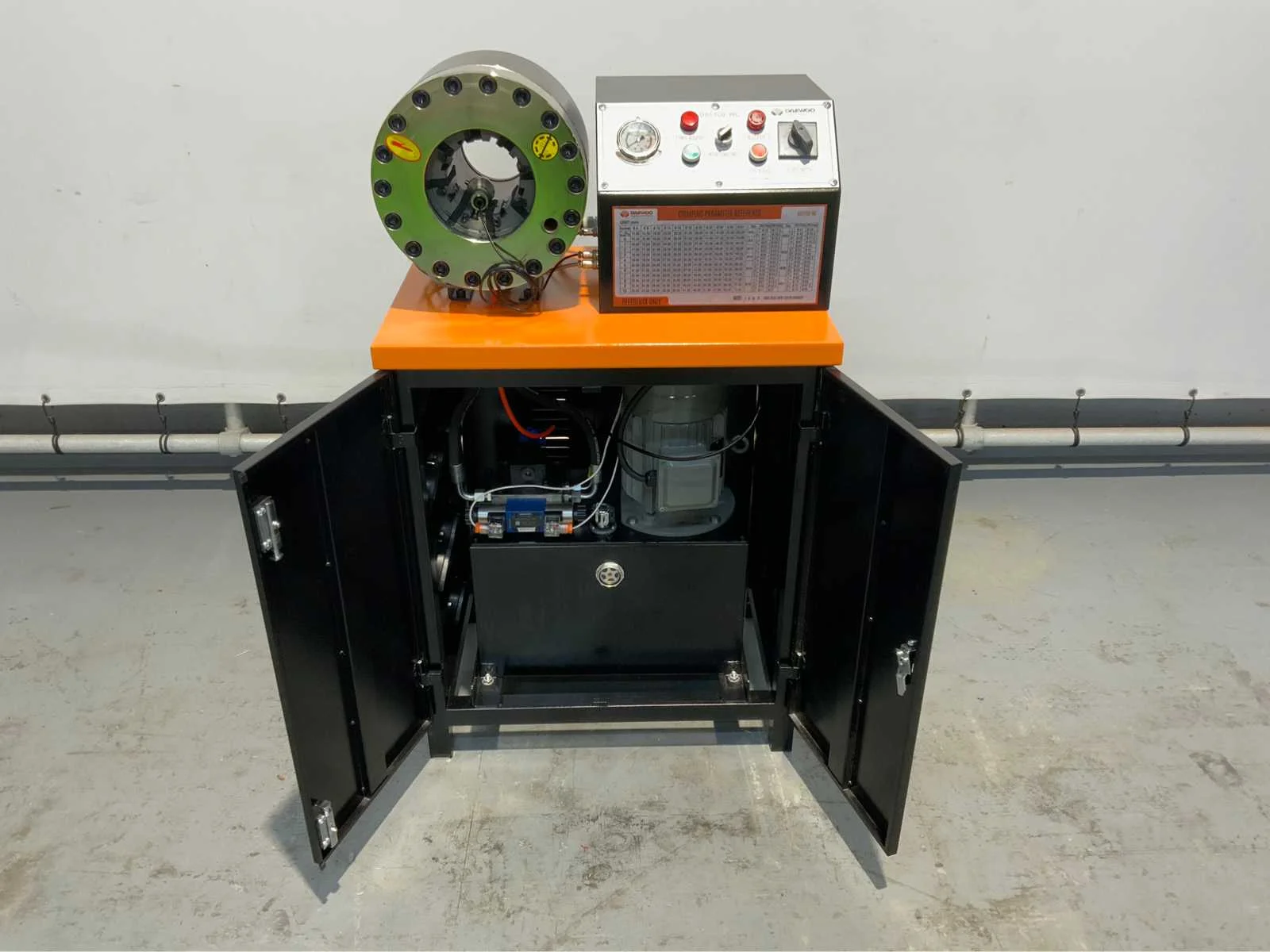 Hydraulische slangenpers; Krimpbereik: 15-63mm, Max opening: 75mm, Voltage: 380V, Wattage: 3000W, Druk: 53,5 Mpa Verpakking formaat: 780x540x1350 Gewicht Incl. Verpakking: 280 Kg Ongebruikt. Nee Merk: Daewoo Type: DA5100-HC Bouwjaar: 2025 Capaciteit.: 500t Elektro-hydraulisch: true Tafel afmeting l: 500mm Tafel afmeting b: 710mm Aansluiting: 380V Machinegewicht: 246kg Afmeting l: 500mm Afmeting b: 730mm Afmeting h: 1220mm