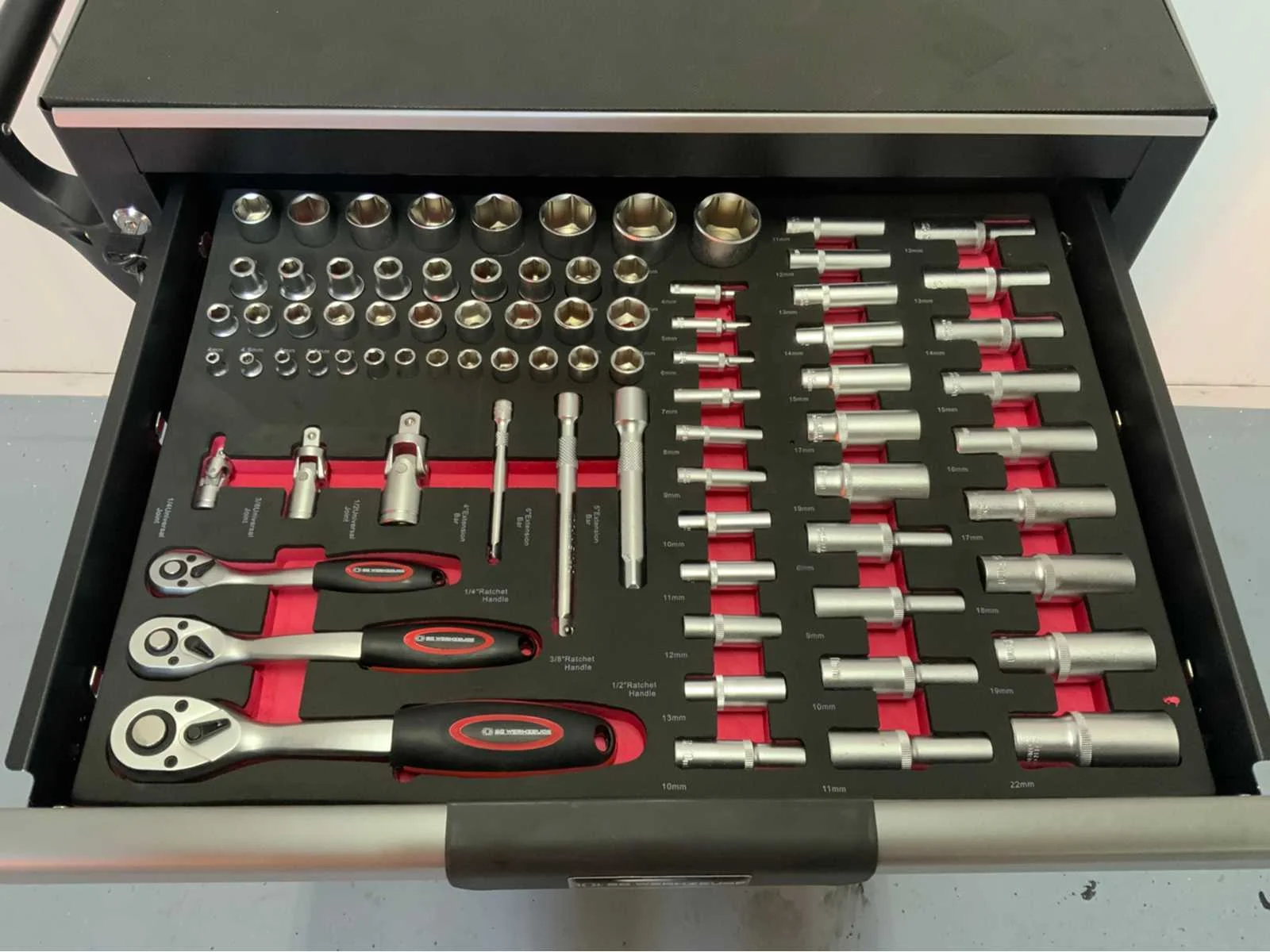 Gereedschapswagen met 7 lades; 266 pcs Inclusief gereedschap. Nee Merk: SG Werkzeuge Type: 7-Laden Bouwjaar: 2025 Met inhoud: true Eigen gewicht: 75kg Totale afmeting L: 460mm Totale afmeting Breedte: 680mm Totale afmeting Hoogte: 970mm