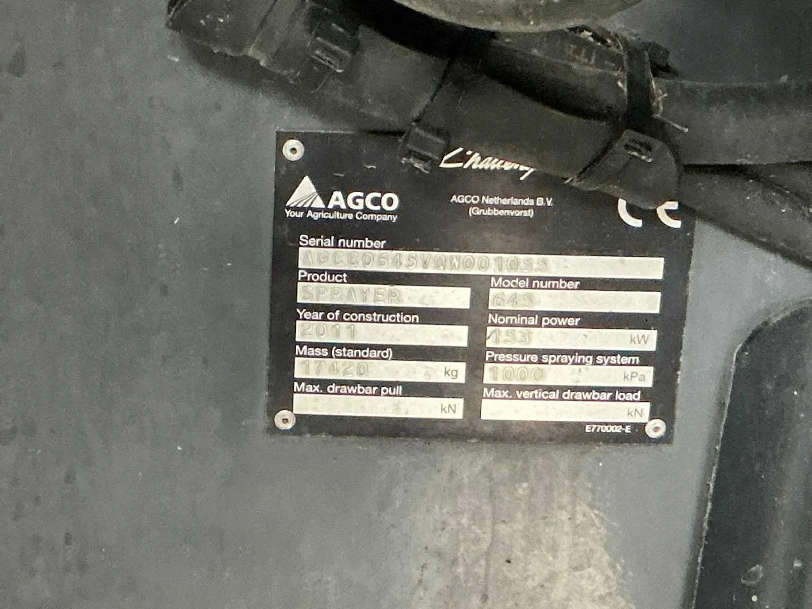 Voorzien van: Extra set banden breed voor grasland, nieuwe RVS pomp, GPS Topcon, 5417 uur op de teller. volledig RTK sectie afsluiting. Vloeibare kunstmest doppen. De Challenger Rogator RG 645 is een zelfrijdende spuitmachine van AGCO uit 2011, met een nominaal vermogen van 153 kW (≈ 208 pk), een standaardgewicht van 13.420 kg, een druksysteem van 1000 kPa (≈ 10 bar), een tankinhoud van 5.000 liter, een hydraulisch inklapbare spuitboom van 28 meter, een rijsnelheid van 40 km/h, een bodemvrijheid van ca. 120 cm, een hydrostatische traploze transmissie en een overdrukcabine met Topcon GPS-besturing. Nee Merk: Challenger Type: Rogator RG 645 Bouwjaar: 2011 Serienummer: AGCC0645VQW001055 Kenteken: TJF-22-P Capaciteit.: 500l/min Spuitboombreedte: 28m Tankinhoud: 5000l Bandenmaat: 480/80R50 Voorzien van verlichting: true Boordcomputer: true Schoonwatertank: true Sectie afsluiting: true Zelfrijdend: true Eigen gewicht: 13420kg Totale afmeting L: 9000mm Totale afmeting Breedte: 3000mm Totale afmeting Hoogte: 3800mm