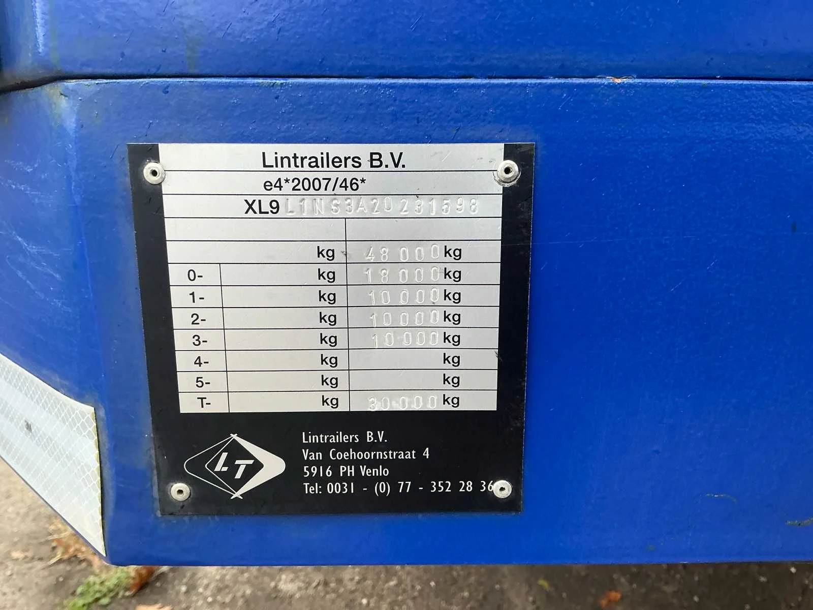 Voorzien van: Lengte (L): 1250-1750 cm, afstand hart koppeling tot achterzijde voertuig (b): 1110-1610 cm, wielbasis: 997-1497 cm, semi-dieplader, bedhoogte 90 centimeter, 3-assig, maximaal 5 meter uitschuifbaar, voorzien in een verbreder voor rupsmachines, en twistlock voor het zekeren of bevestigen van containers en wissellaadbakken, as 1 lift as, as 3 meelopend gestuurd, verbreders incl. borden, dubbele kist, massa rijklaar 9000 kg, massa ledig voertuig 9000 kg. technische max. massa voertuig 48000 kg. toegestane max. massa voertuig 48000 kg. Nee Merk: Lintrailers Type: S3A Model: 14LSDU Kenteken: OR-96-KV Bouwjaar: 2020 Chassisnummer: 1830BB0XXN0A Chassisnummer VIN: 1830BB0XXN0A Laadvermogen: 39180kg Kleur: niet van toepassing Datum eerste toelating: 2018-08-27 Datum eerste toelating (NL): 2018-08-27 APK vervaldatum: 2026-08-27 Hydraulische laadklep: true