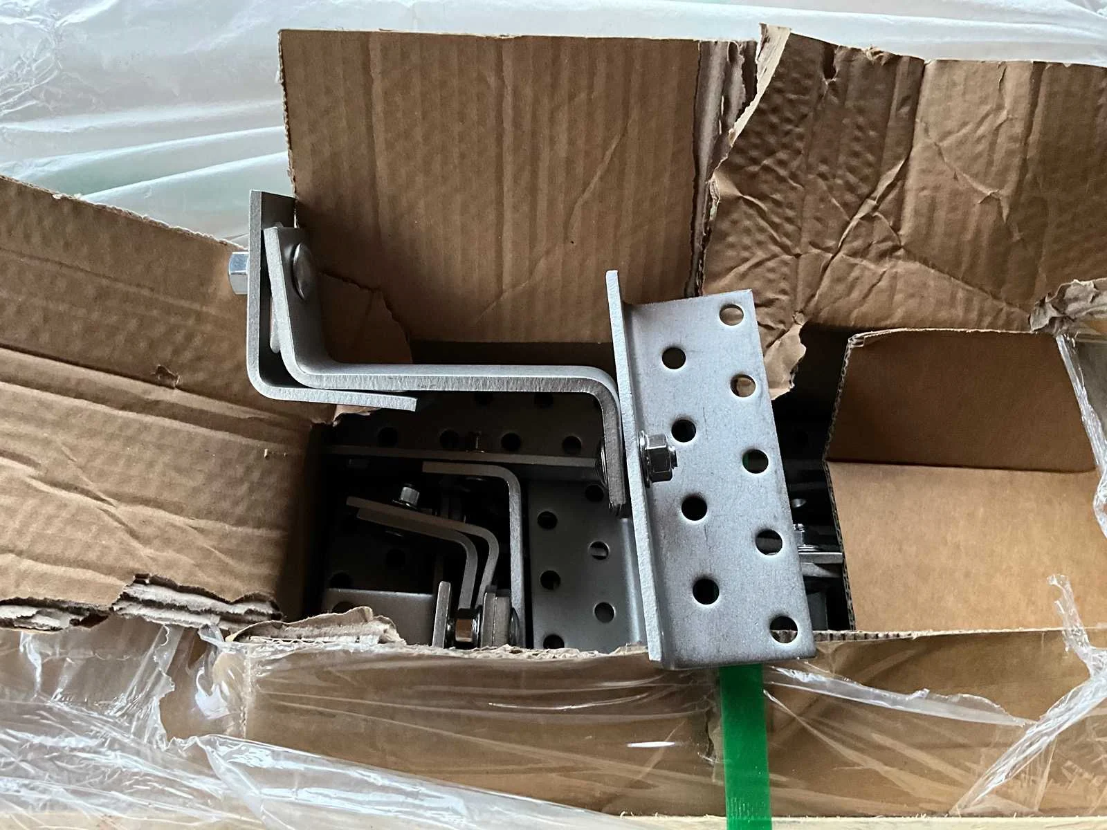 Ongebruikt nieuw in doos, RVS dakhaak t.b.v. montage zonnepanelen op schuine daken, dubbel verstelbaar No Eigen gewicht: 948kg Totale afmeting L: 1200mm Totale afmeting Breedte: 800mm Totale afmeting Hoogte: 1400mm