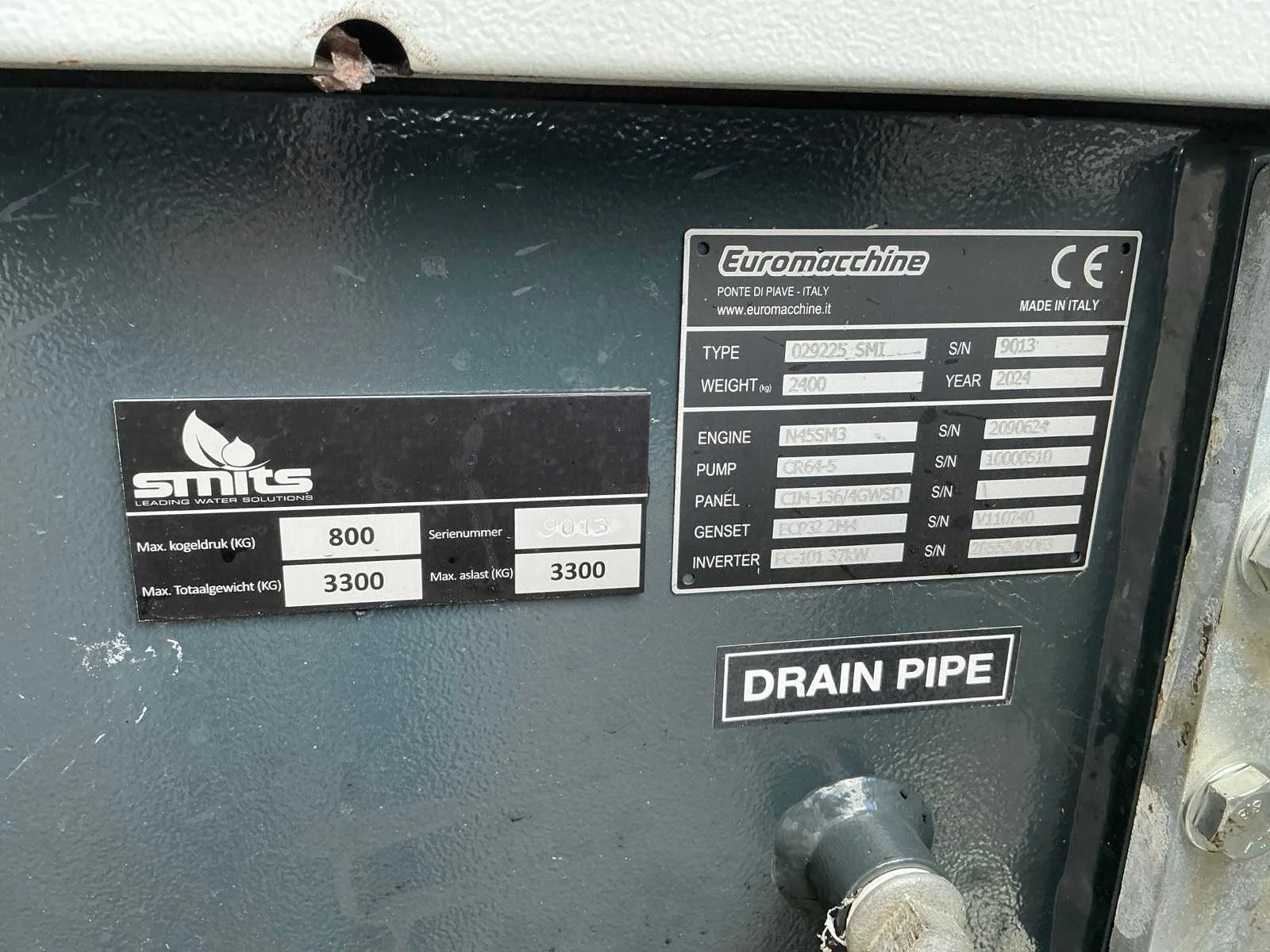 Voorzien van: Nederlands kenteken: LRR-87-H, Merk. Met 37kw electro motor, fabrikant Euromacchine (Italië), distributie door Smits, Type 029225 SML, Serienummer 9013, Bouwjaar 2024, Gewicht 2400 kg, Motor N45SM3 (FPT/Iveco 4-cilinder dieselmotor, ca. 74–110 kW Pomp CR64-5 (centrifugaalpomp, geschikt voor grote waterhoeveelheden), Paneel CIM-136/4G/WSD (besturingspaneel met monitoring), Aggregaat (genset) ECP2 2M4 (generator, stroomvoorziening voor besturing en accessoires), Inverter FC-101 37 kW (frequentieregelaar voor toerentalregeling), Max. kogeldruk 800 kg, Max. totaalgewicht 3300 kg, Max. aslast 3300 kg. No Merk: Euromacchine Type: 029225_SMI Bouwjaar: 2024 Serienummer: 9013 Motorvermogen (kW): 110kW Afgelezen urenstand: 548 Eigen gewicht: 2400kg Totale afmeting L: 4600mm Totale afmeting Breedte: 1700mm Totale afmeting Hoogte: 2800mm