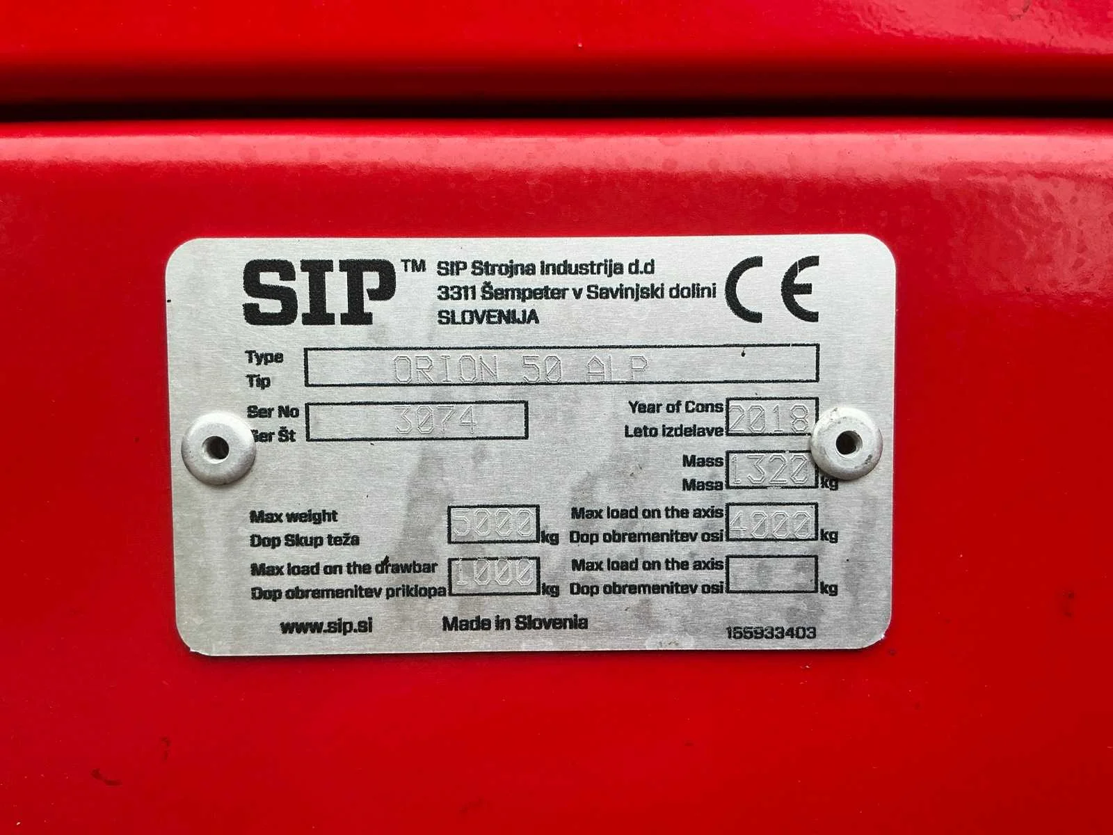 Bak: 330x170cm, voorste scherm kan verwijderd worden voor transport. Boekjes aanwezig. Nee Merk: SIP Type: Orion 50 ALP Bouwjaar: 2018 Serienummer: 3074 Werkbreedte: 5000mm Eigen gewicht: 1320kg Totale afmeting L: 4800mm Totale afmeting Breedte: 2500mm Totale afmeting Hoogte: 1900mm