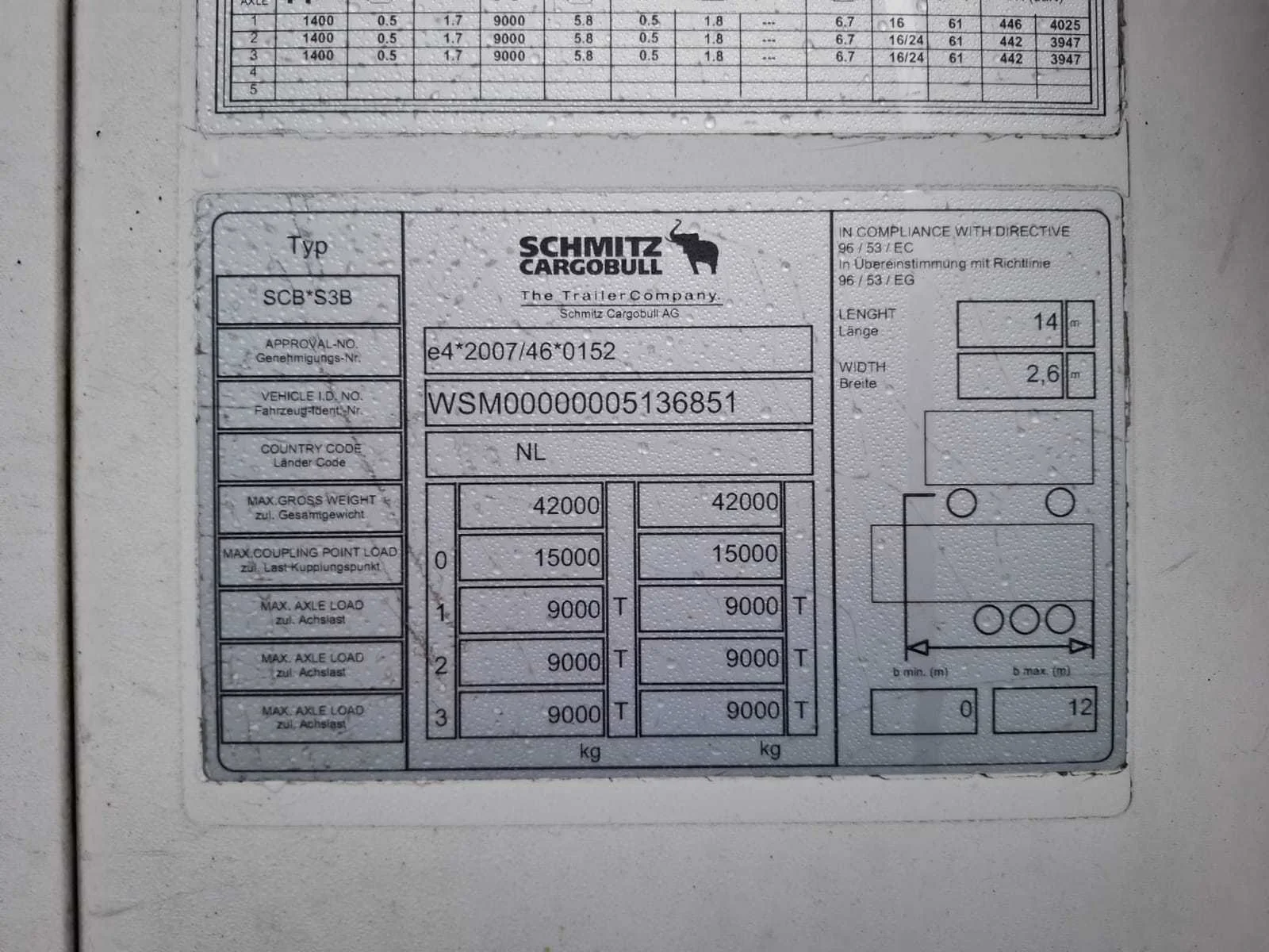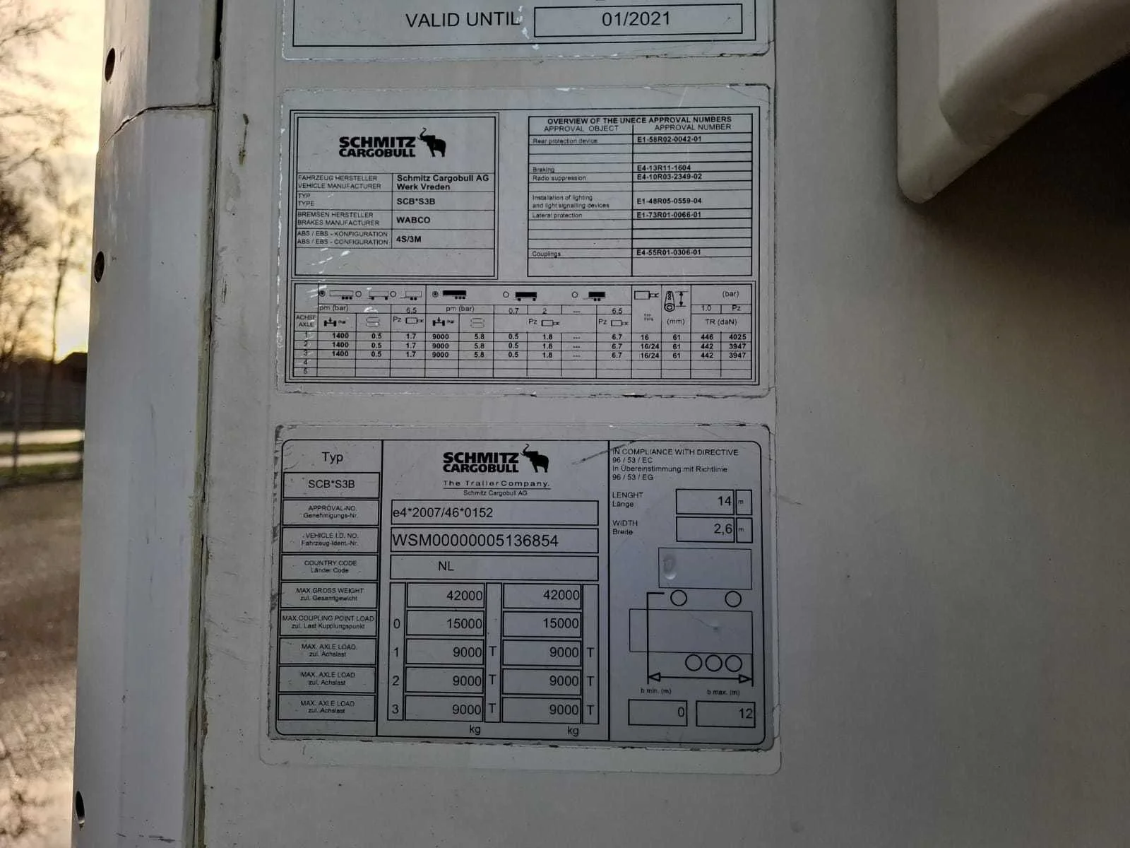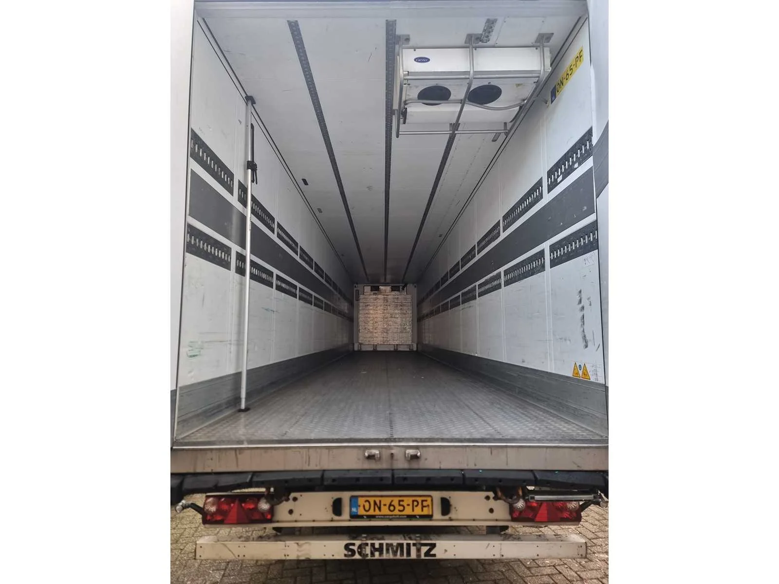 CARRIER Vector 1950 met dubbele verdamper Nee Merk: Schmitz Cargobull Type: SCB*S3B Type aanhangwagencarrosserie: Gesloten aanhangwagen Bouwjaar: 2015 Chassisnummer VIN: WSM00000005136854 Kenteken: ON-65-PF Datum eerste toelating (NL): 16-02-2015 Datum eerste toelating: 16-02-2015 APK vervaldatum: 14-09-2025 Aantal assen: 3 Laadvermogen: 31000kg Koeltrailer: true Eigen gewicht: 9163kg Totale afmeting L: 14040mm Totale afmeting Breedte: 2600mm Totale afmeting Hoogte: 4000mm