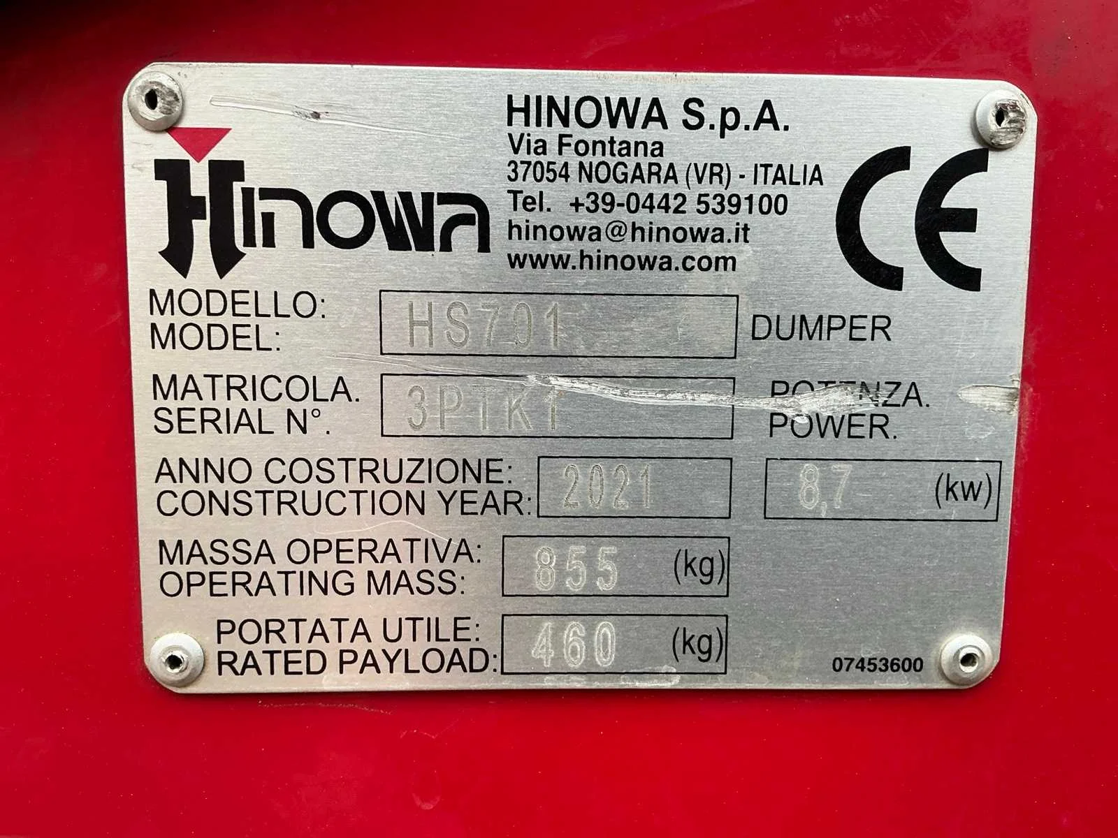 Voorzien van: hydraulisch verstelbare rupsbanden, Honda motor, hoogte verstelbare kipper, rupsbanden, handbediening, opraapbak Nee Merk: Hinowa Type: HS701 Serienummer: 3PTK1 Bouwjaar: 2021 Merk motor: Honda Motorvermogen (kW): 8.7kW Brandstof: Benzine Bedrijfsgewicht: 855kg Laadvermogen: 460kg Afgelezen urenstand: 882 Eigen gewicht: 855kg Totale afmeting L: 2200mm Totale afmeting Breedte: 750mm Totale afmeting Hoogte: 1900mm