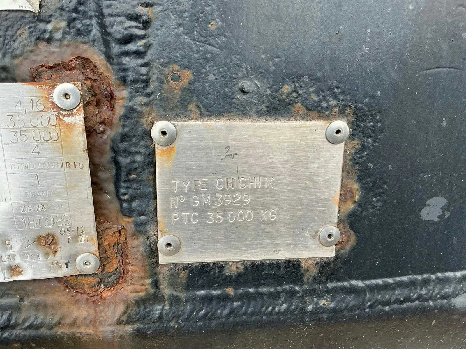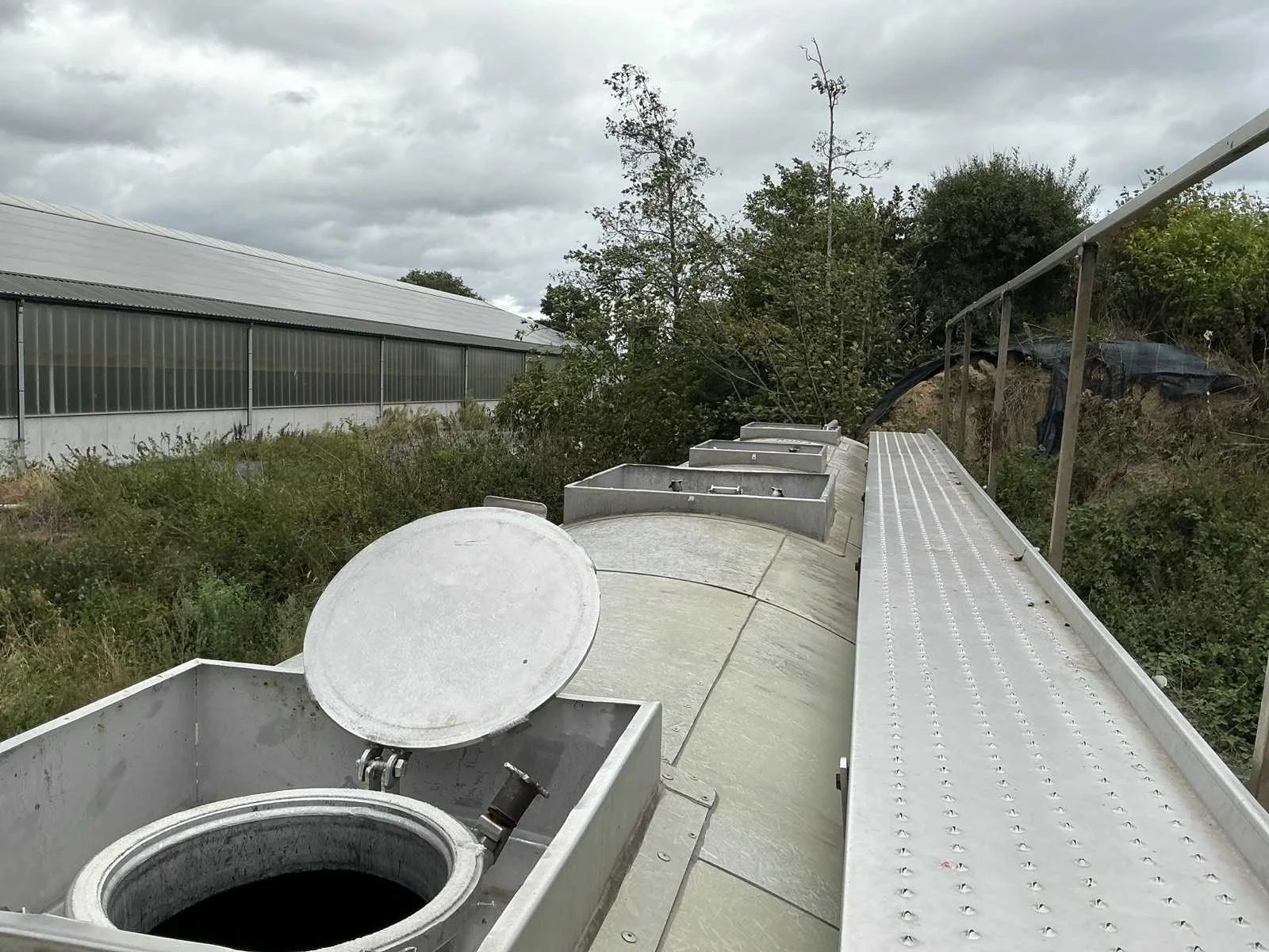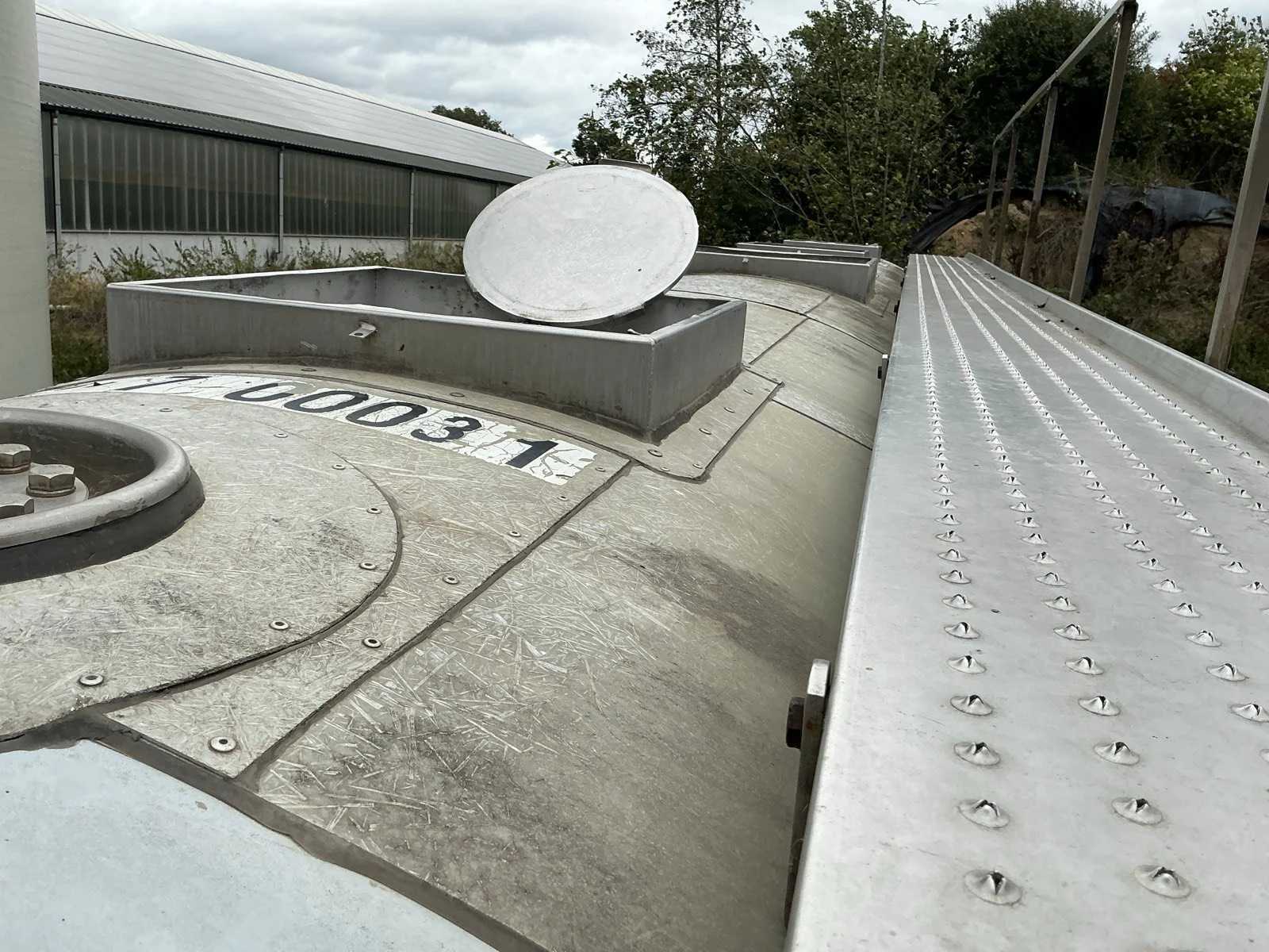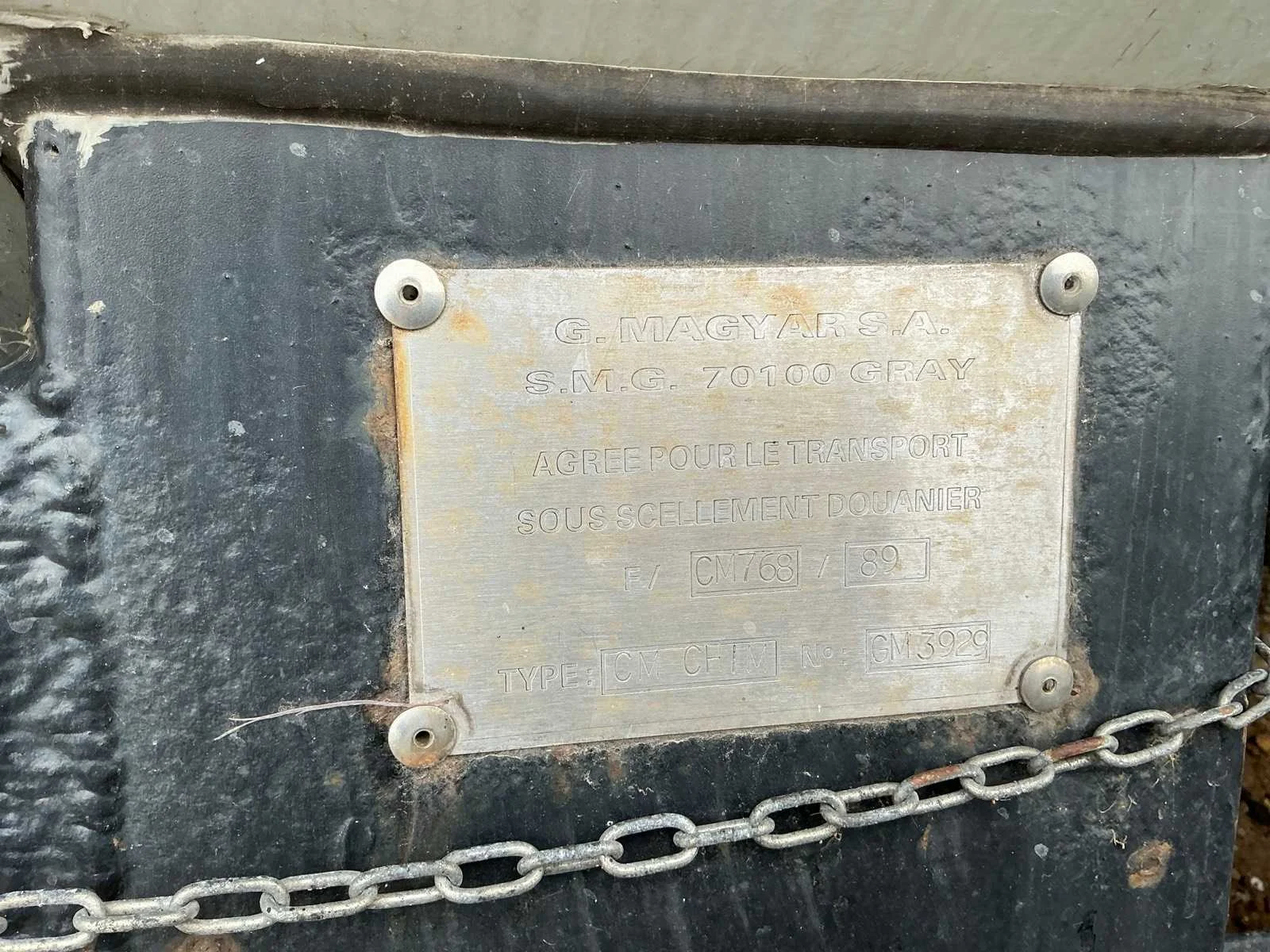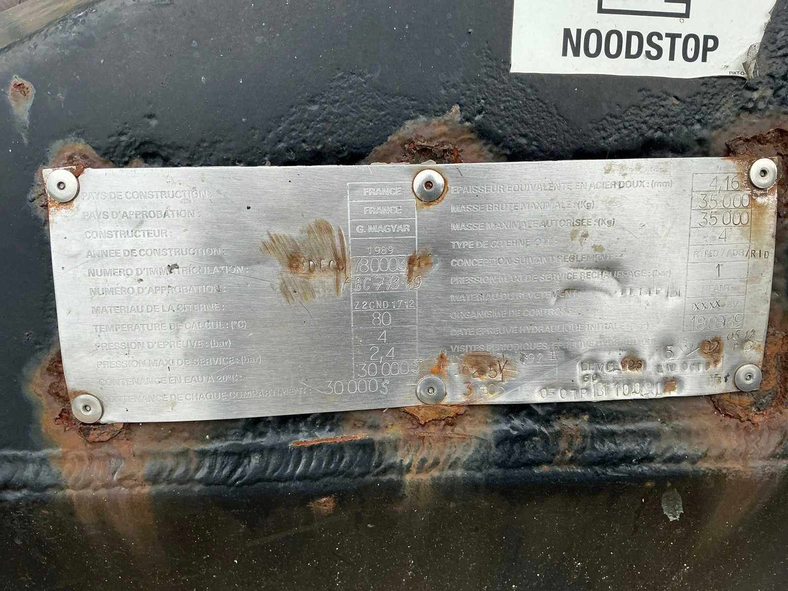 Voorzien van: De G. Magyar S.A. tankoplegger uit 1989 (type CHM) is uitgevoerd in RVS (polyester buitenkant, geheel van RVS)met een tankinhoud van 30.000 liter 4 compartimenten, een maximale massa van 35.000 kg, een leeggewicht van 10.000 kg, een werkdruk van 1 bar, een testdruk van 2,4 bar, een ontwerpdruk van 4 bar, een rekentemperatuur van 80 °C en een wanddikte van 4,16 mm. Nee Merk: G.Magyar Type: CM768 Bouwjaar: 1989 Serienummer: GM3929 Tankinhoud: 30m³ Met onderstel: true Luchtdrukwisselsysteem: true Eigen gewicht: 10000kg Totale afmeting L: 11000mm Totale afmeting Breedte: 2550mm Totale afmeting Hoogte: 3600mm