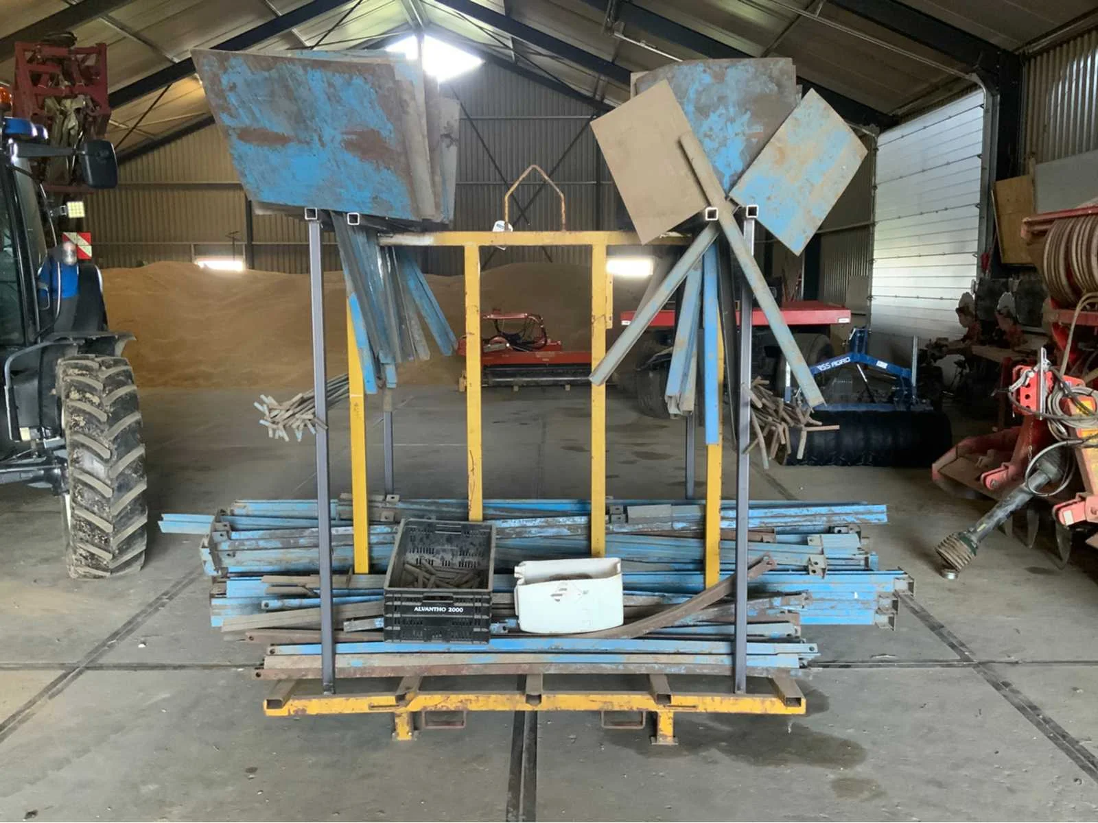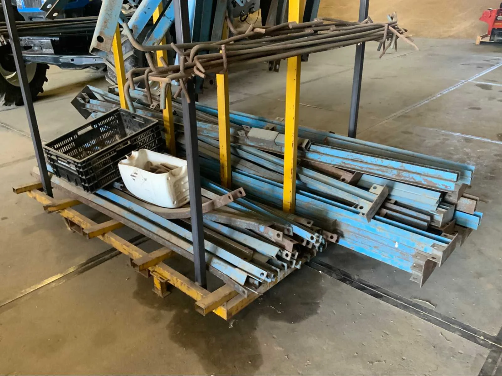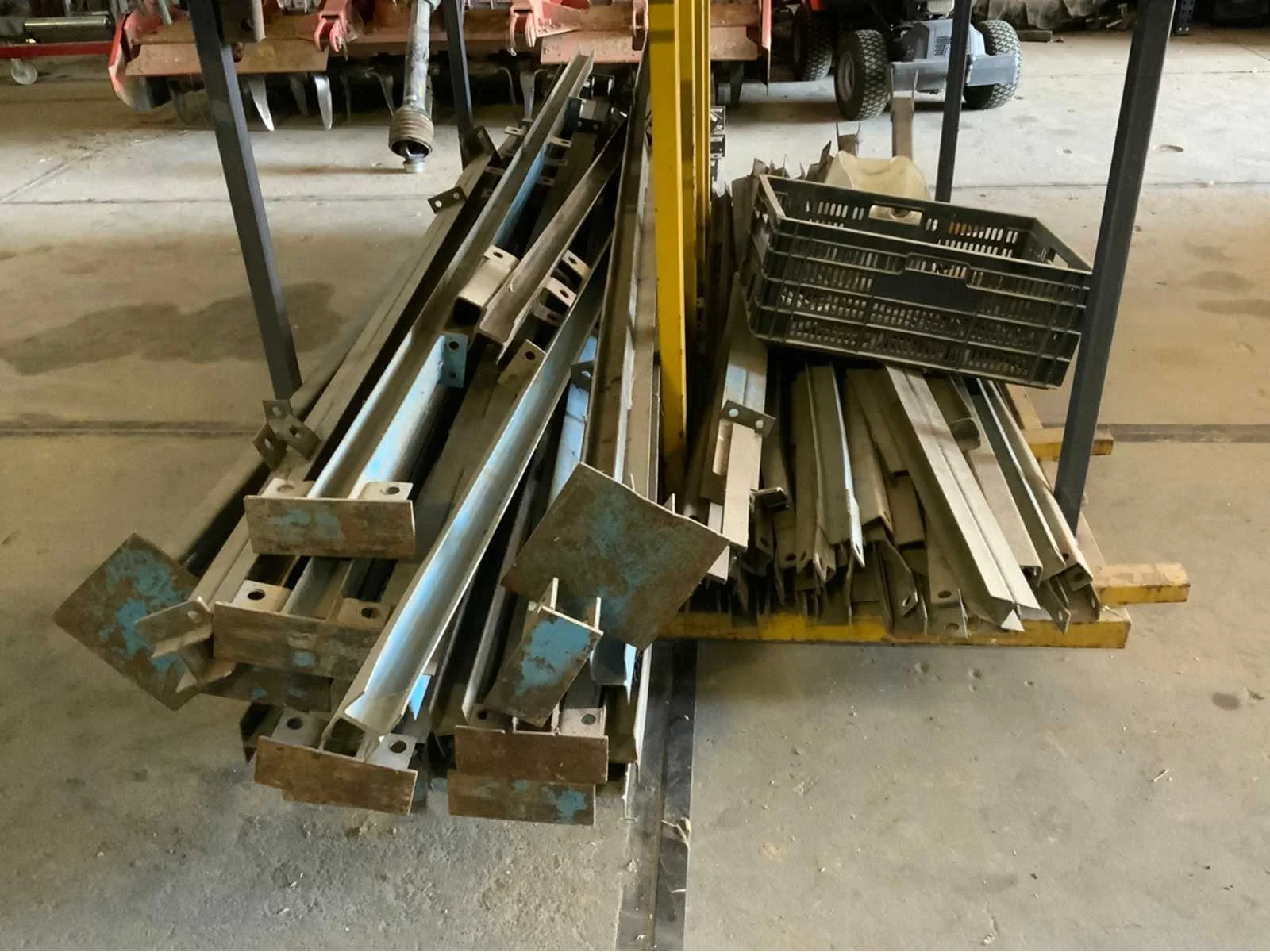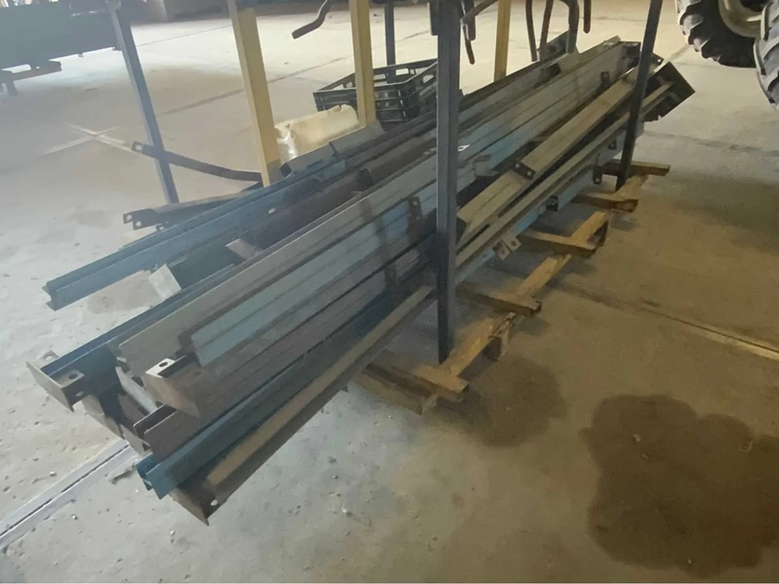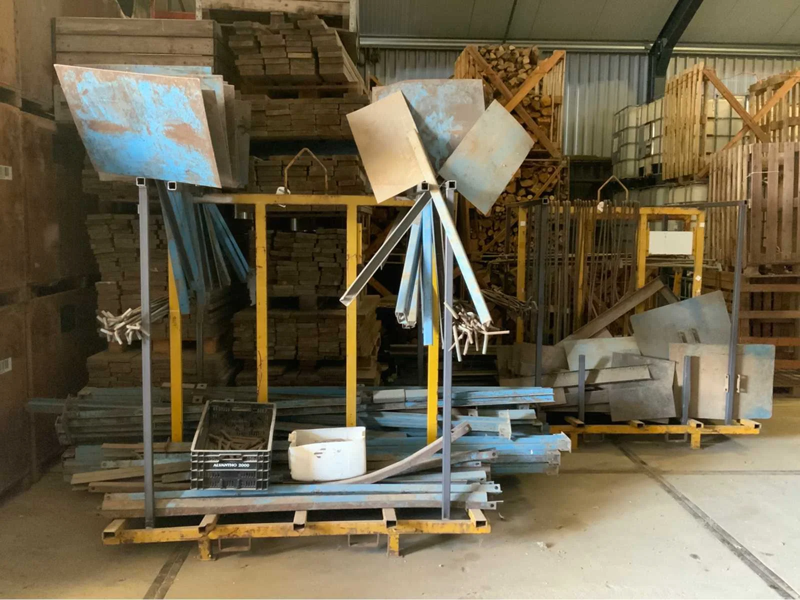 Bestaande uit 2 verbouwd glasbokken met staanders, voetplaten, schoorstangen en keerwanden, 9 pallets met keerwand planken, 2 hoeken, diverse lengte planken tot circa 180cm, planken gesorteerd op lengte met kleur. Nee